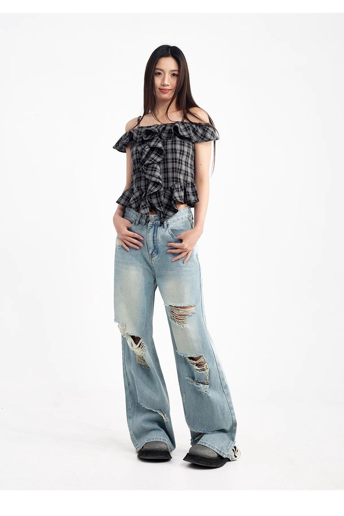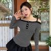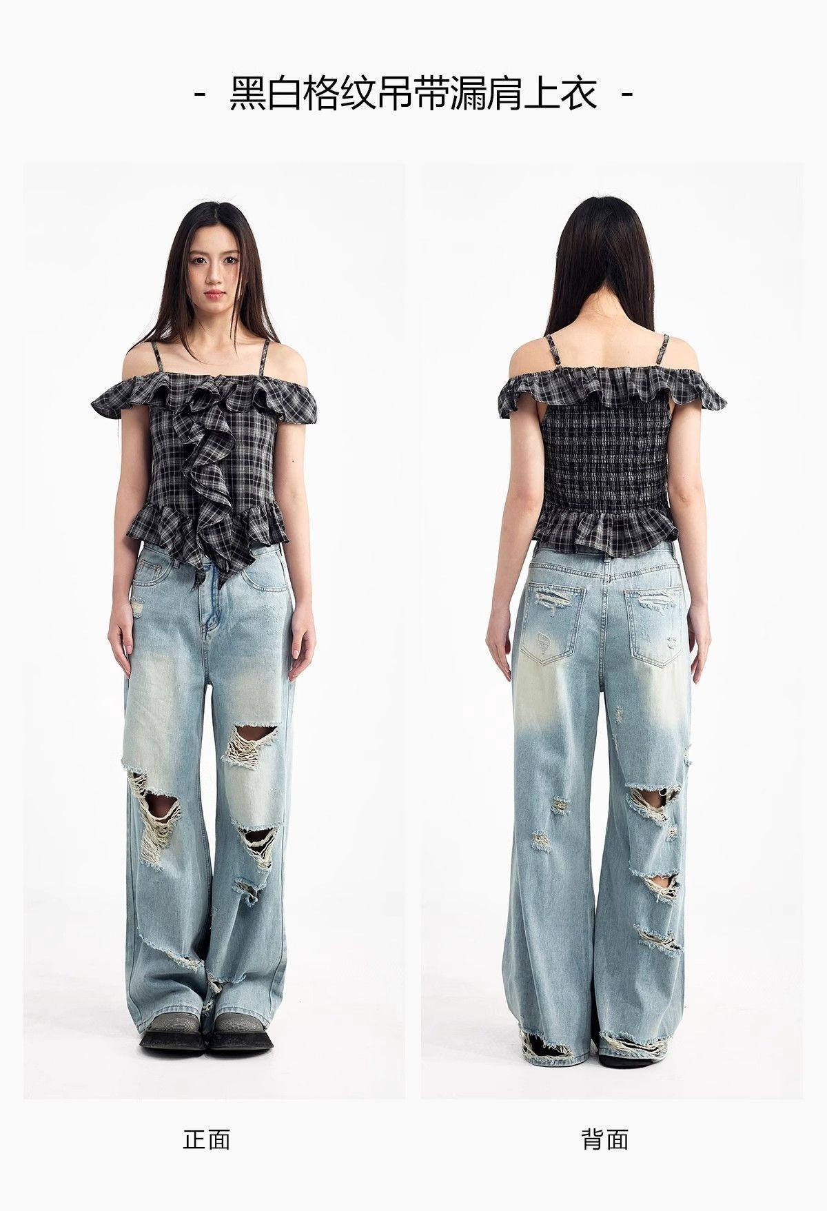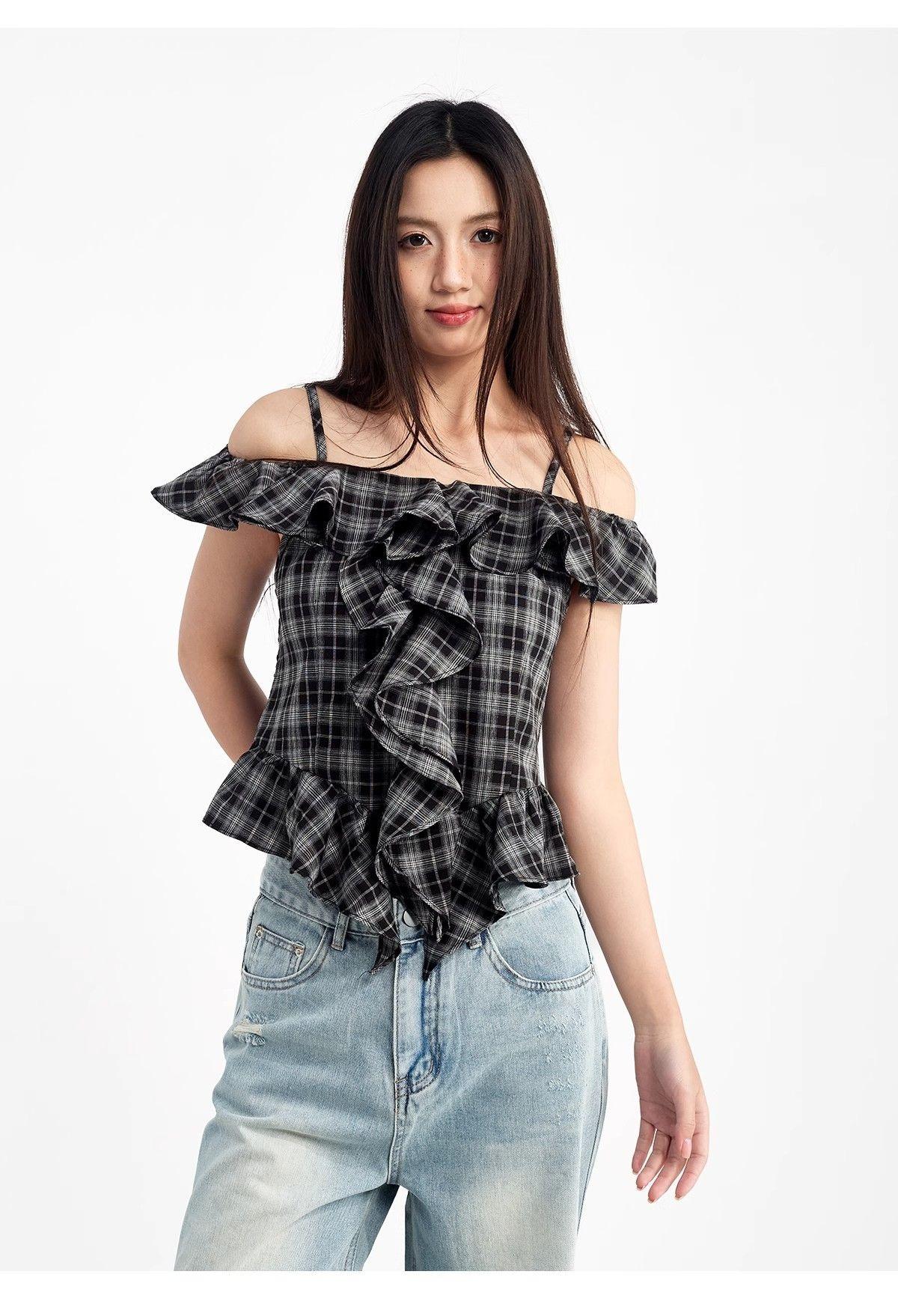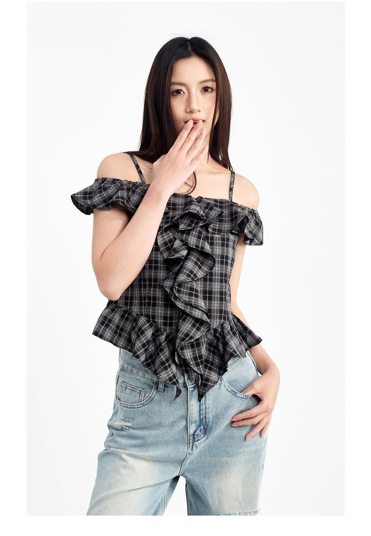 Comercio transfronterizo verano nuevo camisola a cuadros blanco y negro top hombros descubiertos camiseta de mujer blusa con adorno de volantes