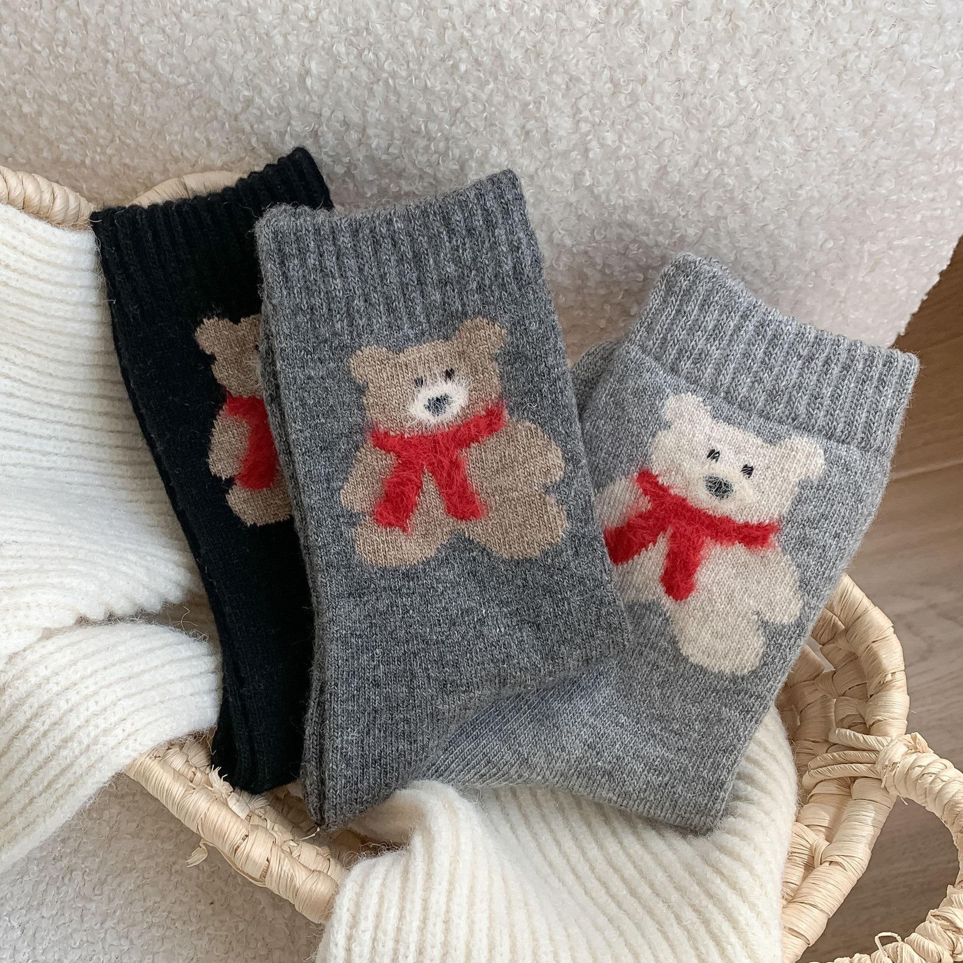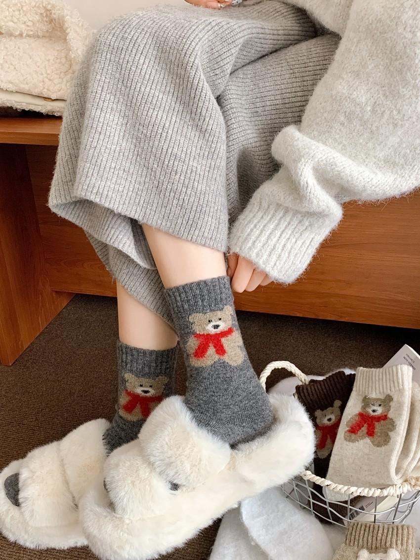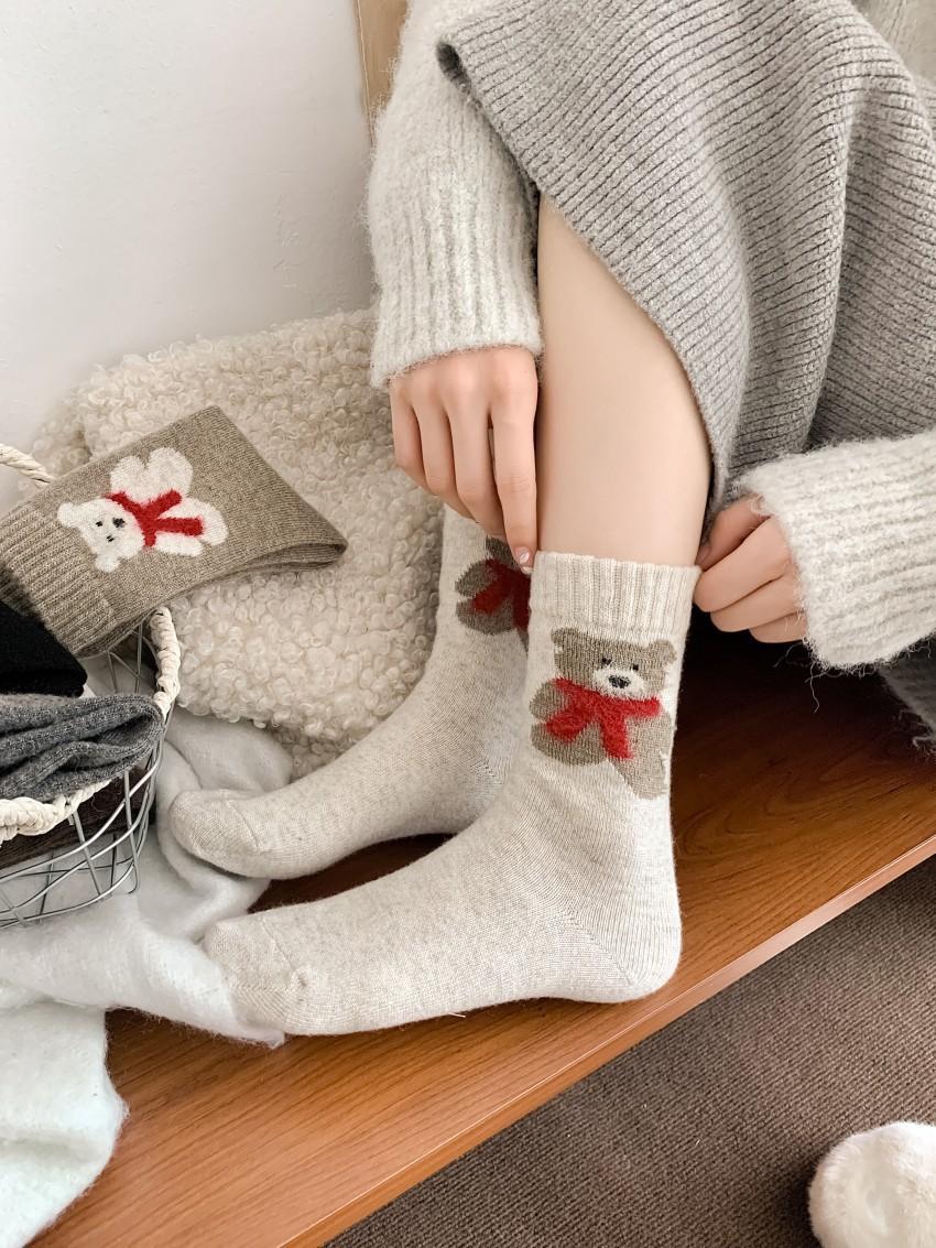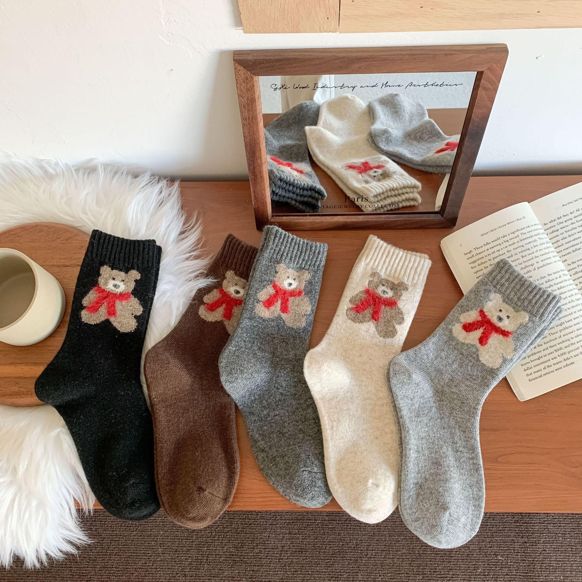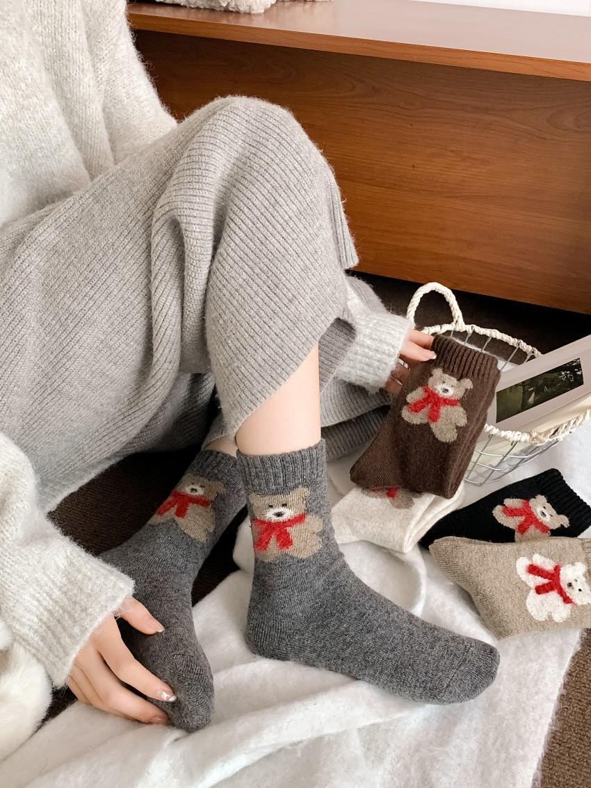 Calcetines de lana para mujer, gruesos, cálidos, de invierno, gruesos, grises, con forma de tubo, estilo japonés, vintage, con bufanda de oso, bonitos calcetines para mujer