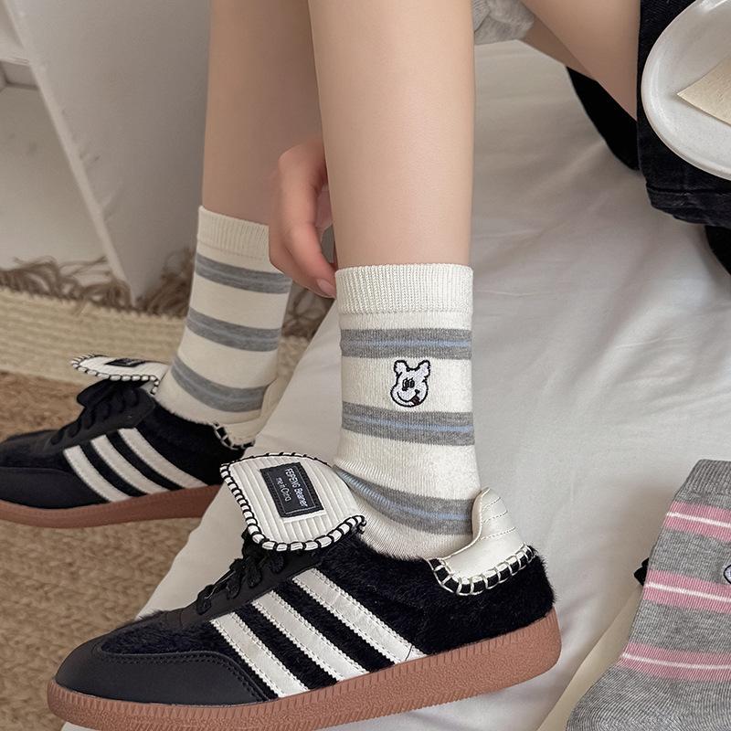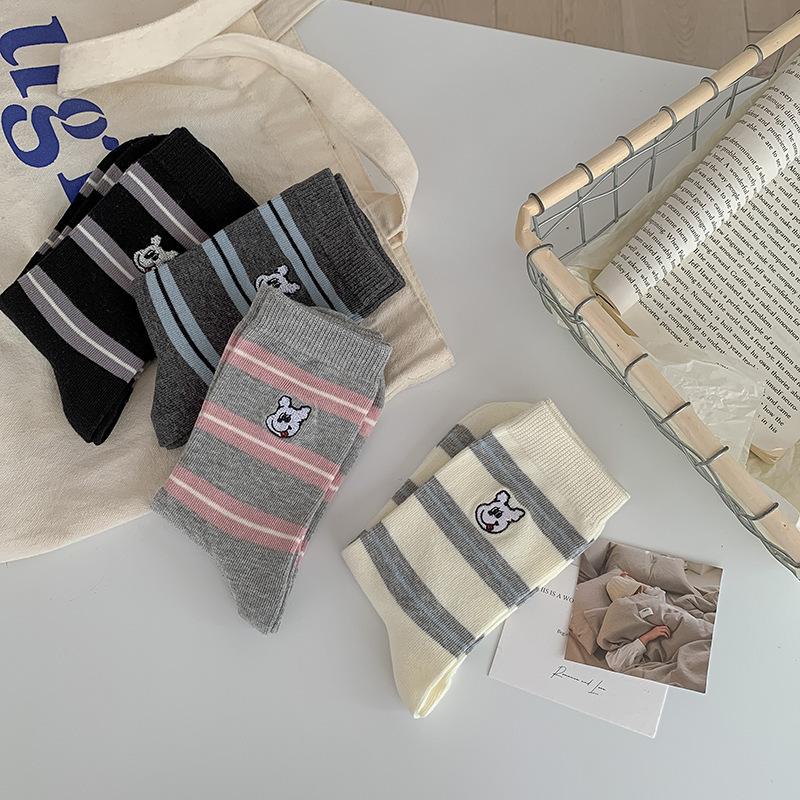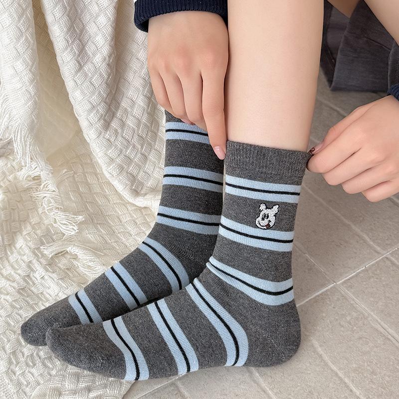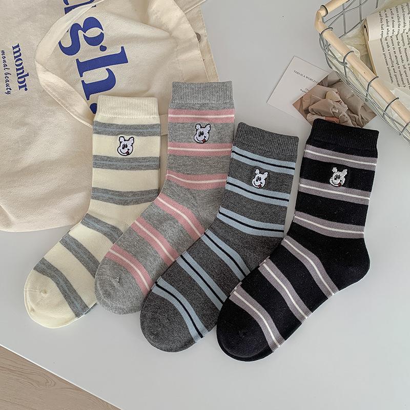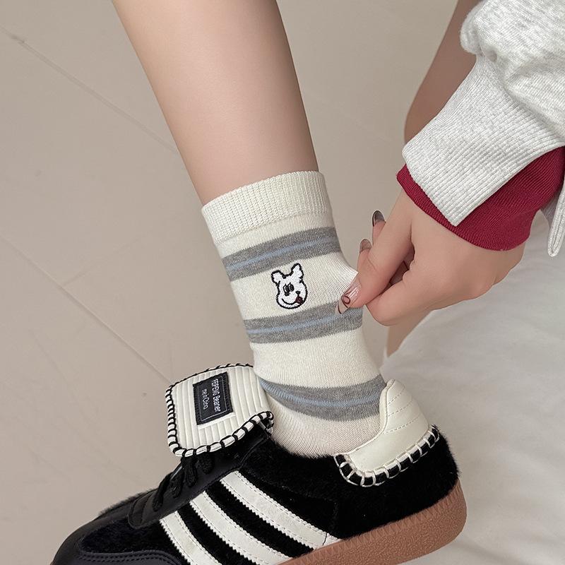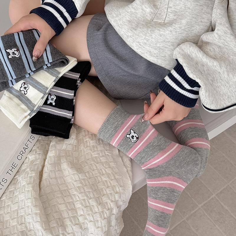 Estilo otoño e invierno calcetines de media caña para mujer estilo coreano calcetines largos versátiles ins versión coreana calcetines gruesos a rayas bordado cachorro de dibujos animados