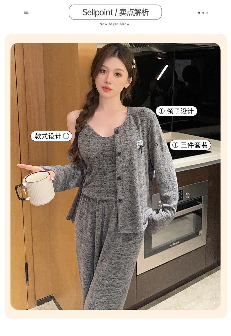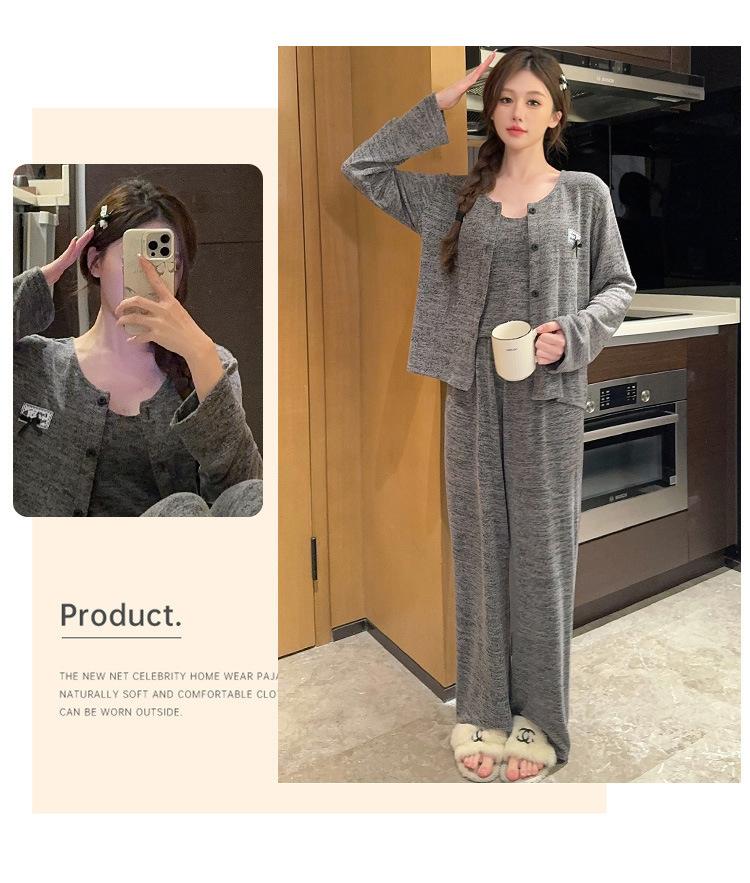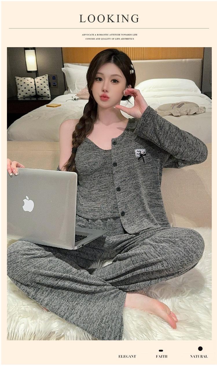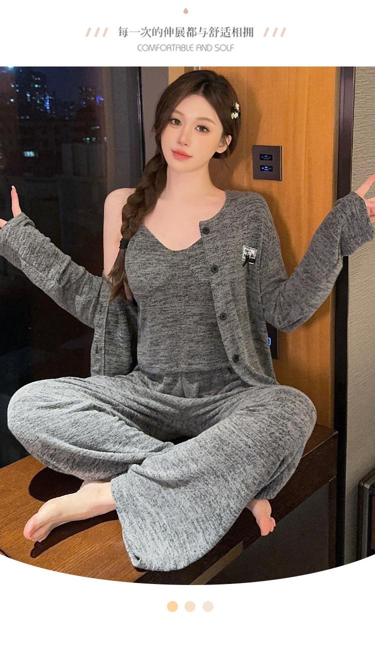 Conjunto de pijama de tres piezas de chaleco de algodón y cachemira de color para mujer, otoño e invierno, gris oscuro, casual, manga larga, pantalón largo, ropa para el hogar con copas en el pecho