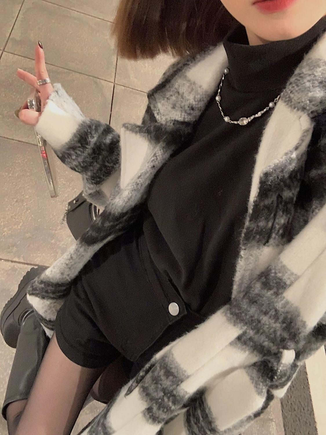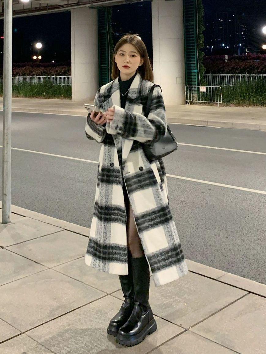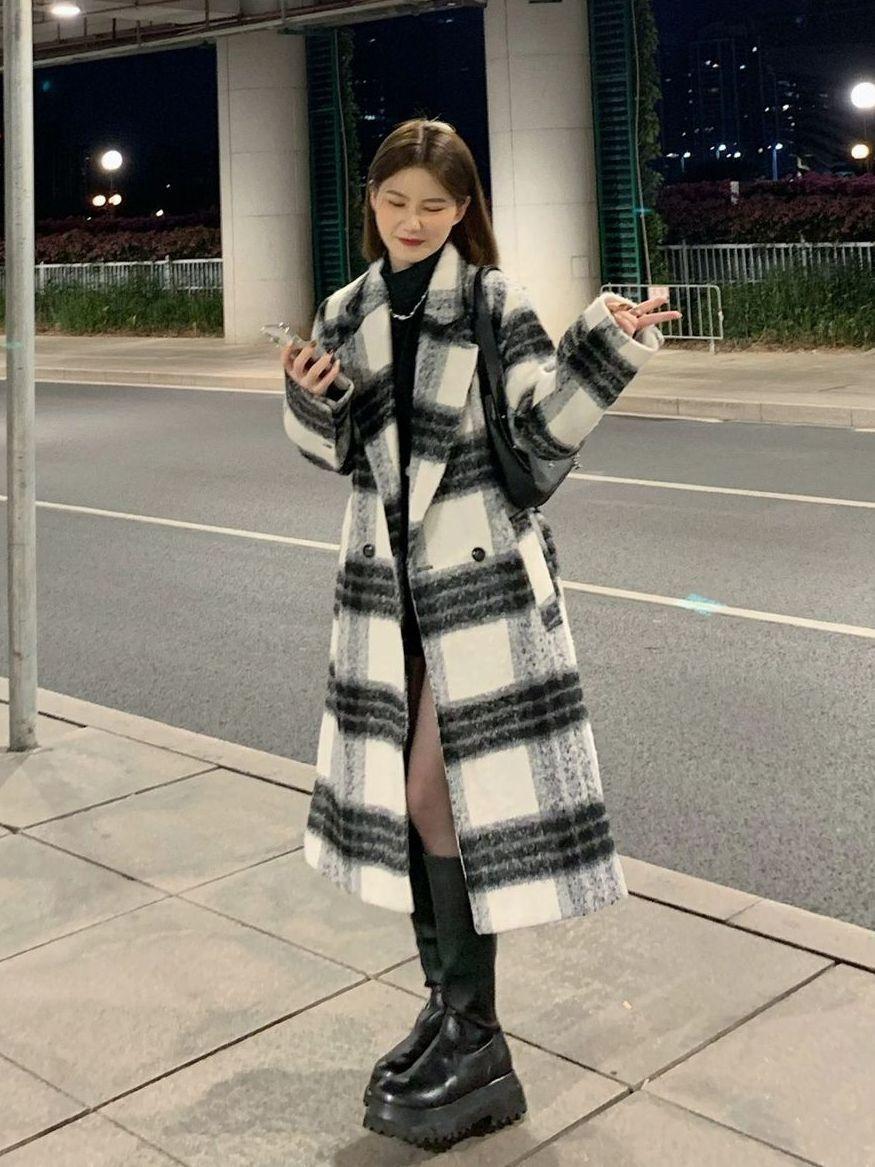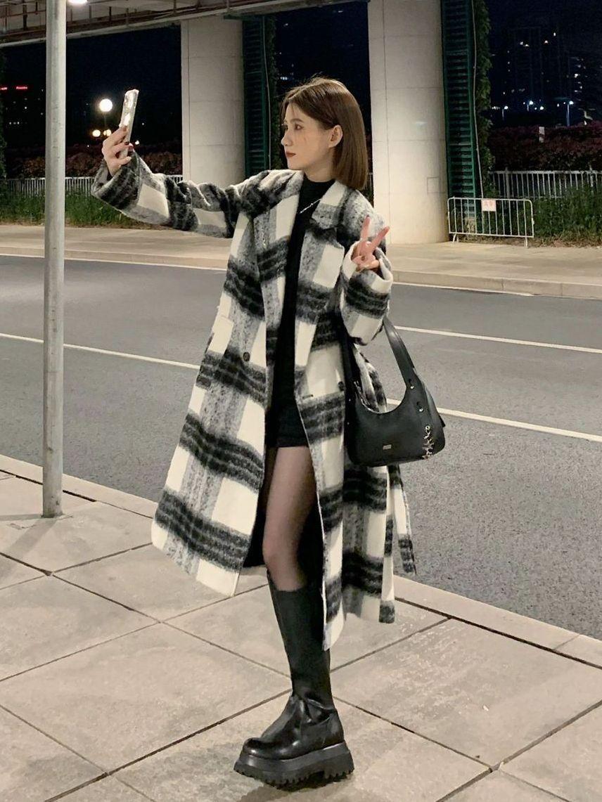 Abrigo de Lana a Cuadros para Mujer 2025 Otoño e Invierno Nuevo Estilo Hepburn de Alta Gama Estilo Coreano Holgado Elegante Abrigo de Lana Grueso