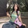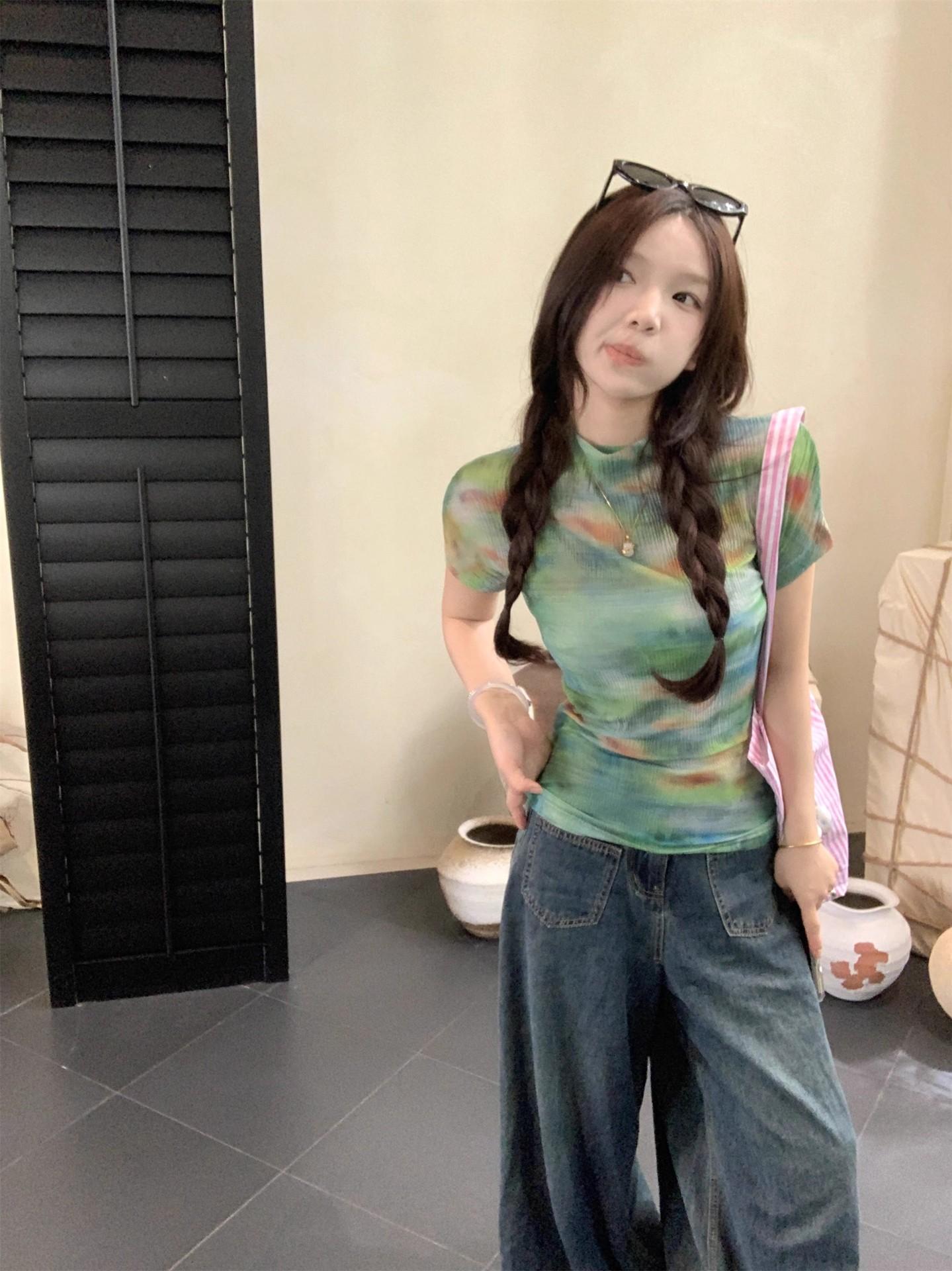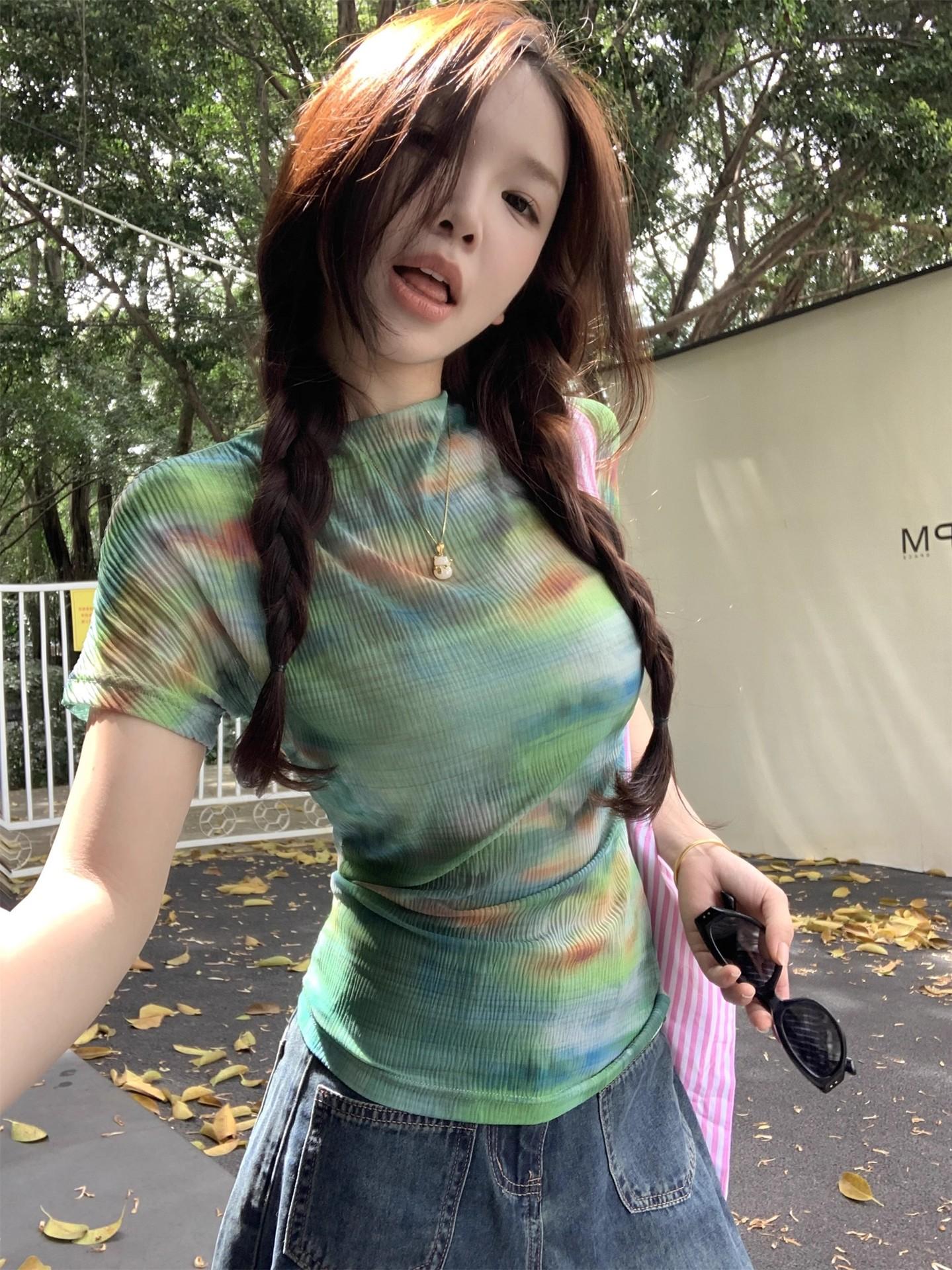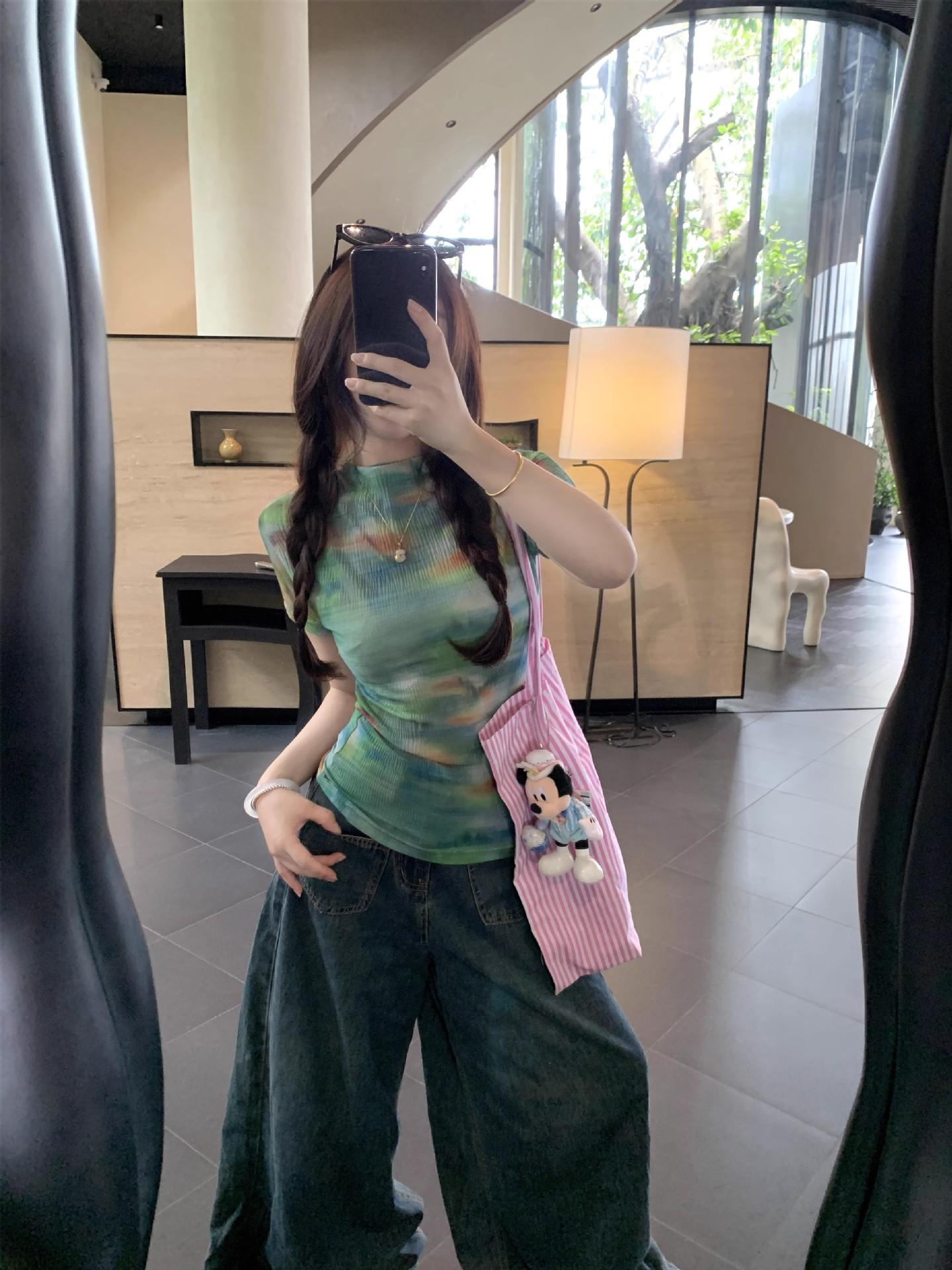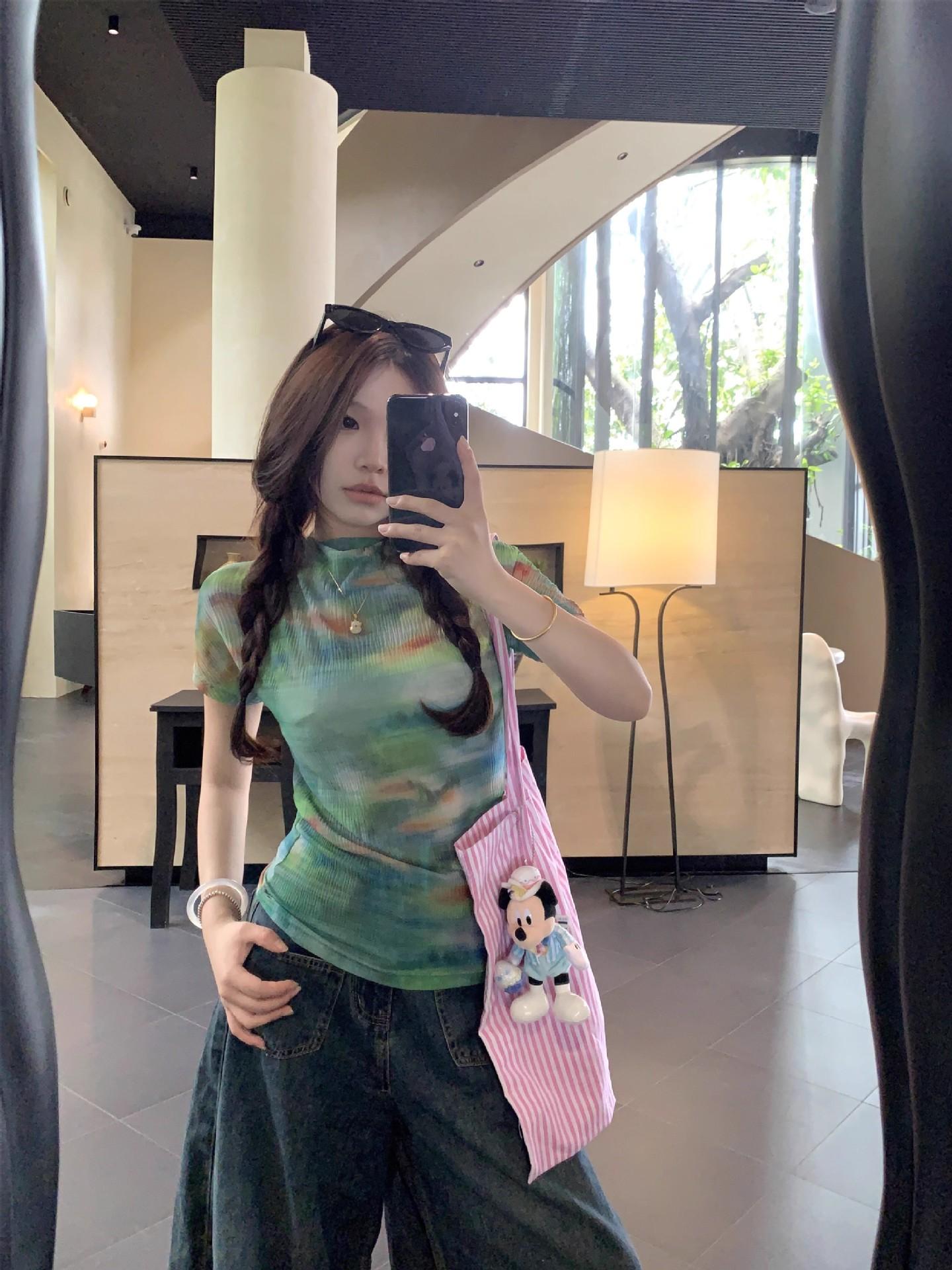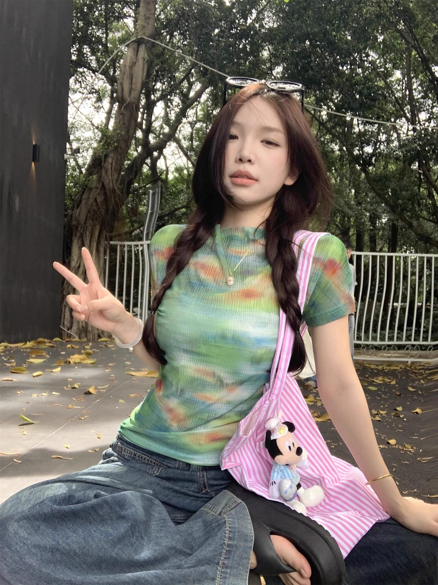 Camiseta de Manga Corta con Estampado Tie-dye Verde para Mujer Verano 2025 Nuevo Estilo Coreano Nicho Único Slim Chic Top