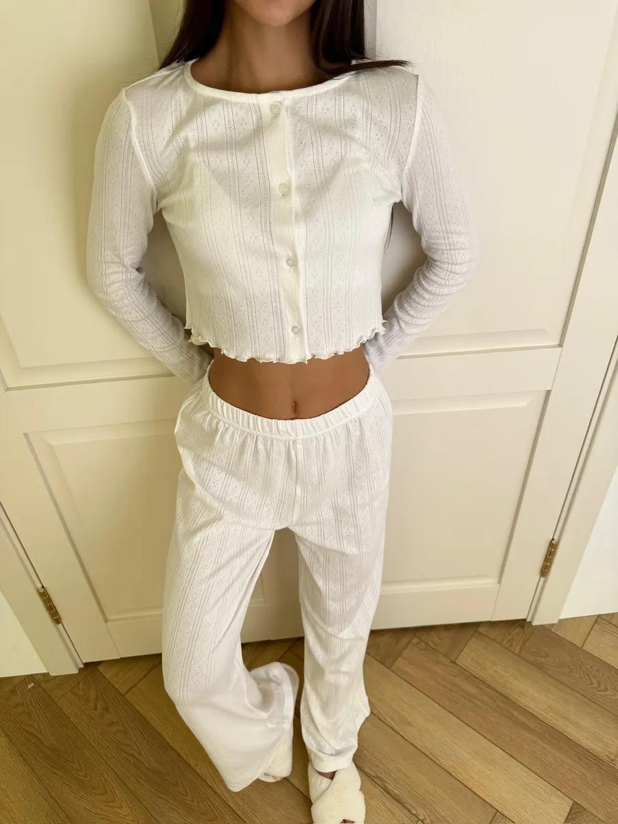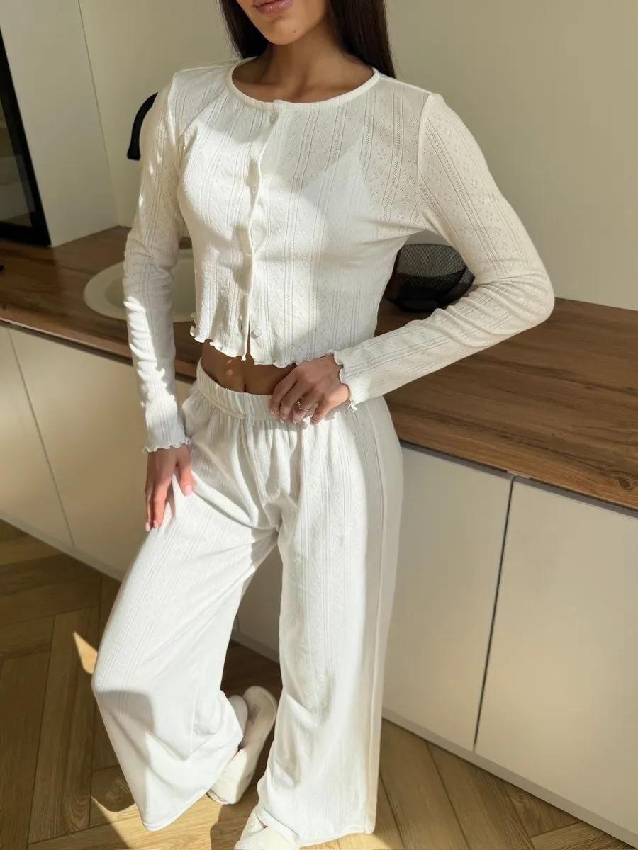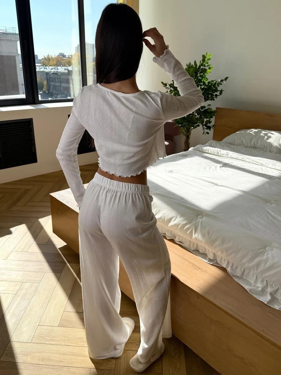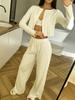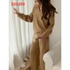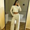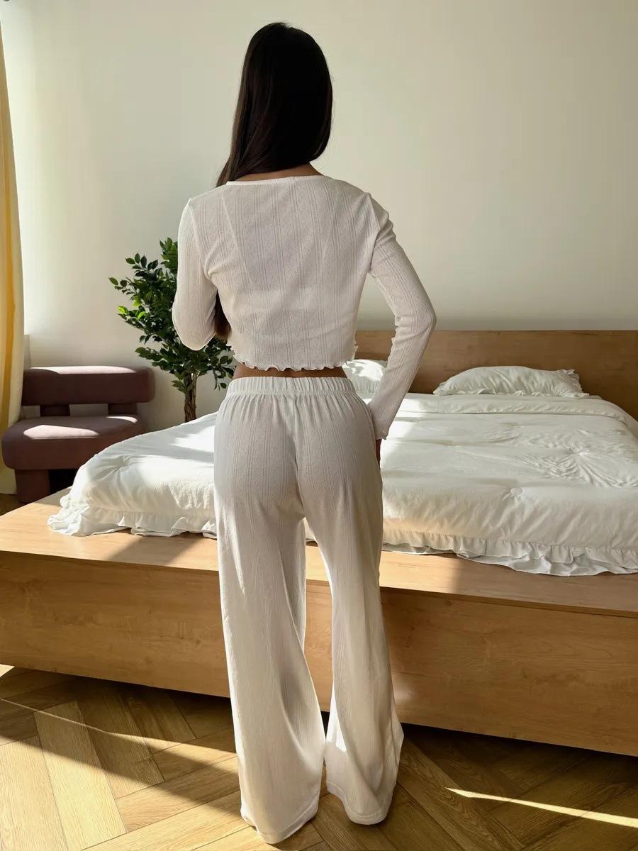 Moda Europea y Americana Conjunto Casual para Mujer Jacquard Adorno de Volantes Adelgazante Temperamento Hogar Cuello Redondo Manga Larga Pantalón Largo Conjunto de Dos Piezas