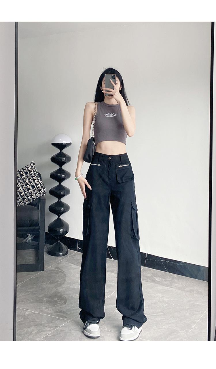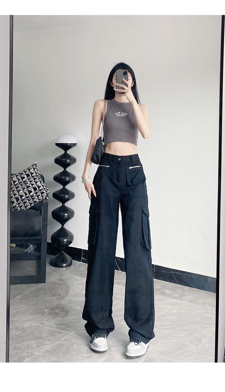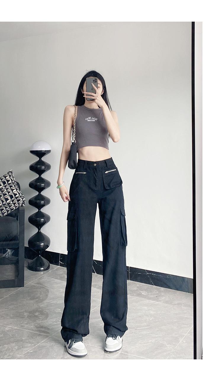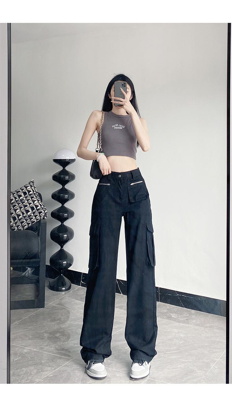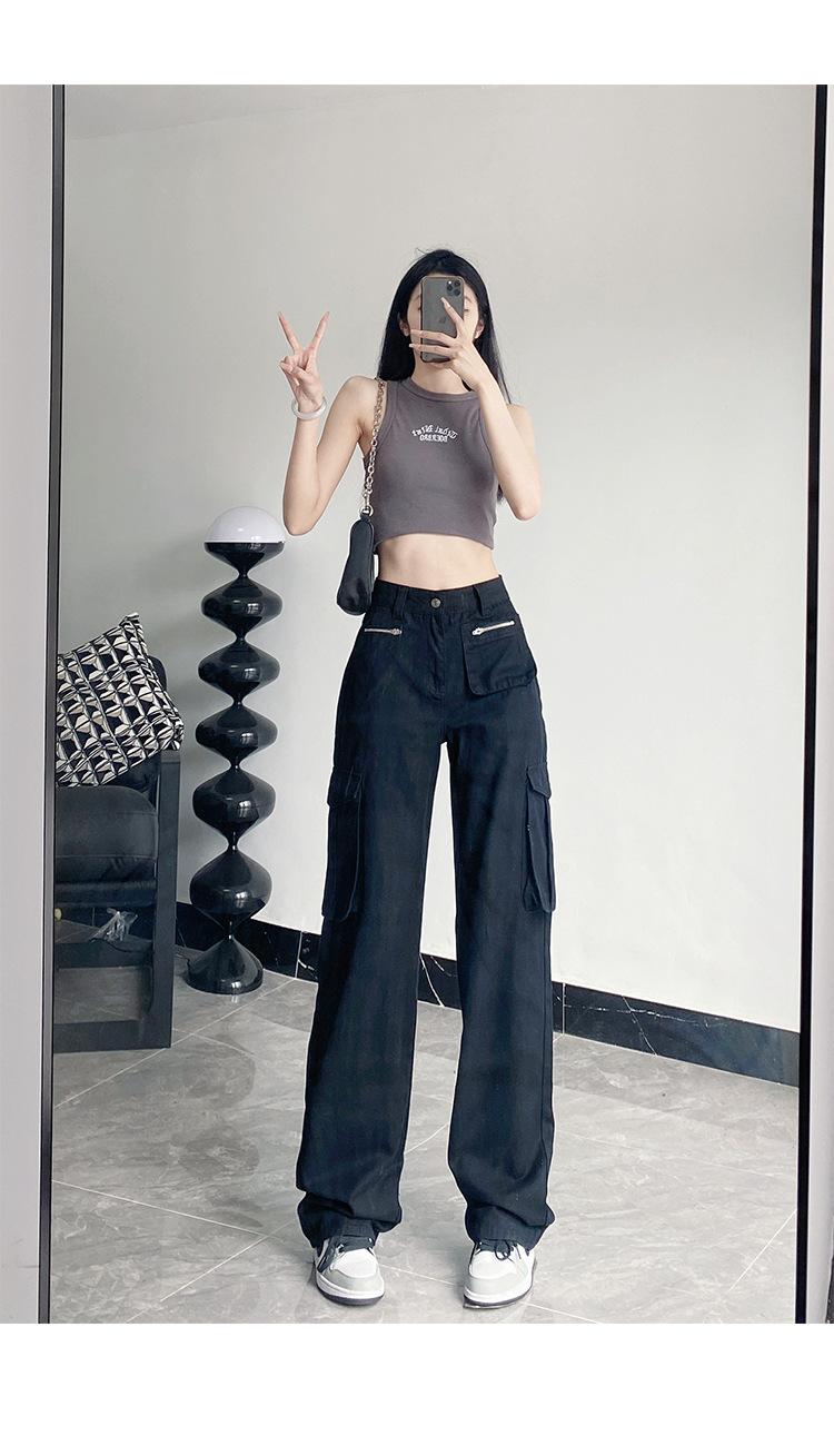 Pantalones Casuales de Primavera y Otoño Negros Altos Rectos Multibolsillos para Mujer Adelgazantes High Street Spice Girls Forrados Hasta el Piso
