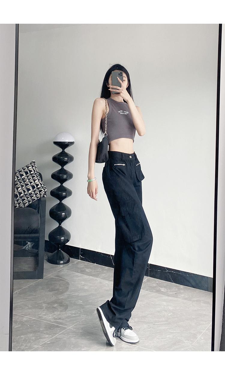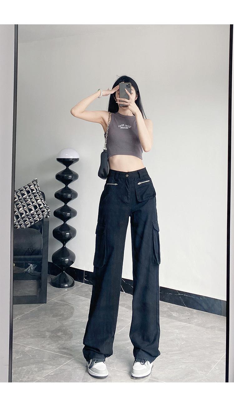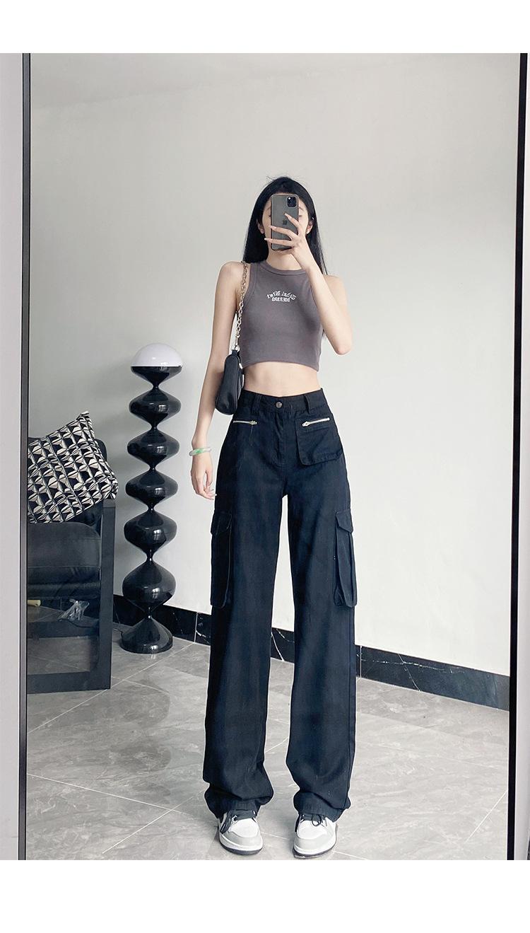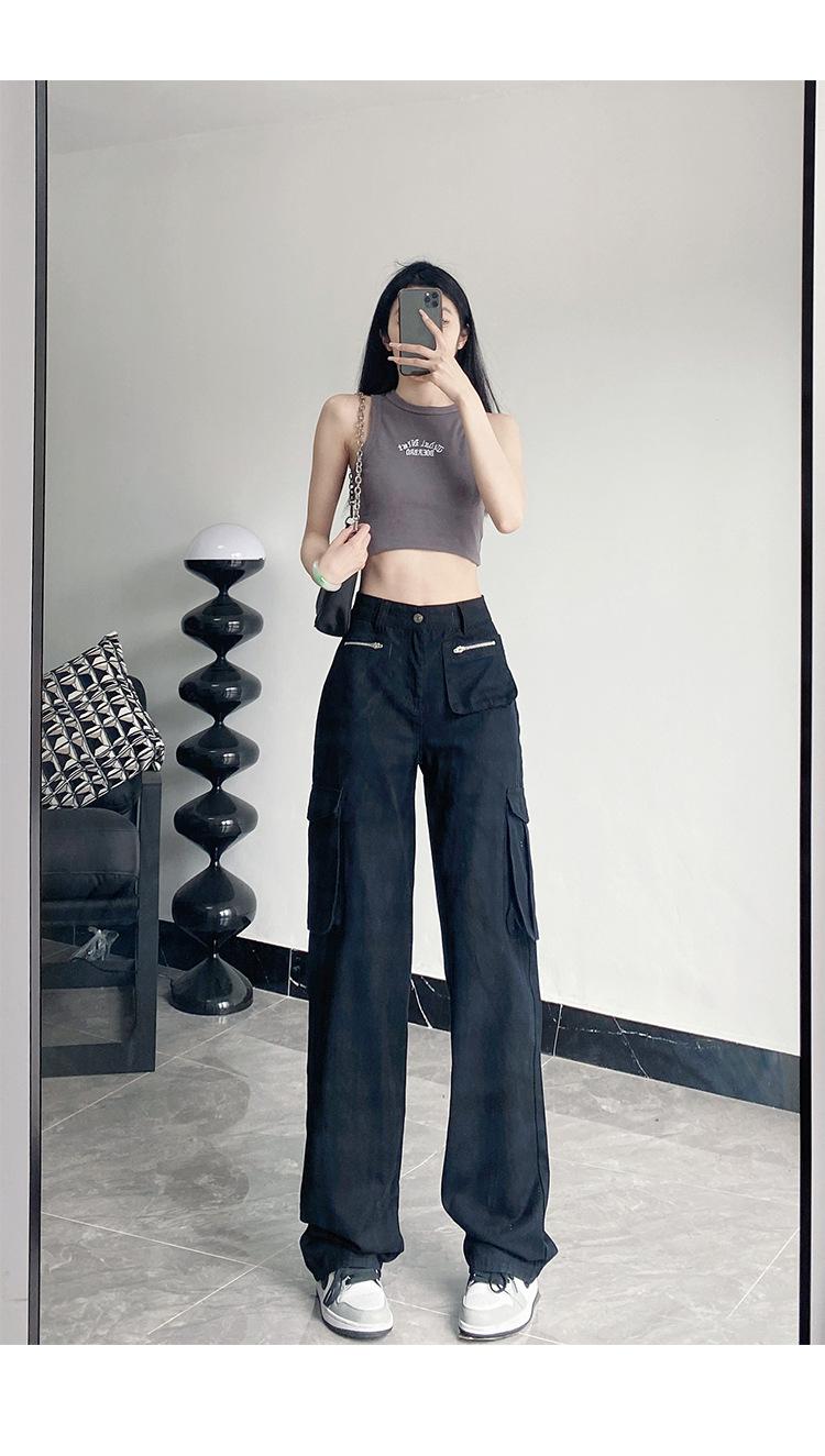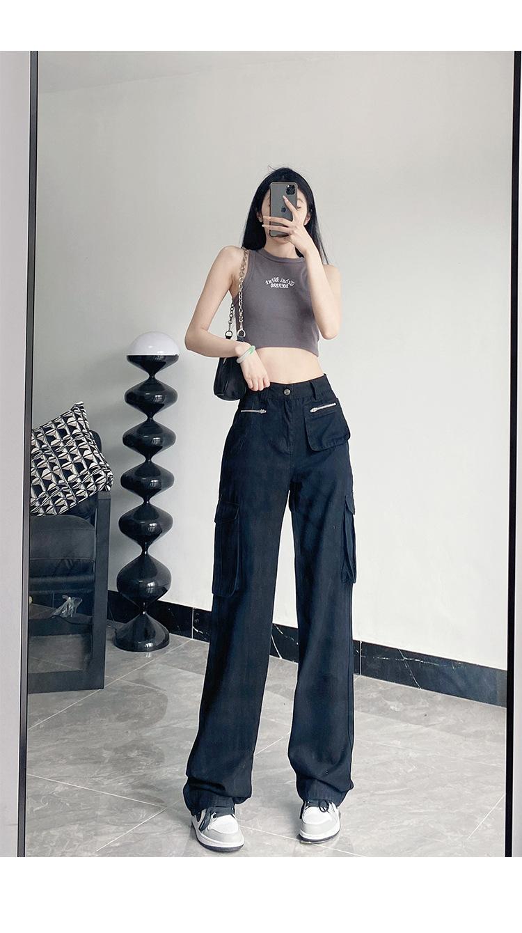 Pantalones Casuales de Primavera y Otoño Negros Altos Rectos Multibolsillos para Mujer Adelgazantes High Street Spice Girls Forrados Hasta el Piso