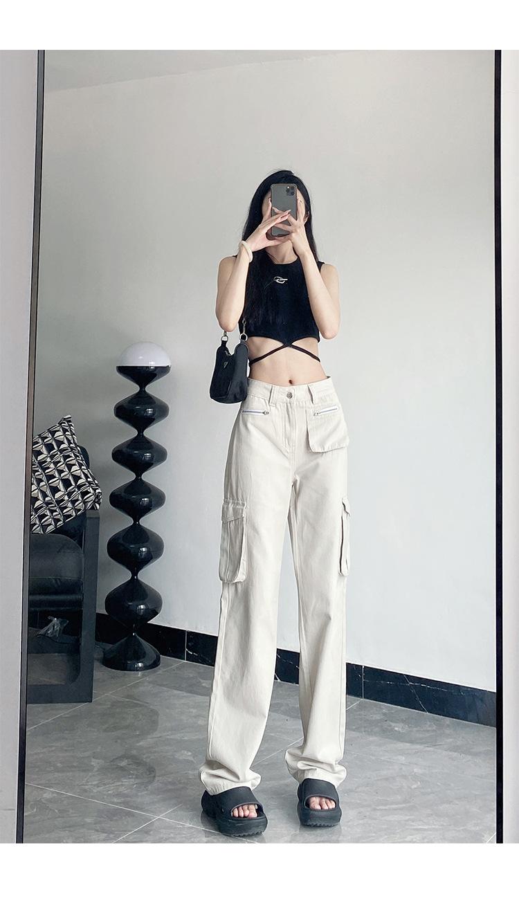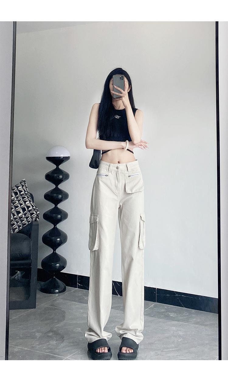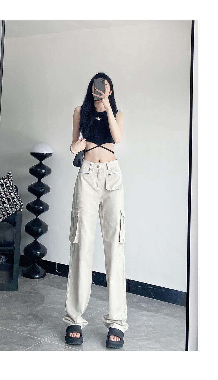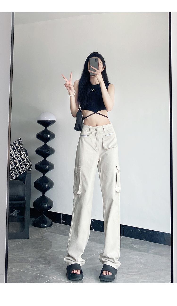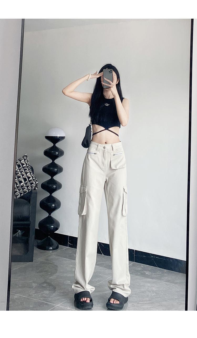 Pantalones Casuales de Primavera y Otoño Negros Altos Rectos Multibolsillos para Mujer Adelgazantes High Street Spice Girls Forrados Hasta el Piso
