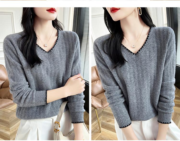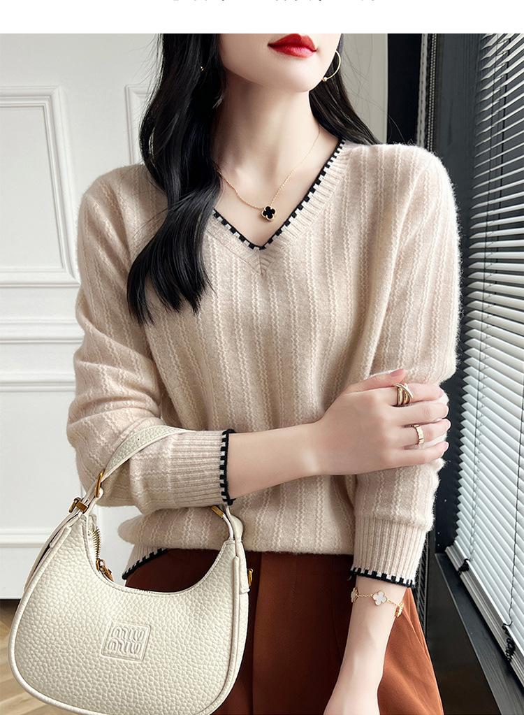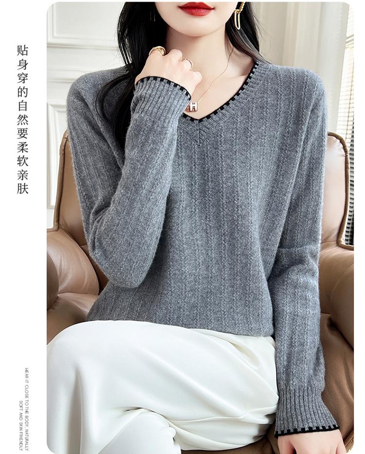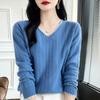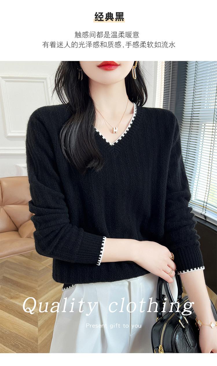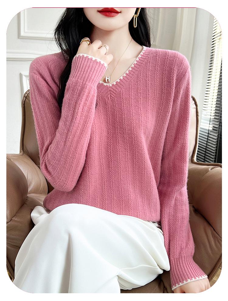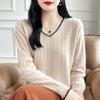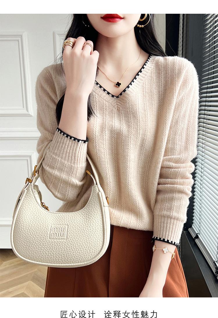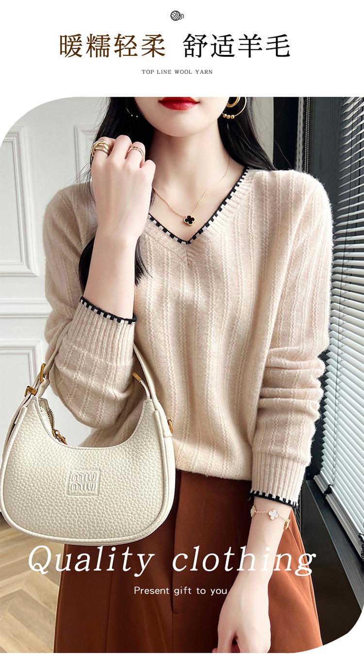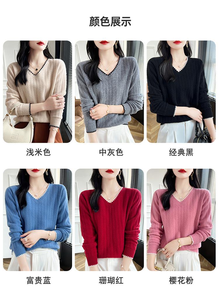 Otoño e invierno 2024 nuevo suéter sencillo de cuello en V de pura lana, manga larga, jersey de color combinado, suelto, camisa base, suéter
