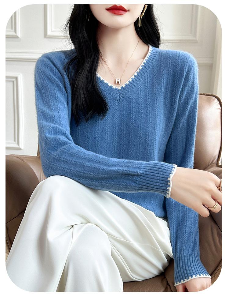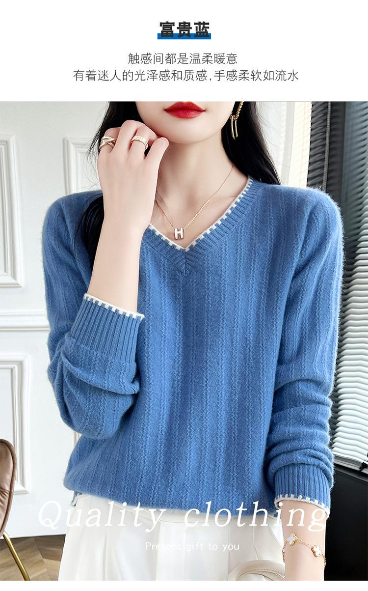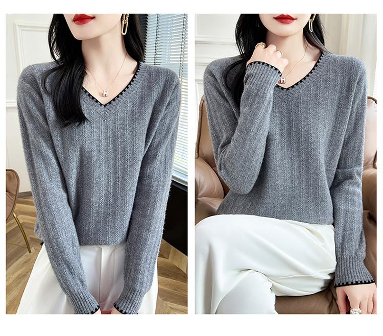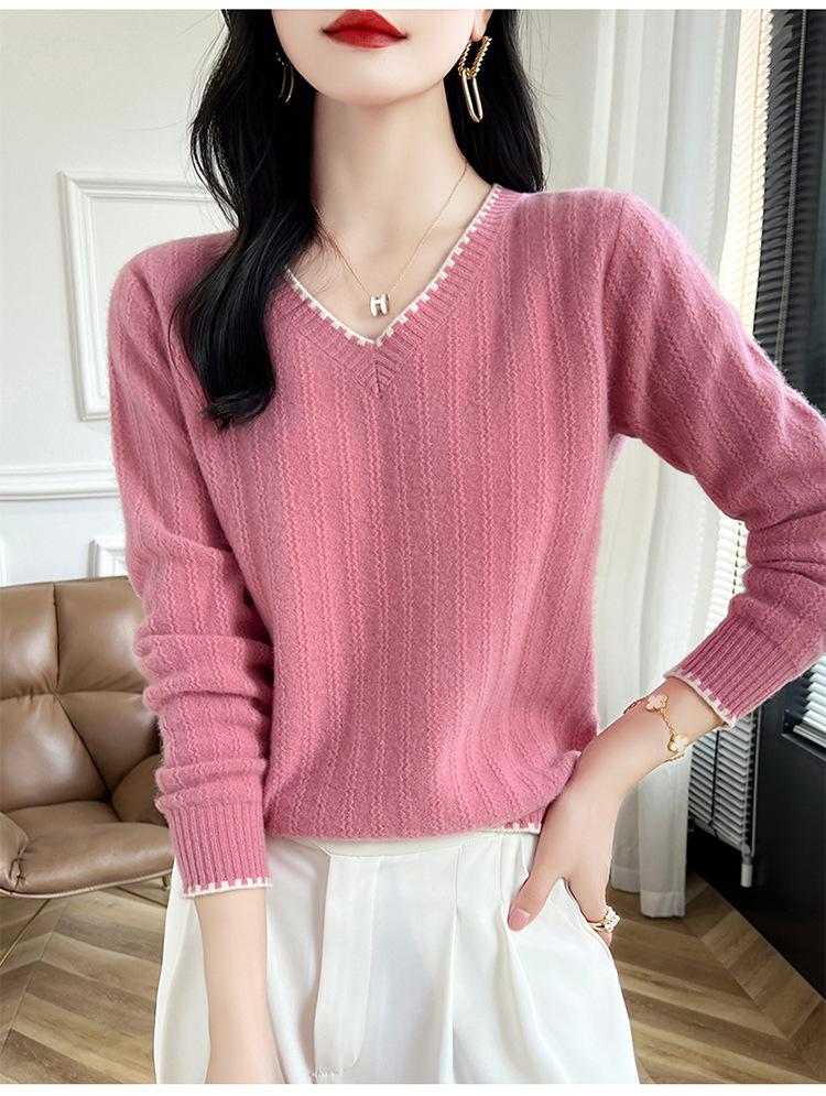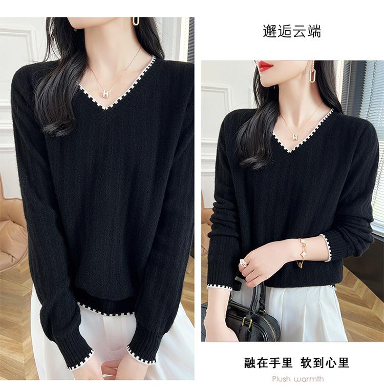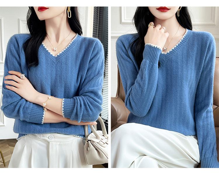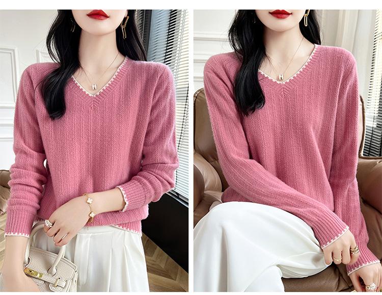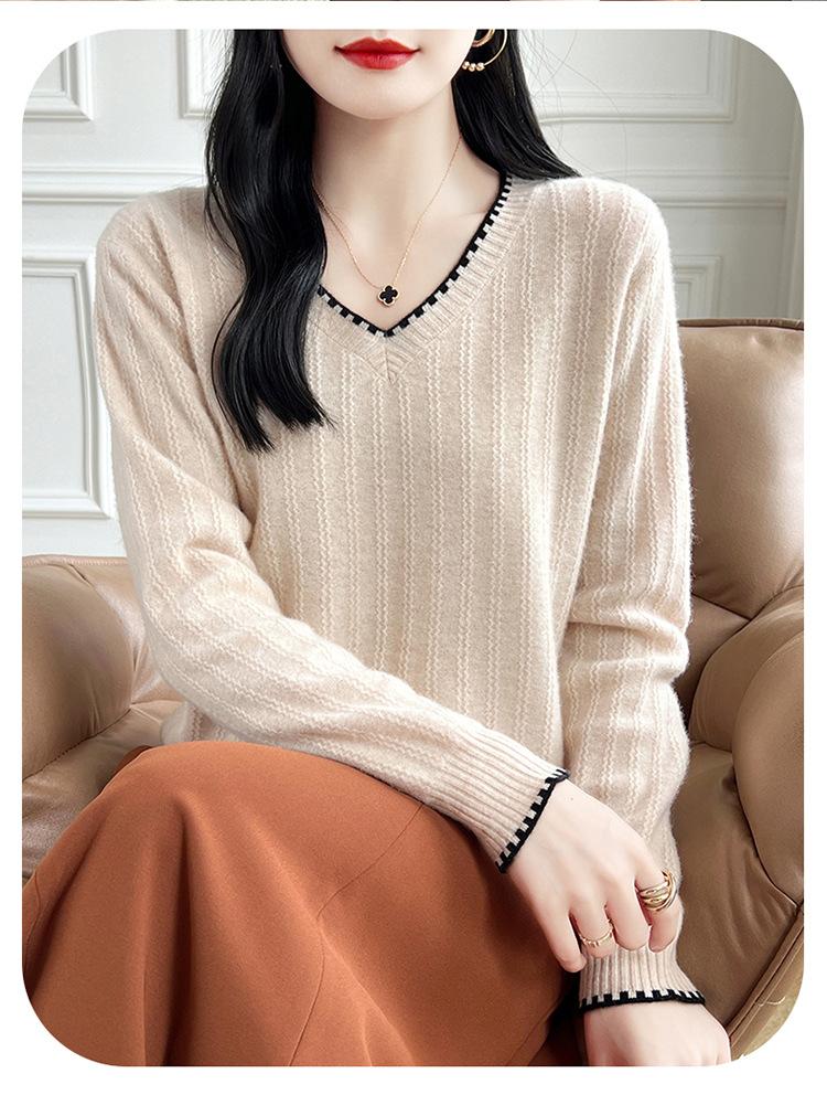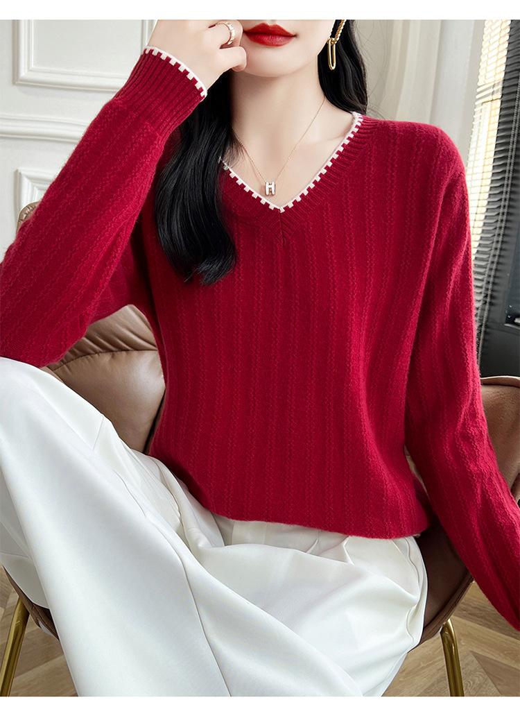 Otoño e invierno 2024 nuevo suéter sencillo de cuello en V de pura lana, manga larga, jersey de color combinado, suelto, camisa base, suéter
