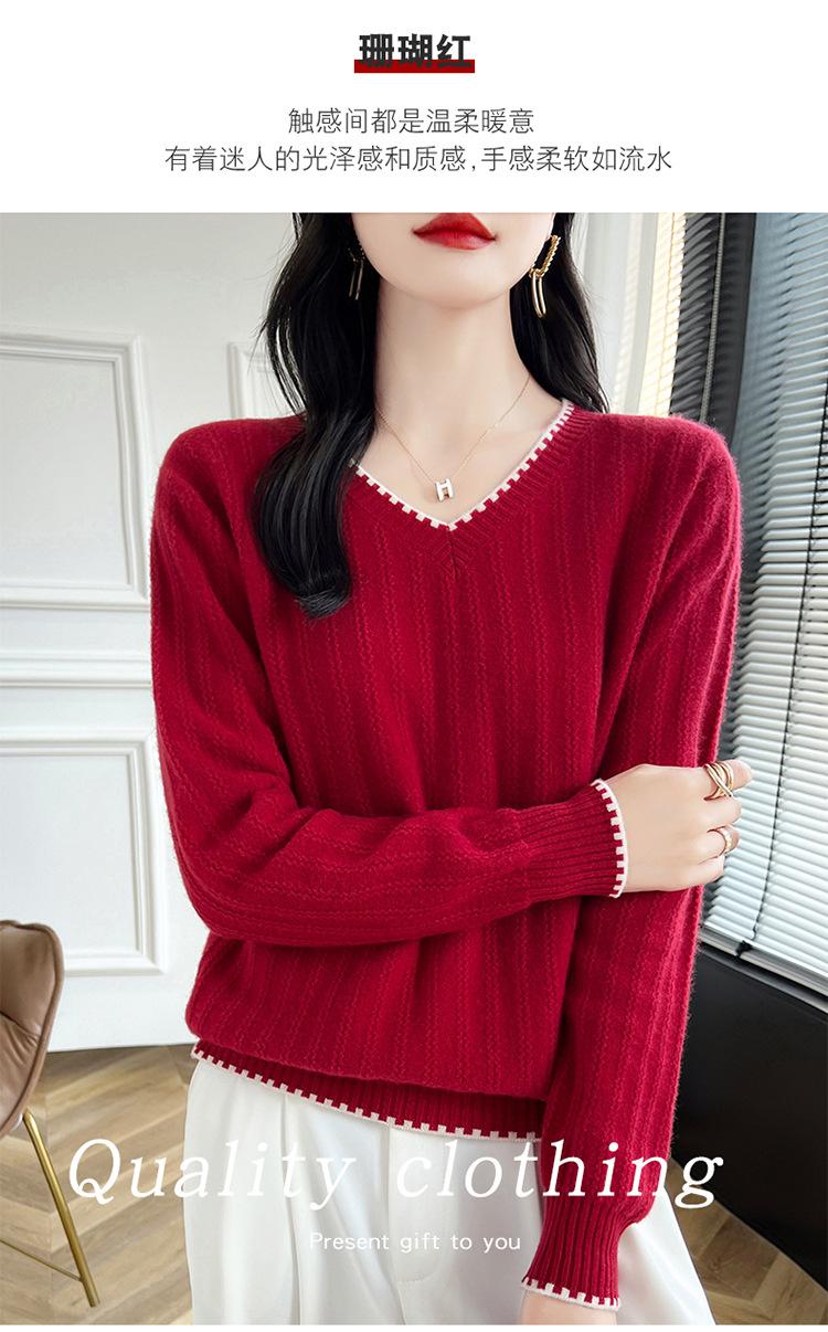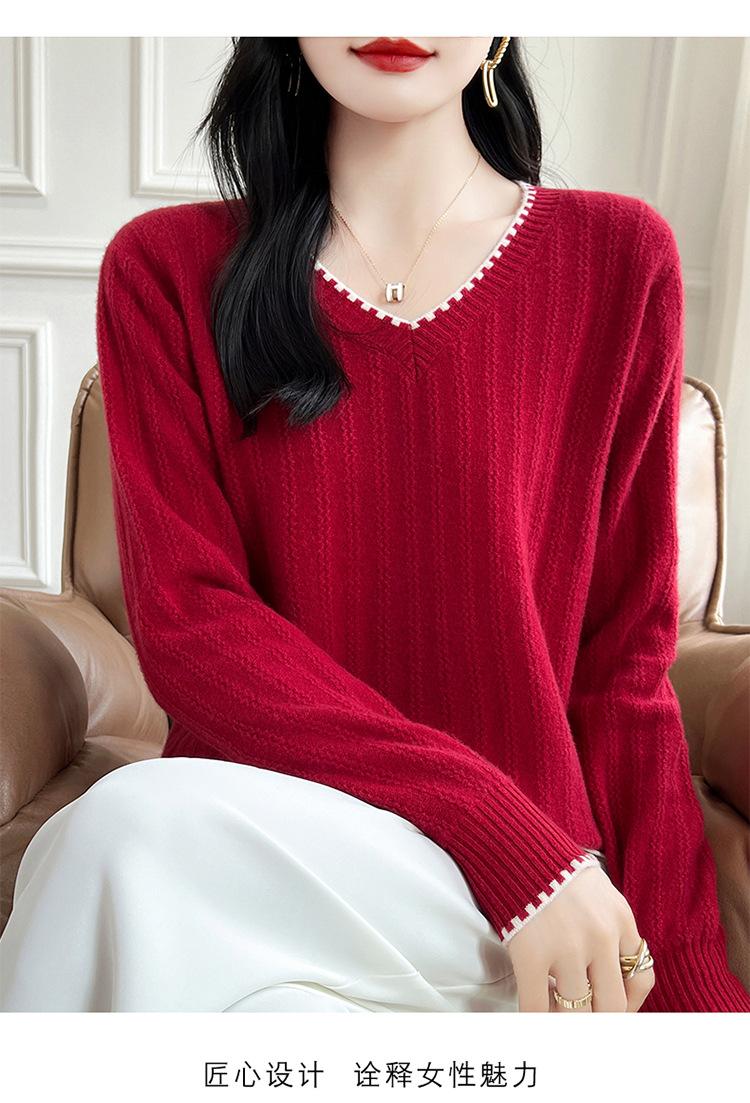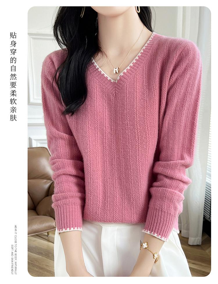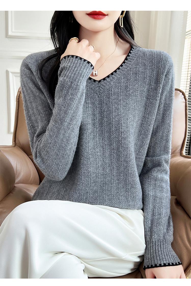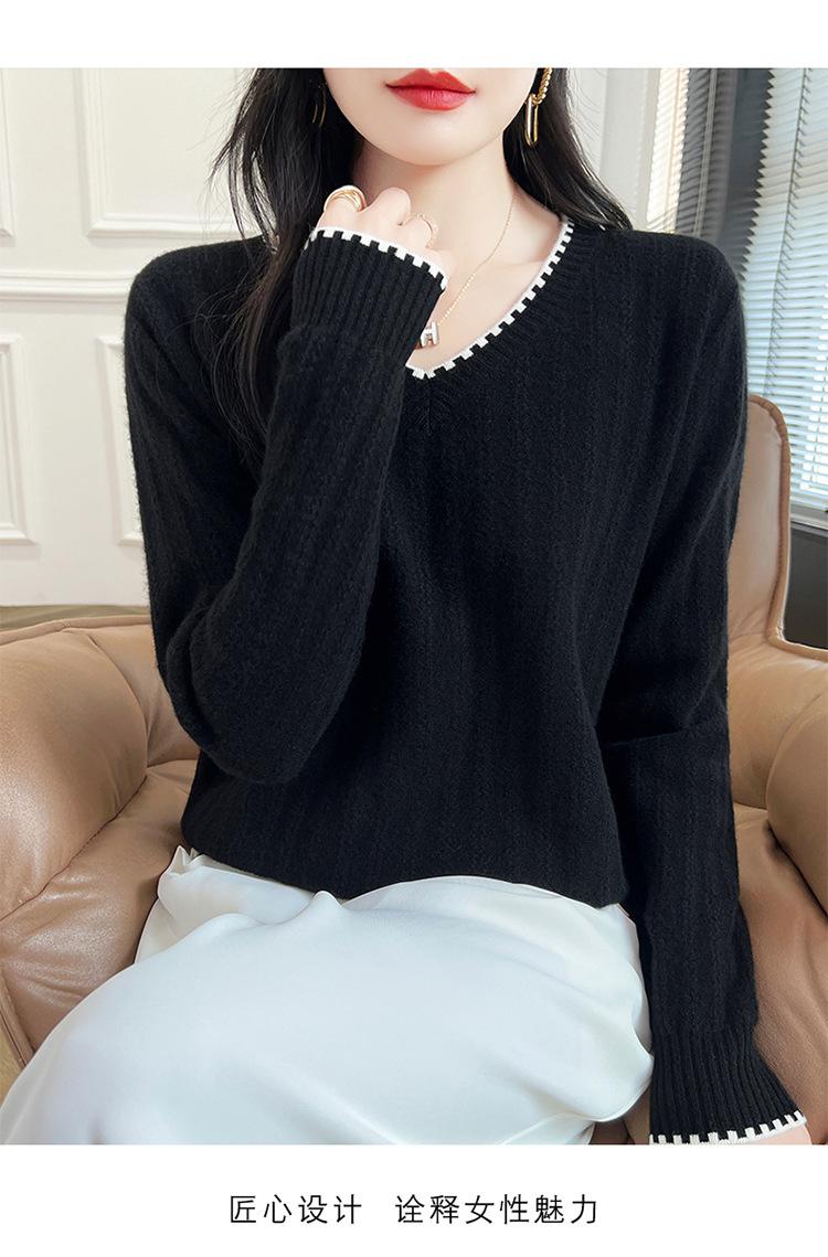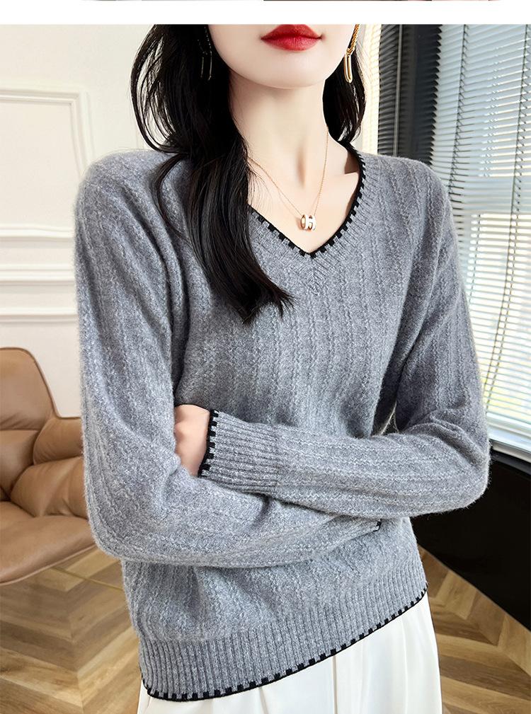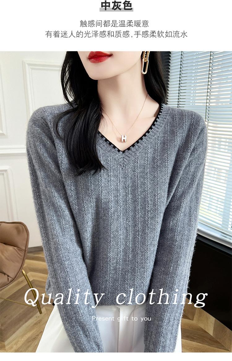 Otoño e invierno 2024 nuevo suéter sencillo de cuello en V de pura lana, manga larga, jersey de color combinado, suelto, camisa base, suéter