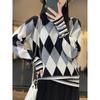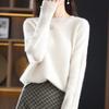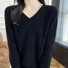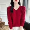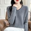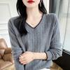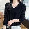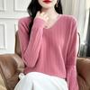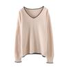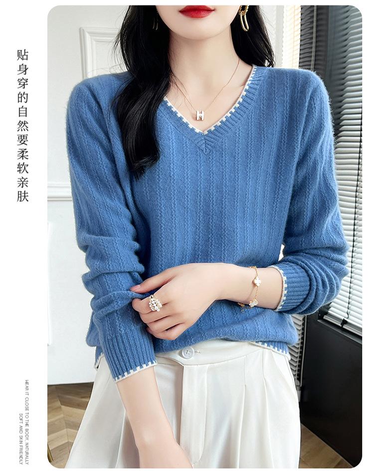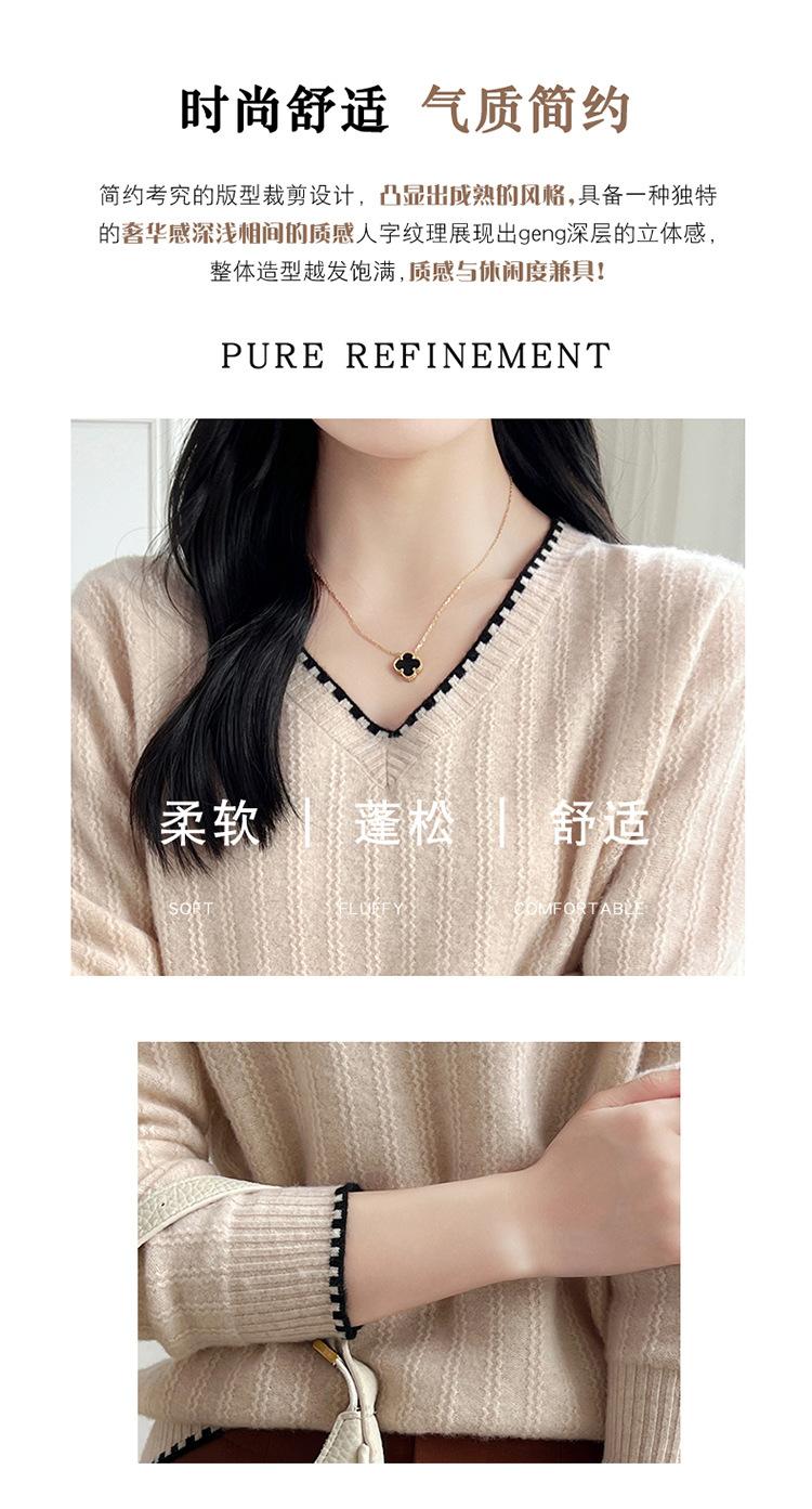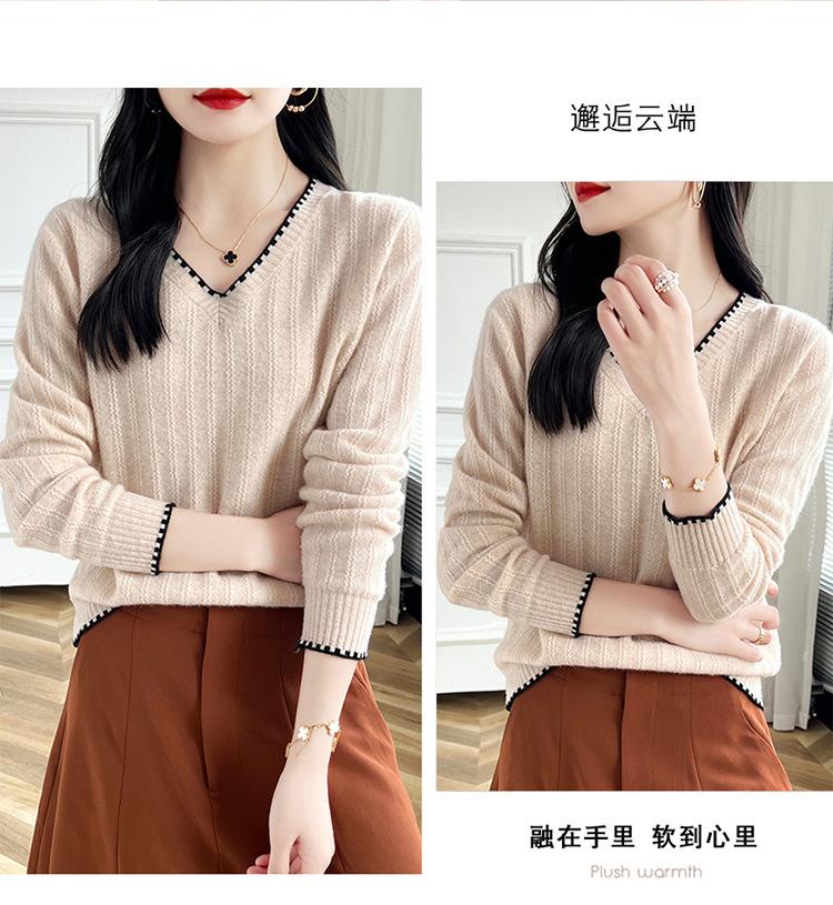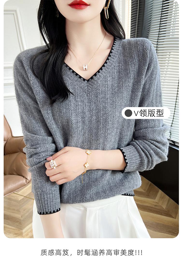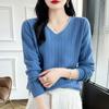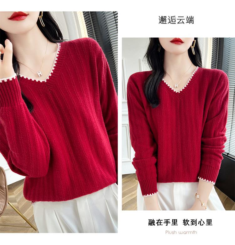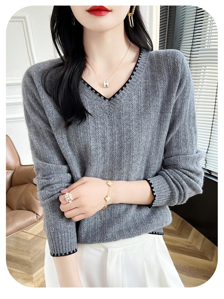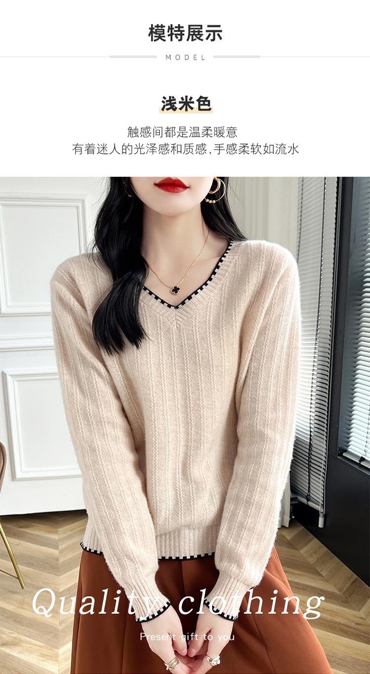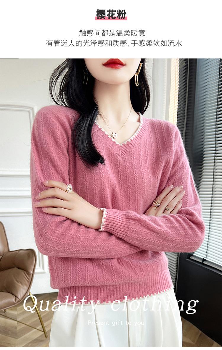 Otoño e invierno 2024 nuevo suéter sencillo de cuello en V de pura lana, manga larga, jersey de color combinado, suelto, camisa base, suéter