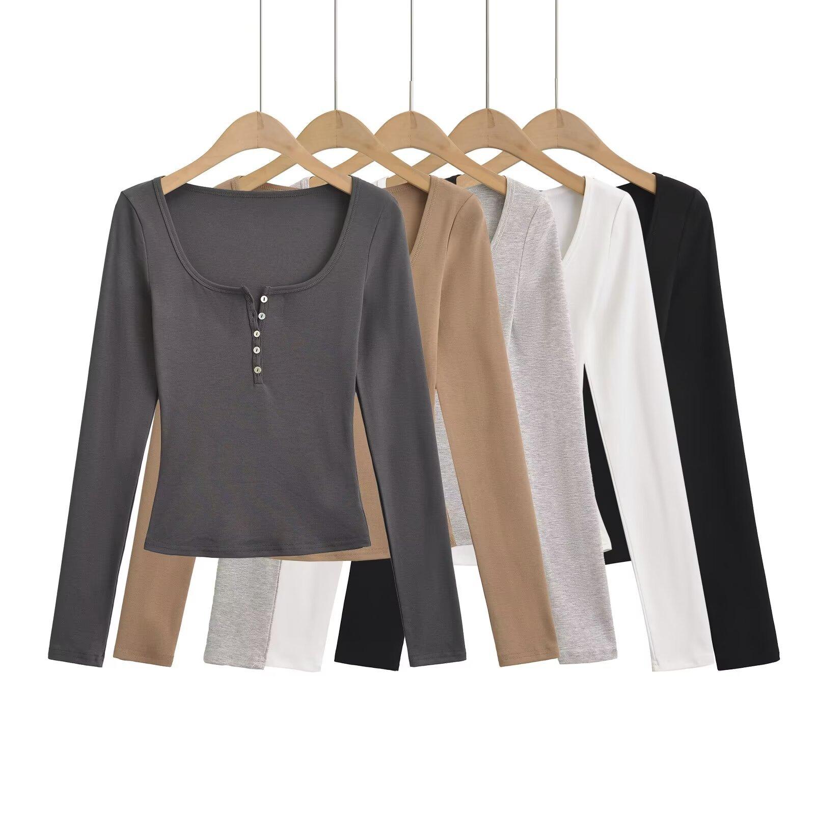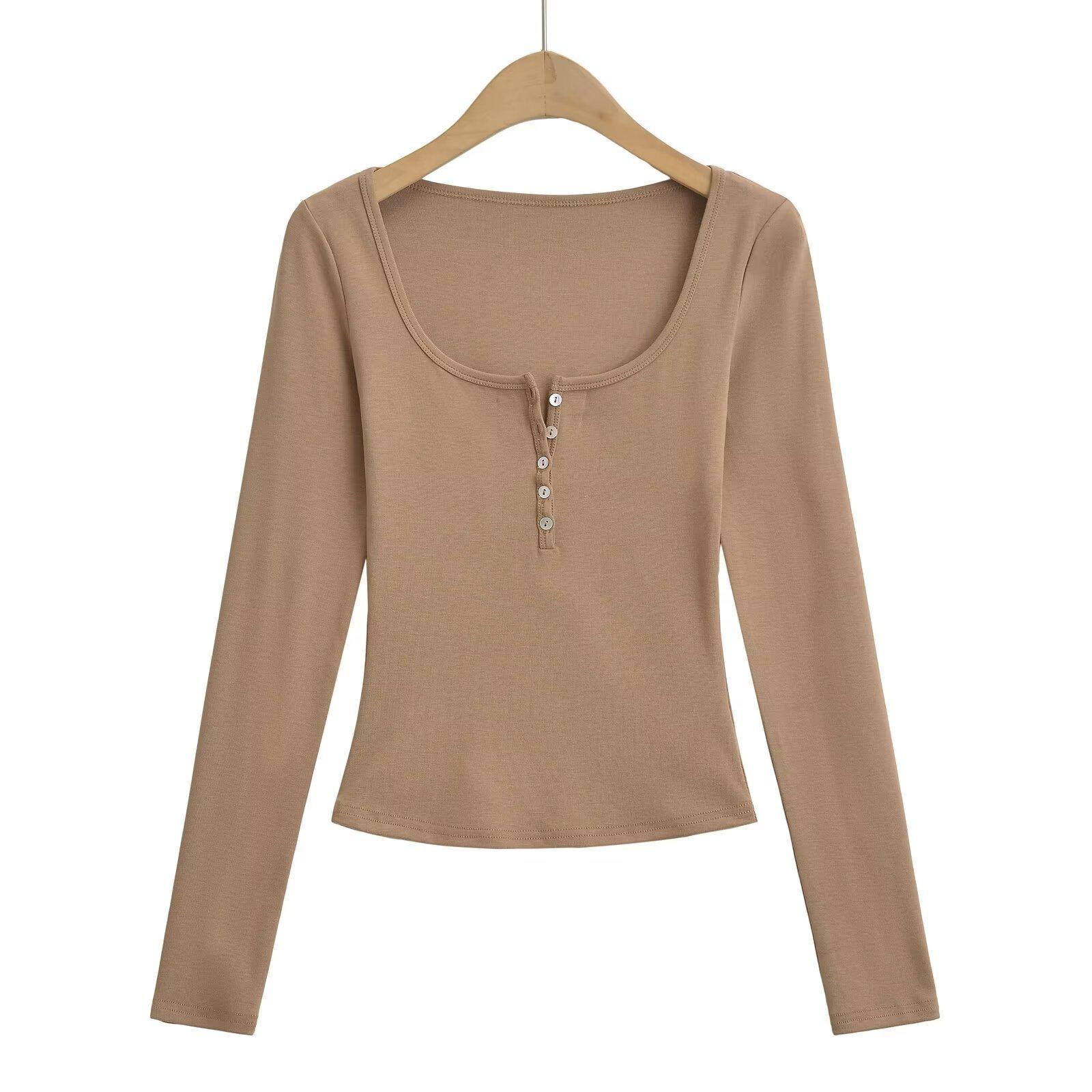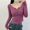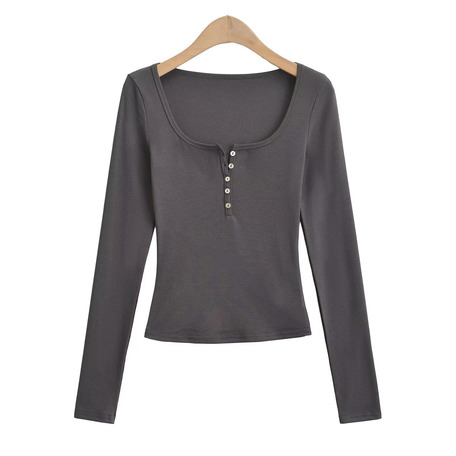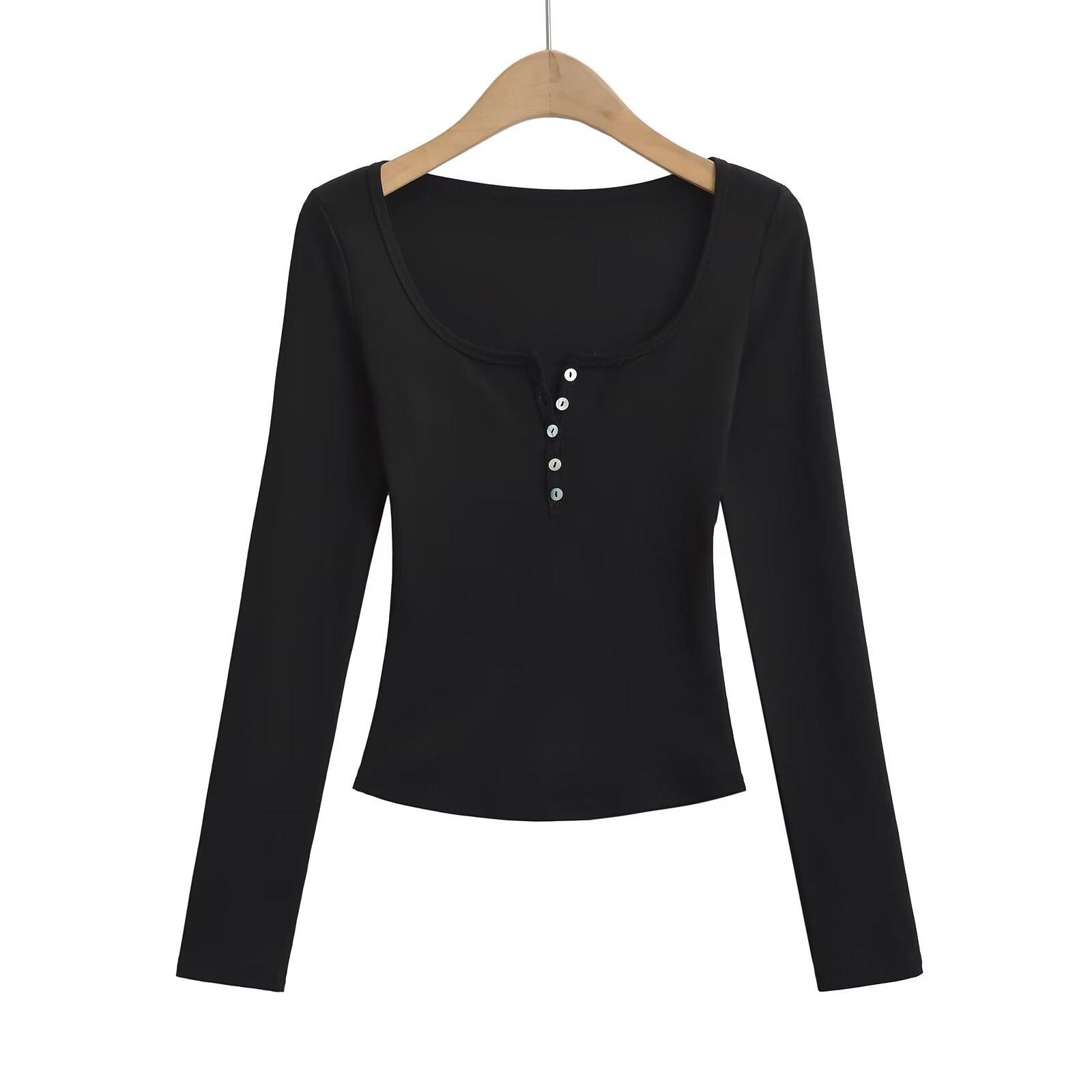Camiseta de Estilo Deseo Puro con Cuello Semiabierto para Chica Picante, Ajustada, para Mujer, Camiseta Básica, Primavera y Otoño, Nueva, Hilo Americano, Botones, Manga Larga