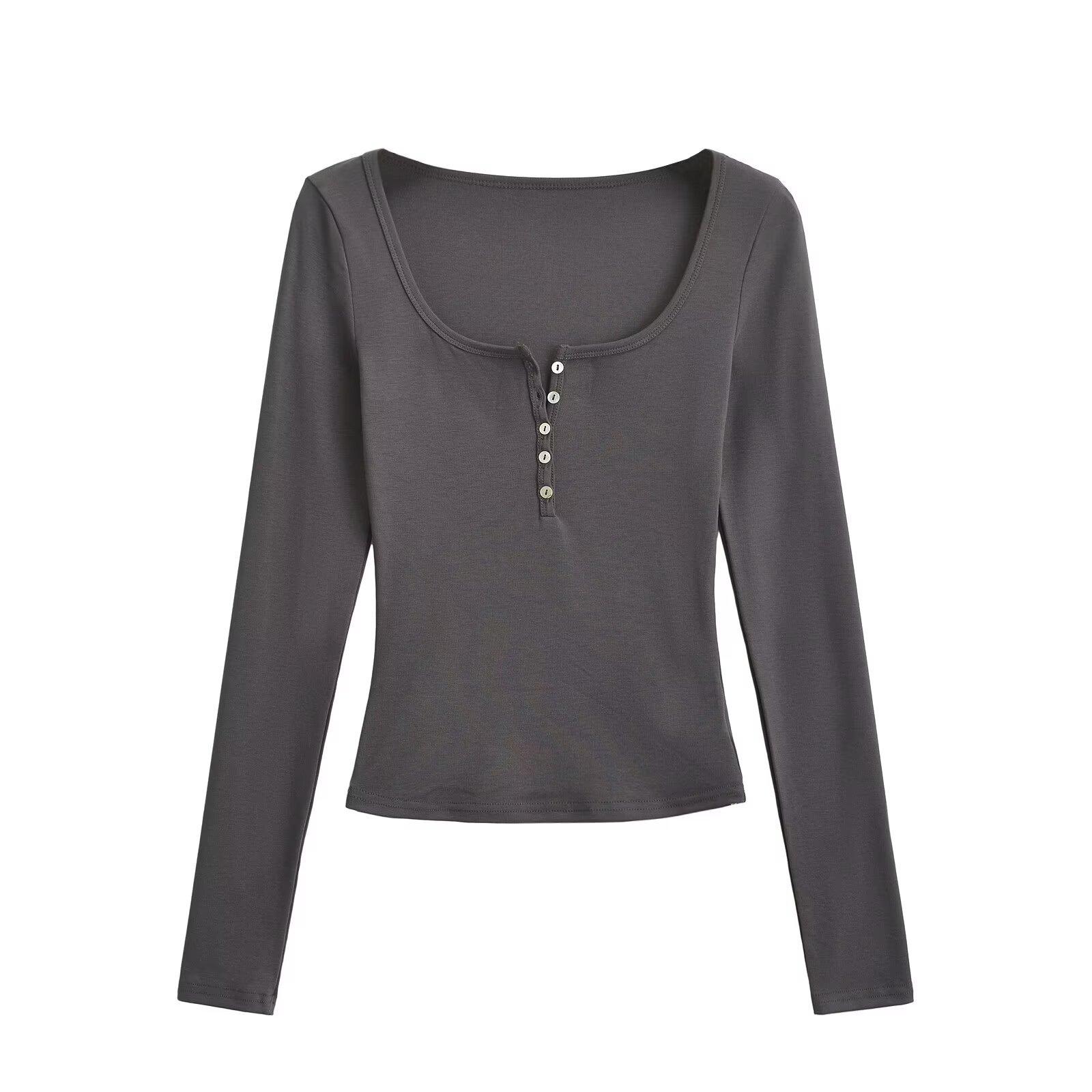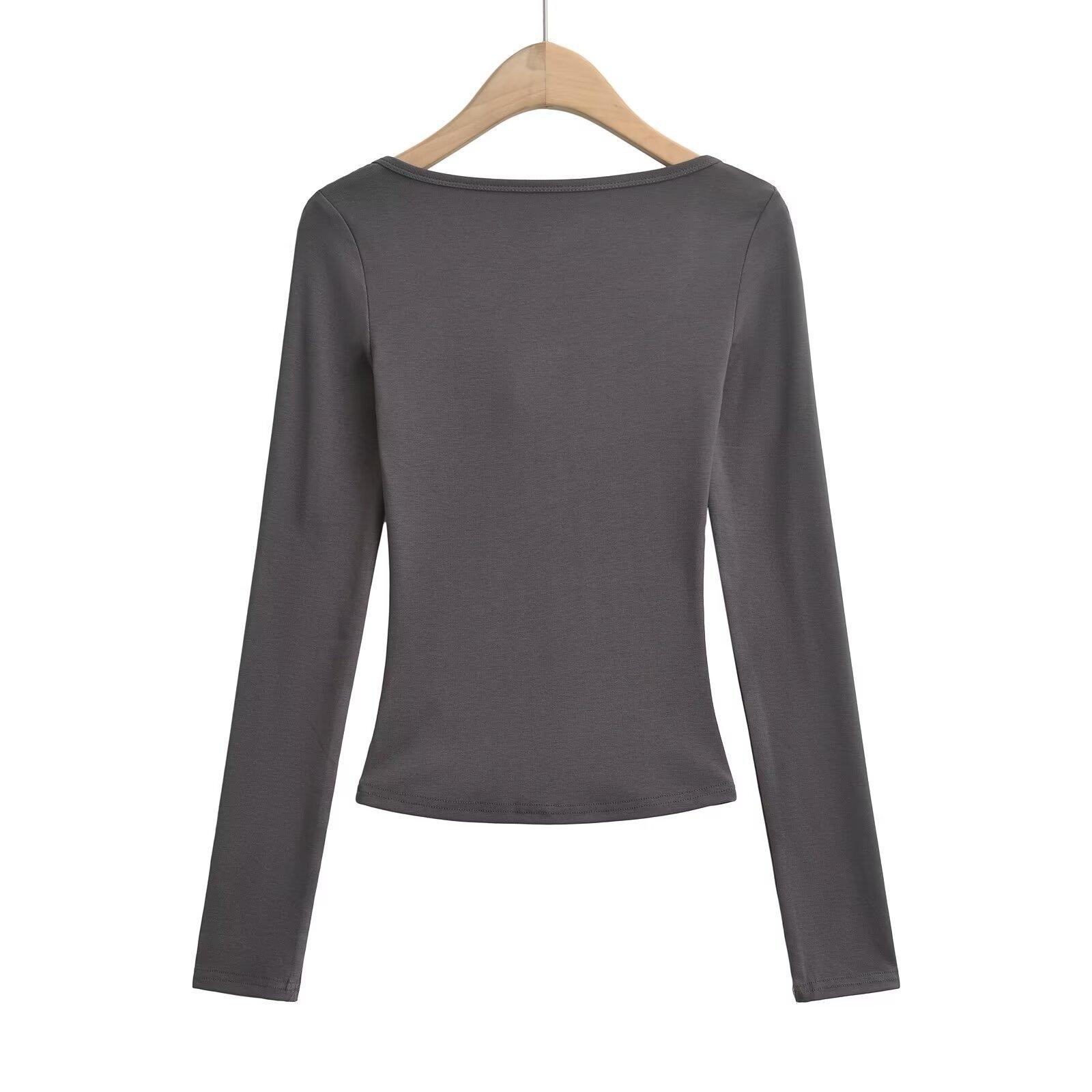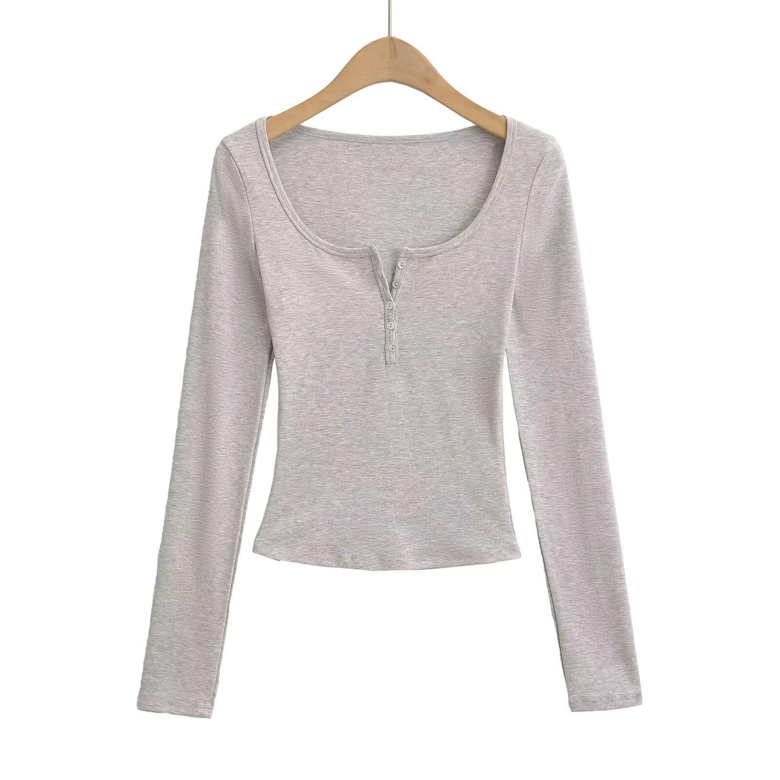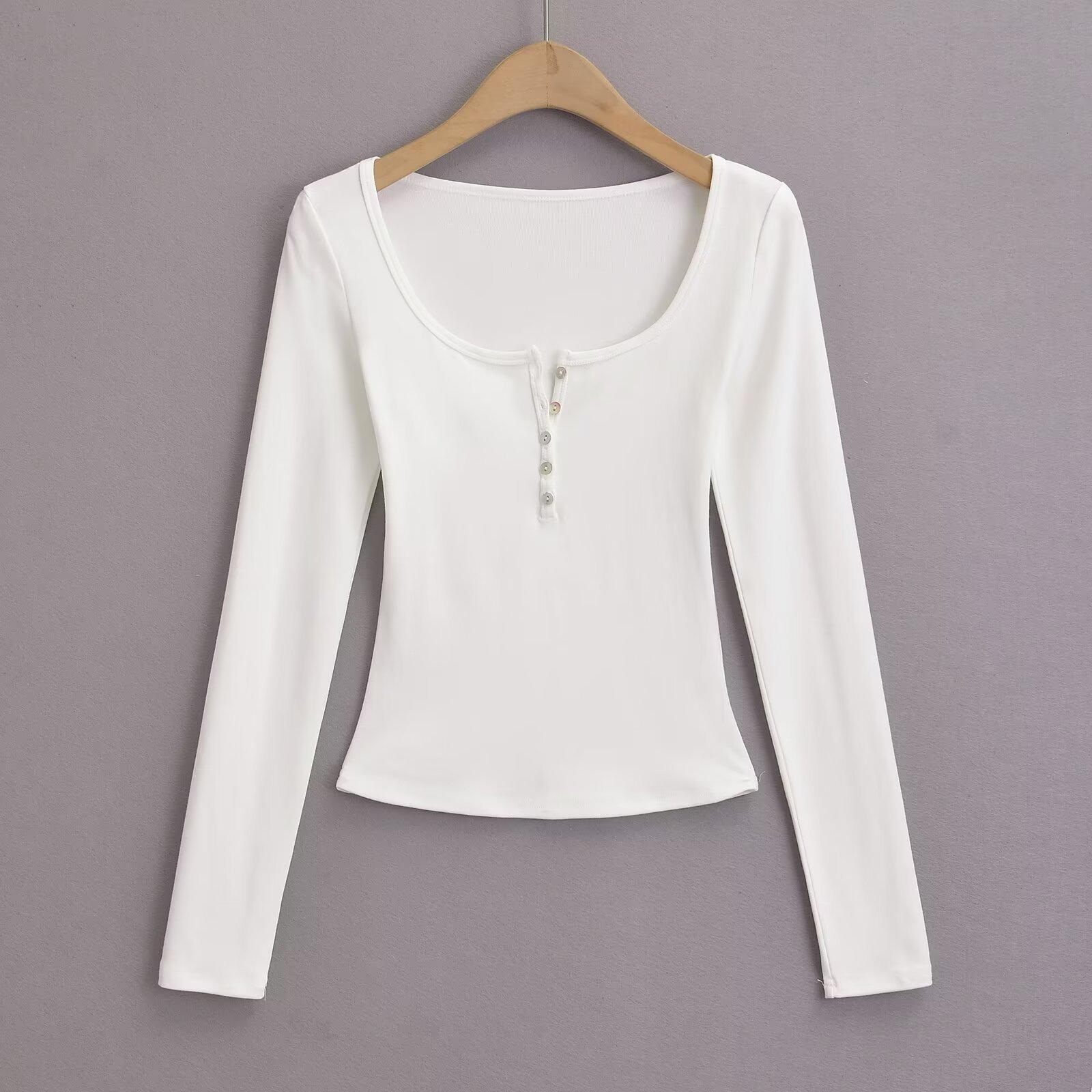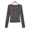 Camiseta de Estilo Deseo Puro con Cuello Semiabierto para Chica Picante, Ajustada, para Mujer, Camiseta Básica, Primavera y Otoño, Nueva, Hilo Americano, Botones, Manga Larga