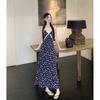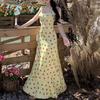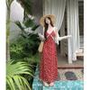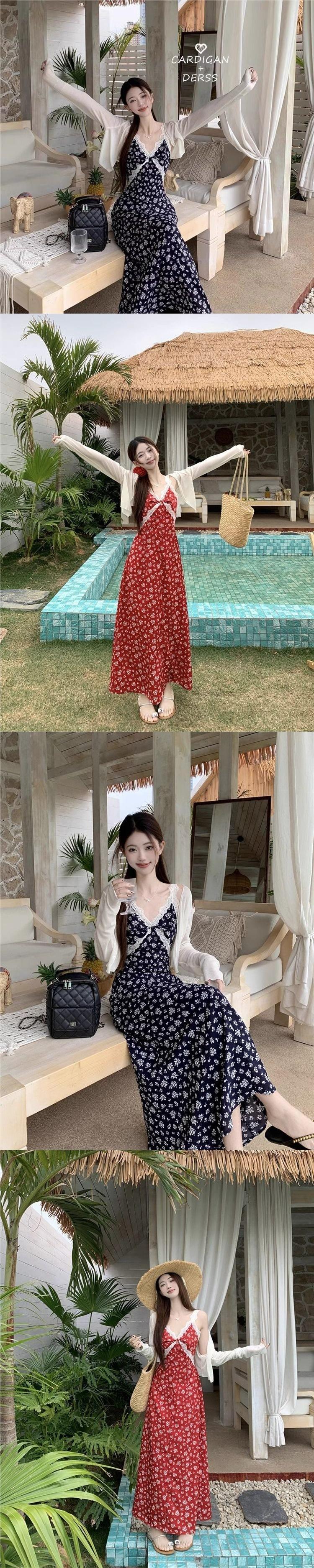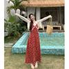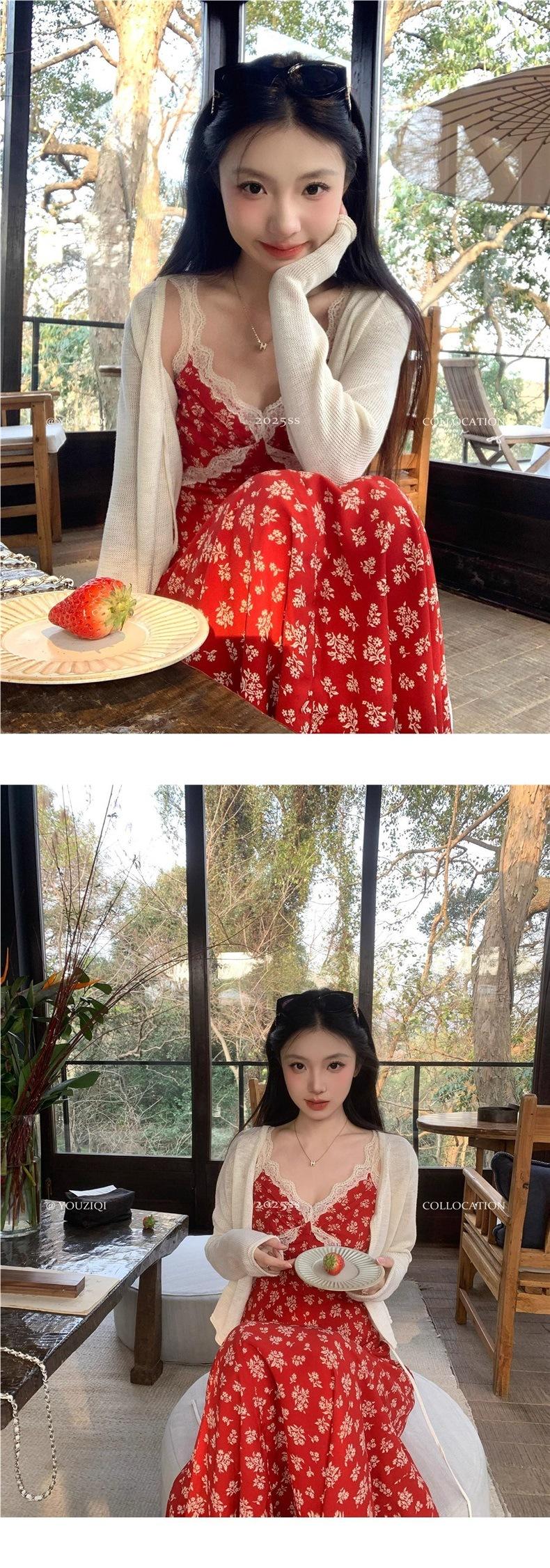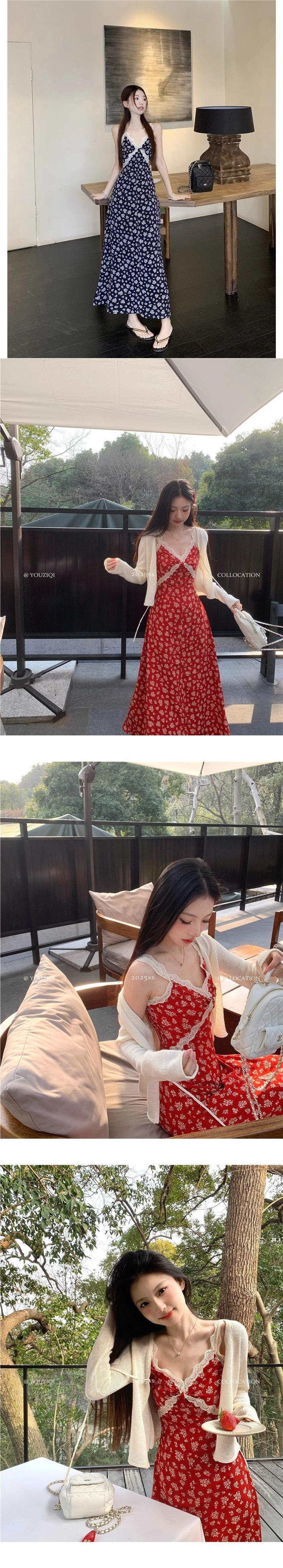 Vestido Rojo Floral de Tirantes Espagueti de Deseo Francés Puro Temperamento Sexy Estilo Vacacional Chica Caliente Diseño de Encaje Adelgazante Vestido Largo