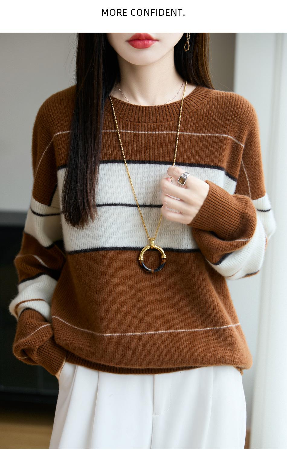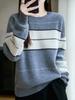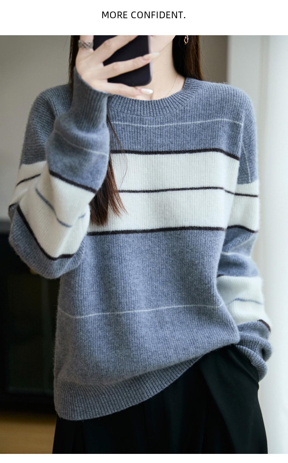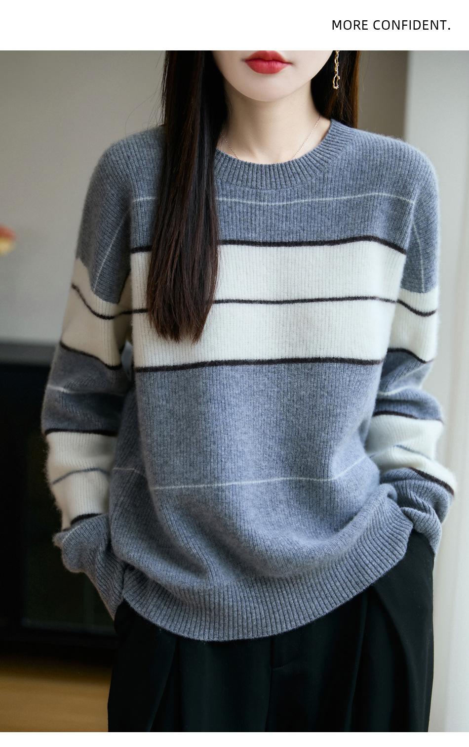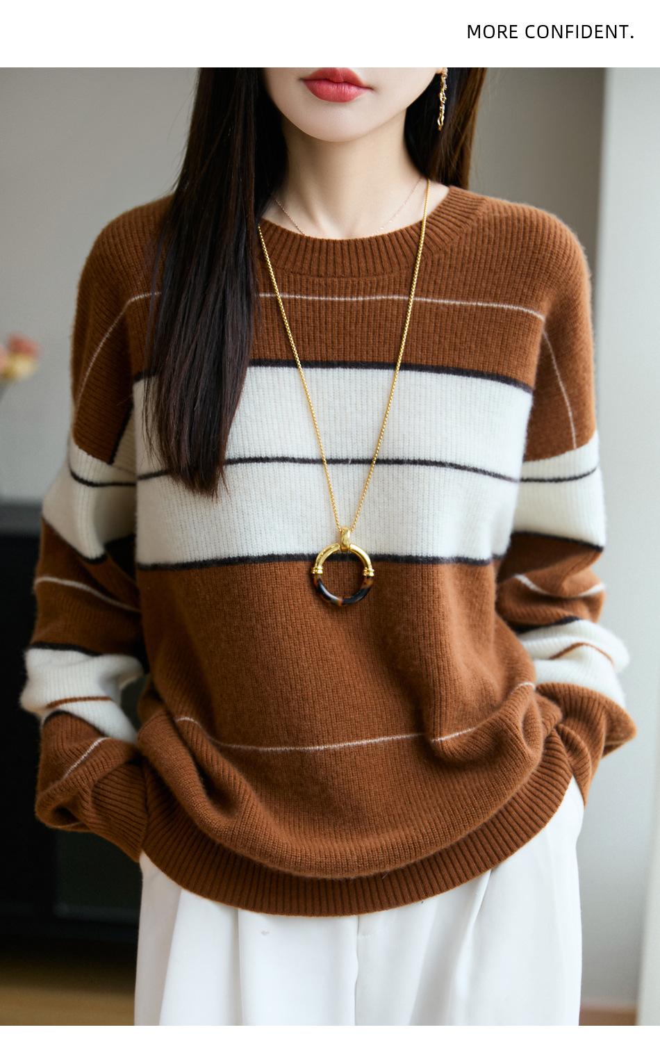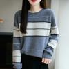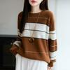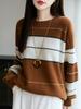 Suéter de punto básico de manga larga con cuello redondo a rayas en bloques de color para mujer, estilo holgado y perezoso, suéter grueso de lana 100% pura