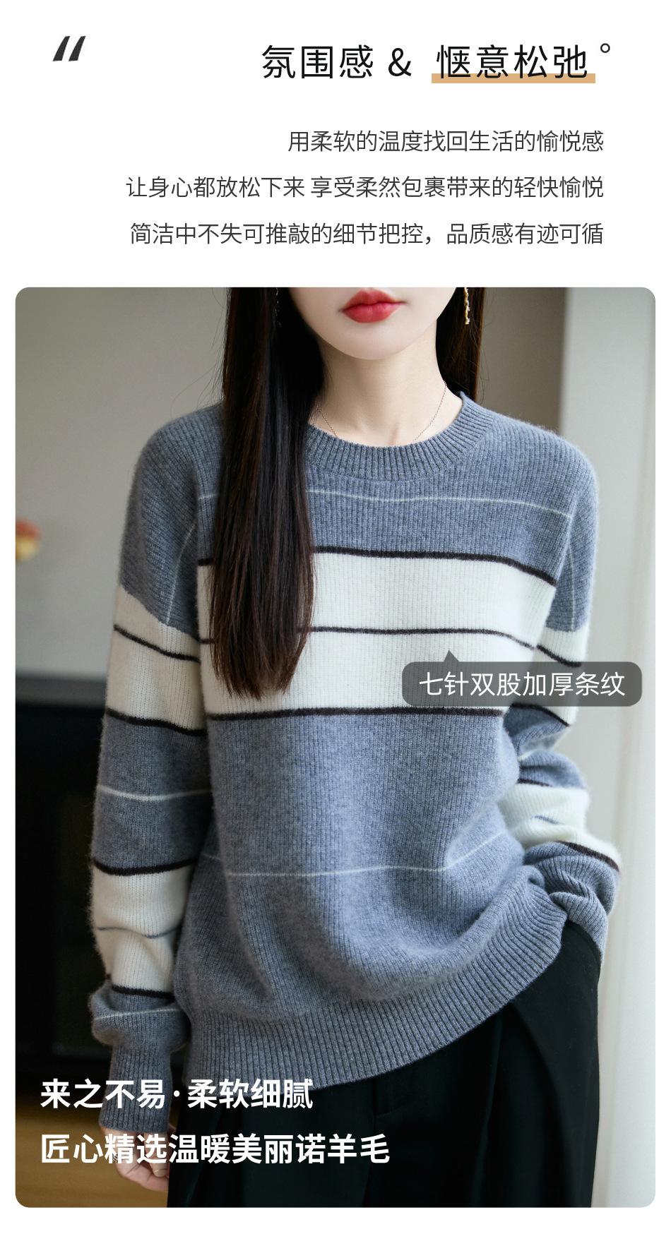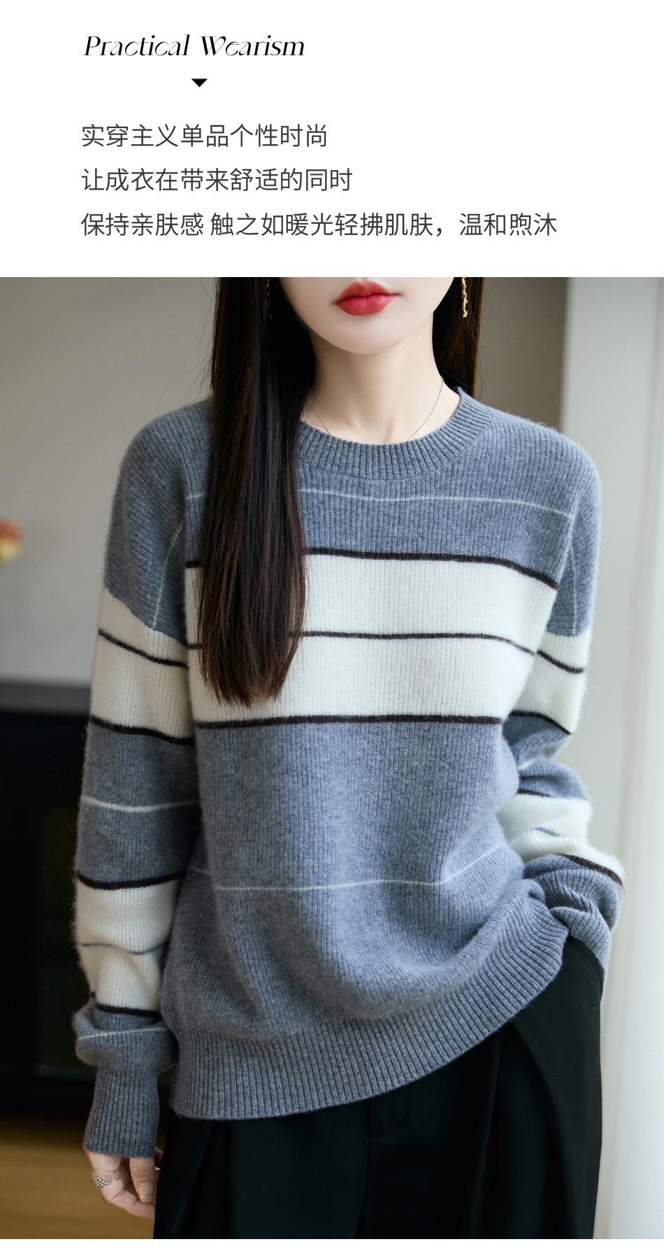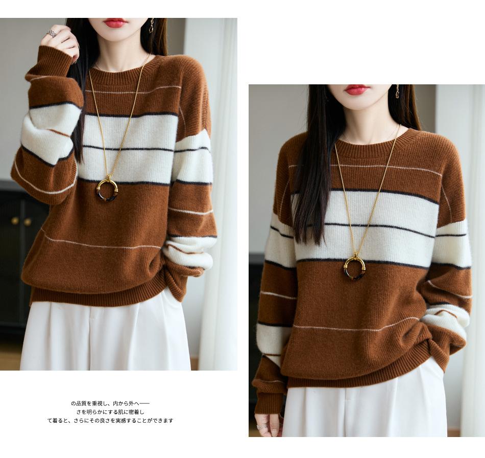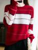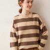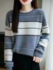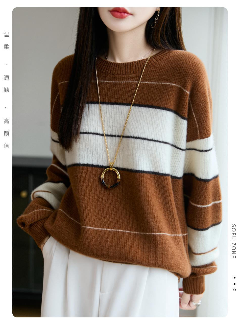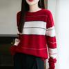 Suéter de punto básico de manga larga con cuello redondo a rayas en bloques de color para mujer, estilo holgado y perezoso, suéter grueso de lana 100% pura