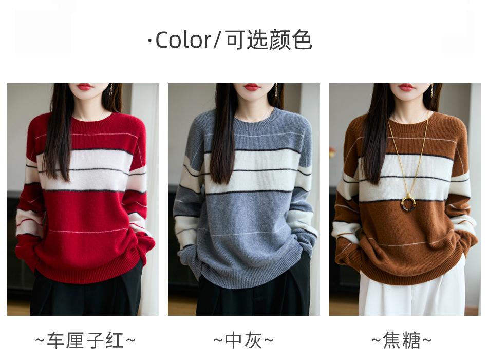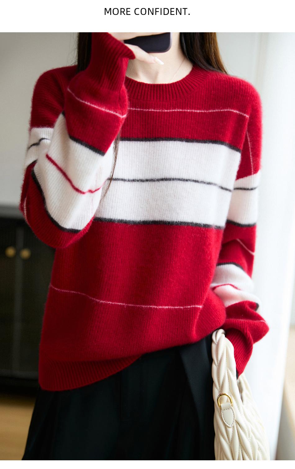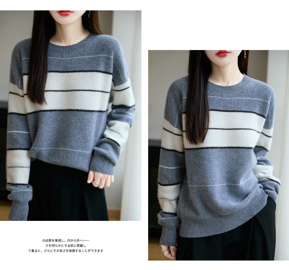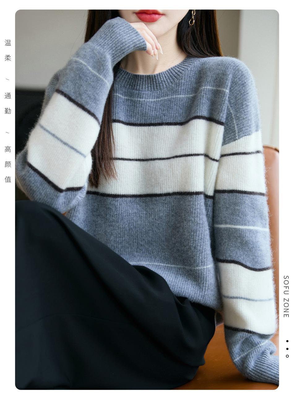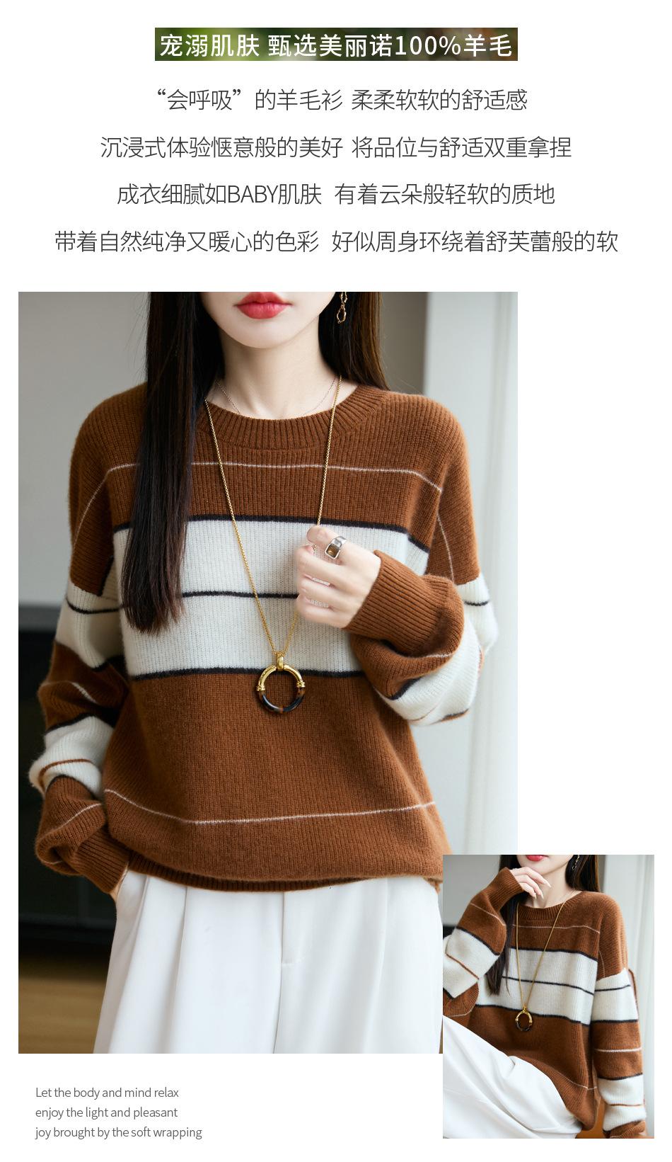 Suéter de punto básico de manga larga con cuello redondo a rayas en bloques de color para mujer, estilo holgado y perezoso, suéter grueso de lana 100% pura