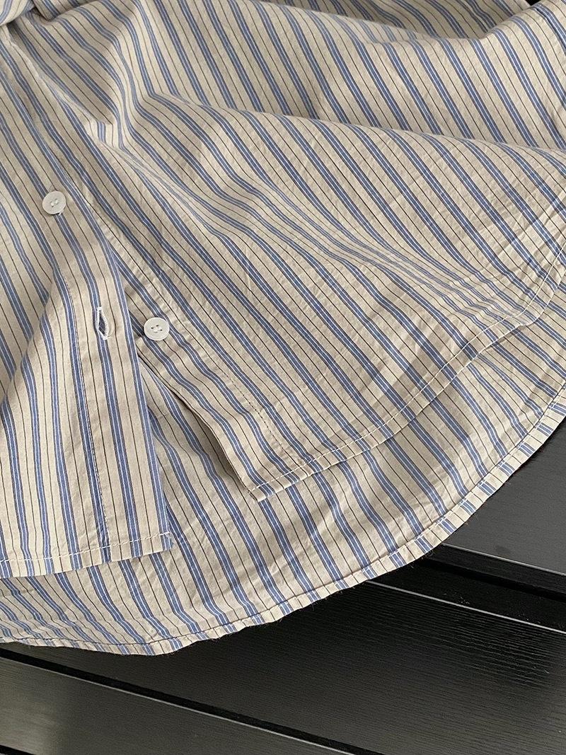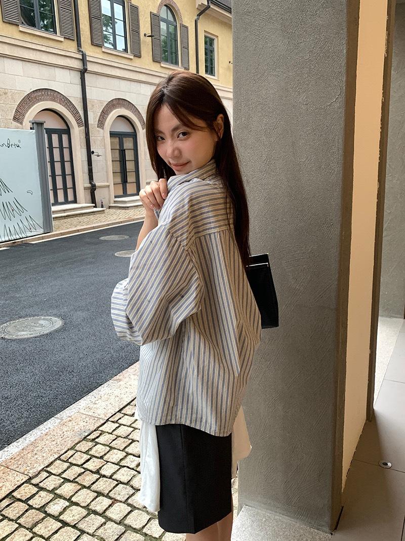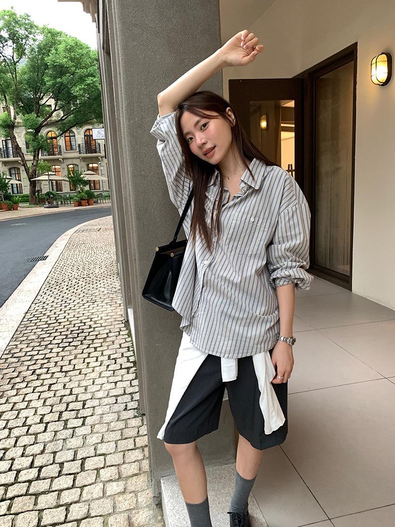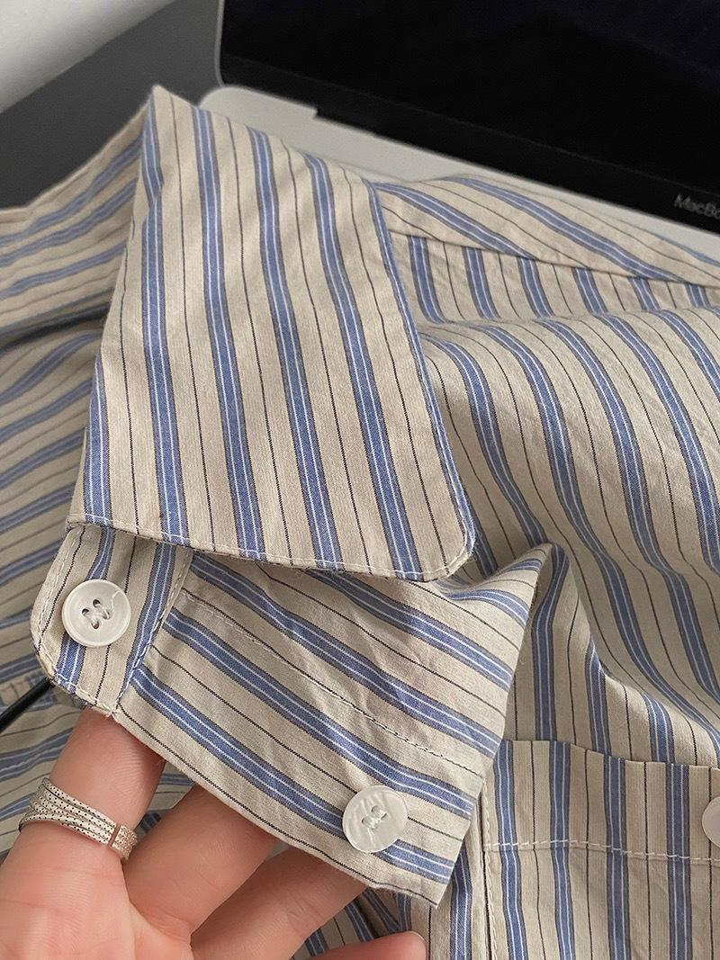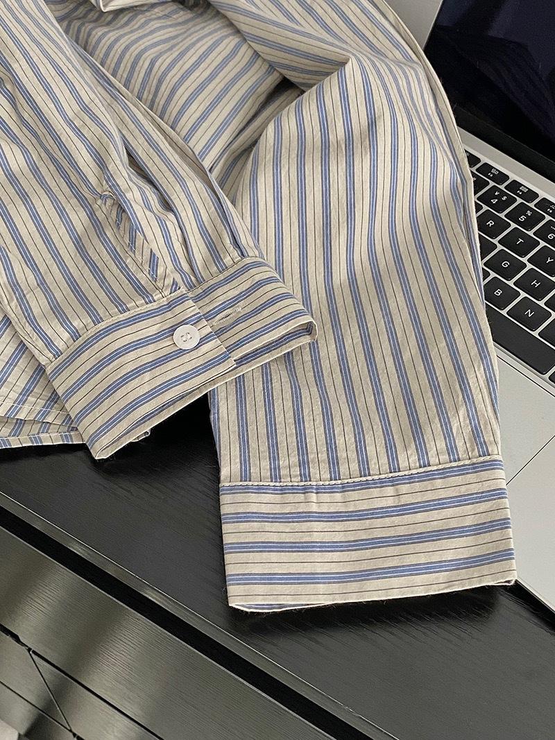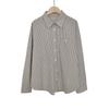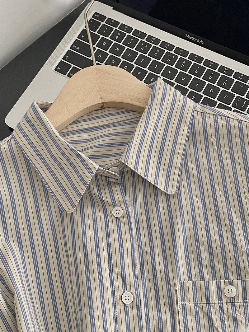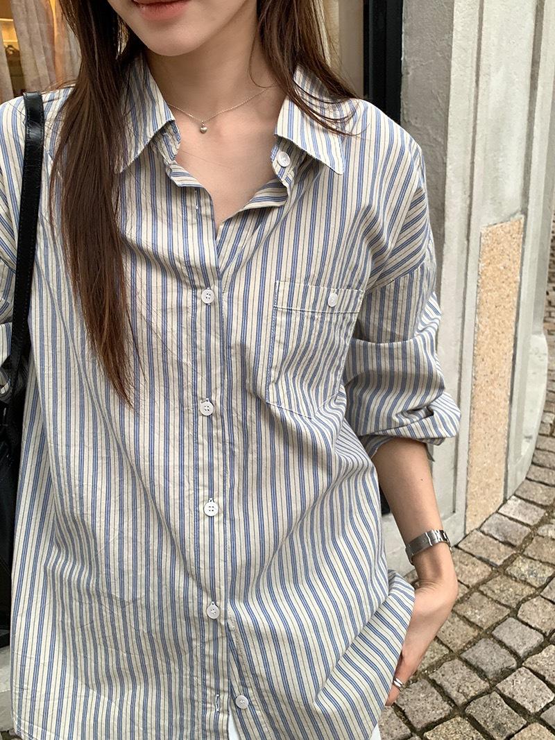 Otoño Retro Azul Rayado Manga Larga Pechera Sencilla Multibotones Rayada Cuello Polo Camisa Mujer Holgada Adelgazante Versátil Blusa Top