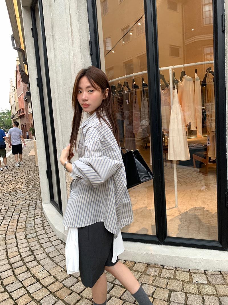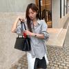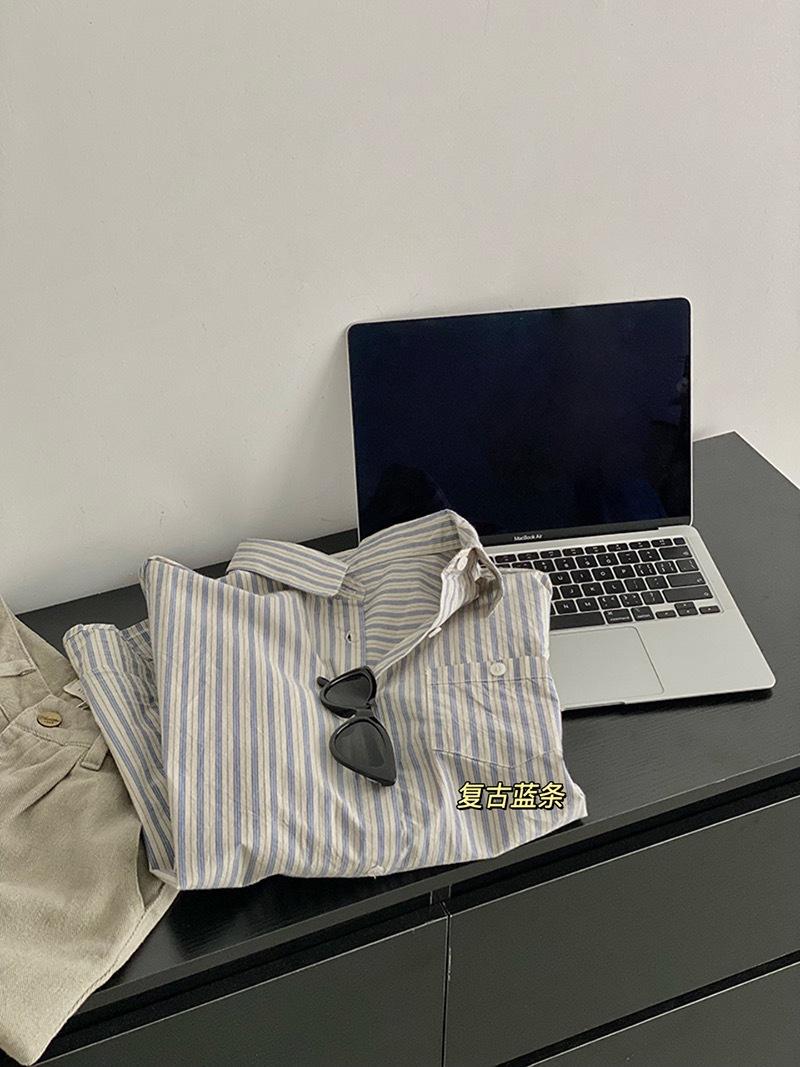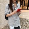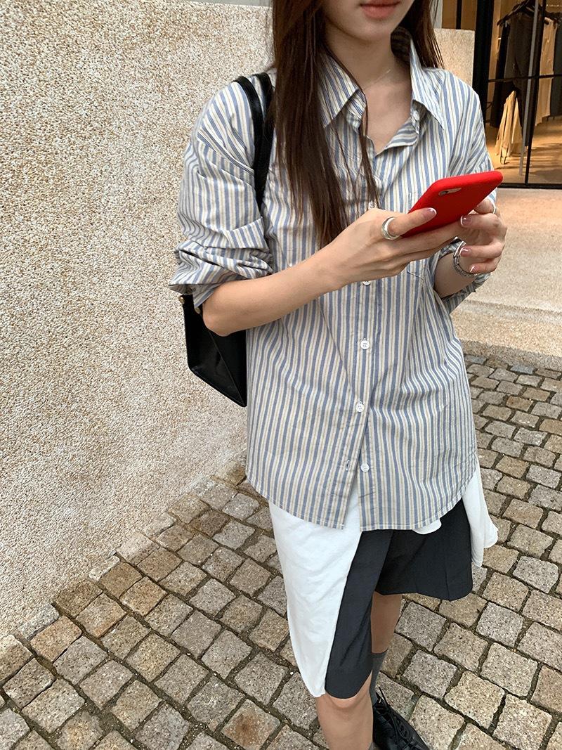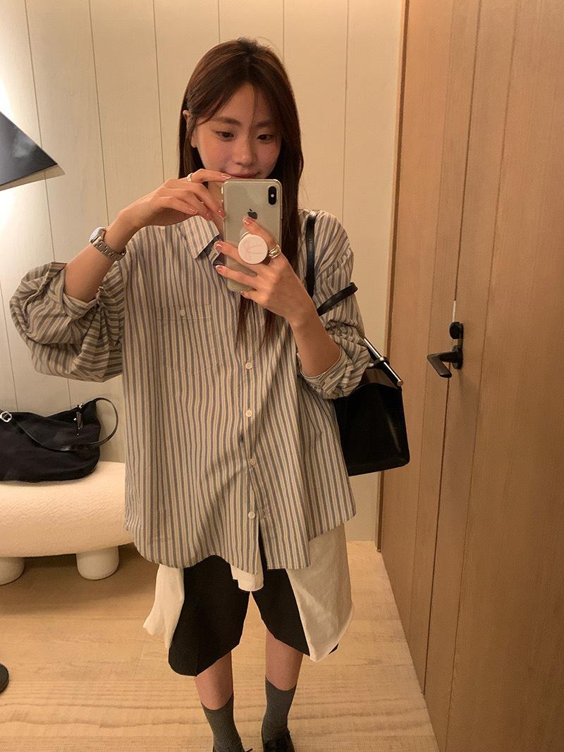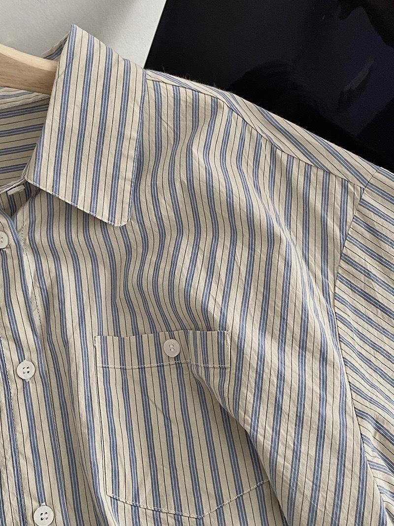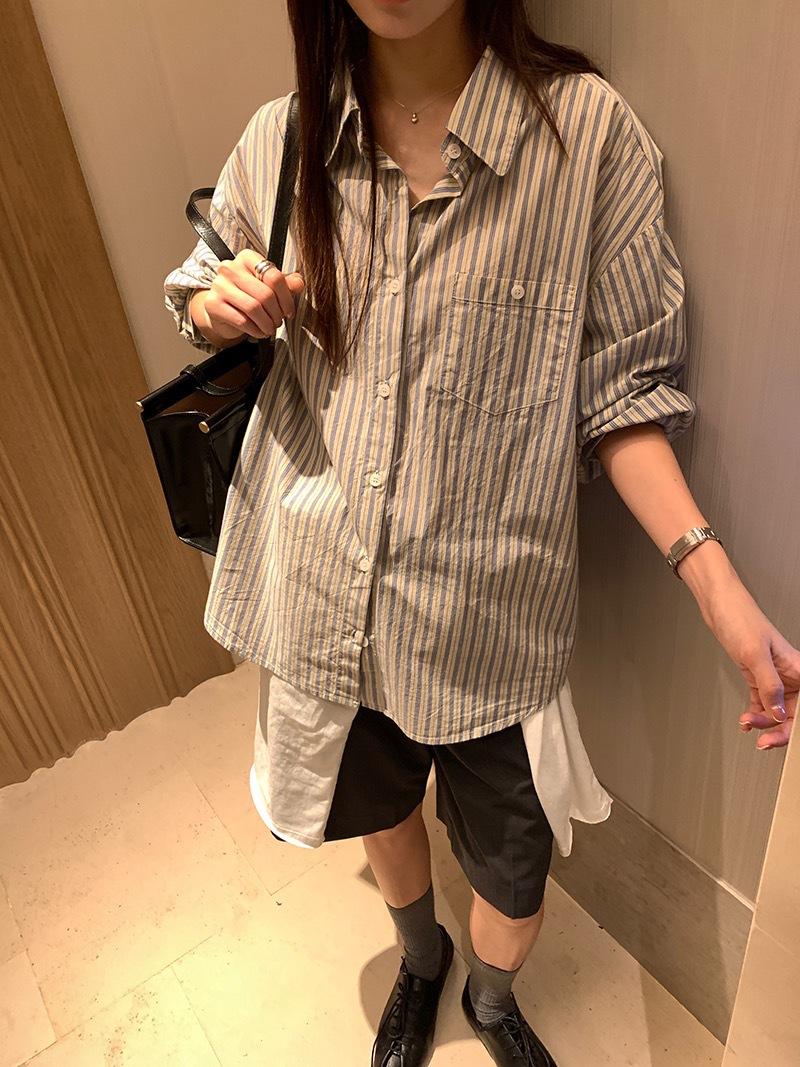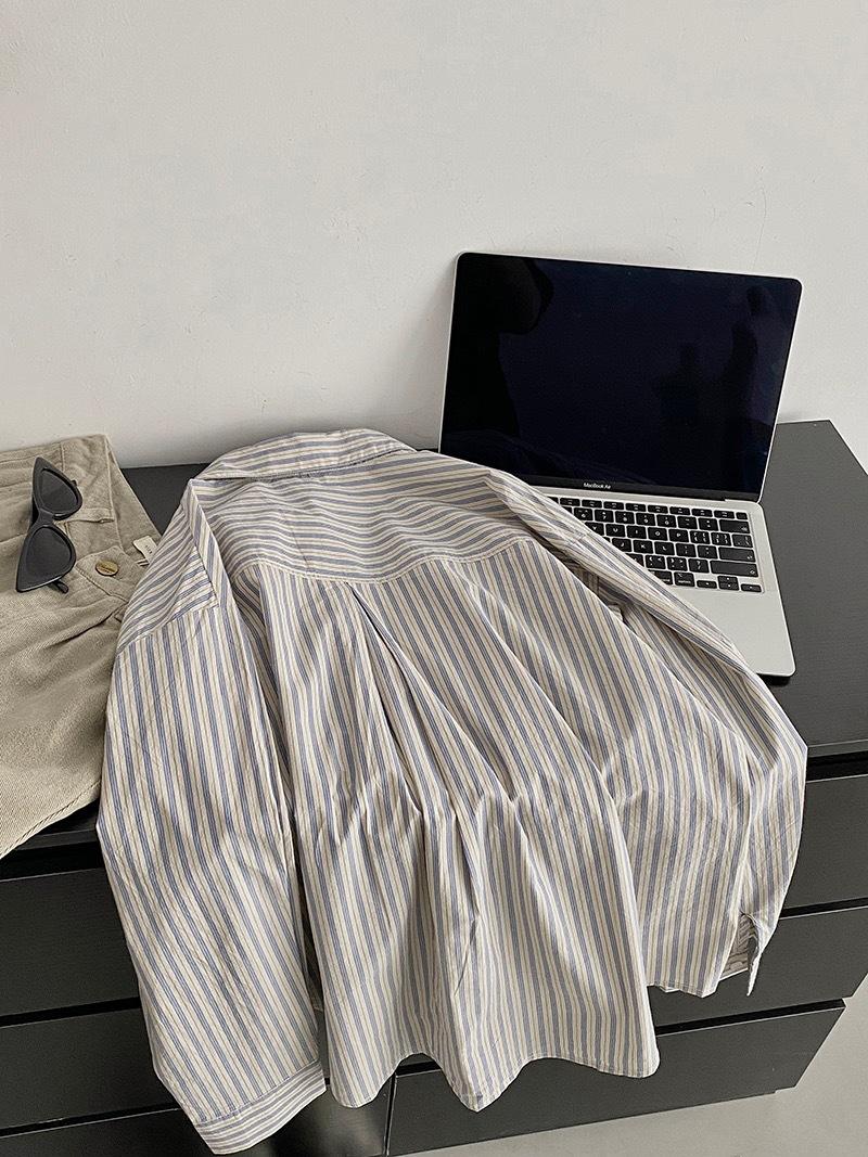 Otoño Retro Azul Rayado Manga Larga Pechera Sencilla Multibotones Rayada Cuello Polo Camisa Mujer Holgada Adelgazante Versátil Blusa Top