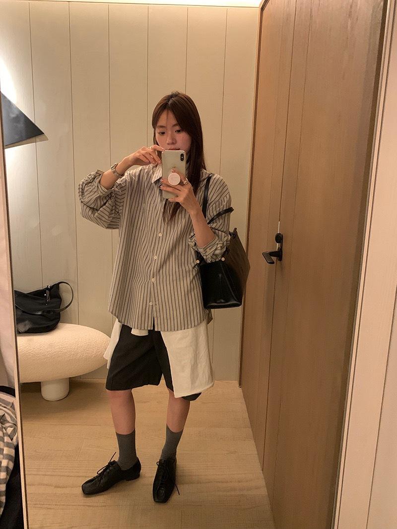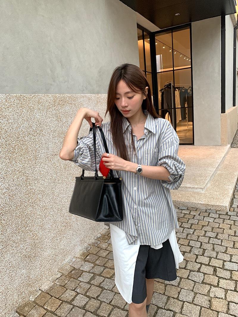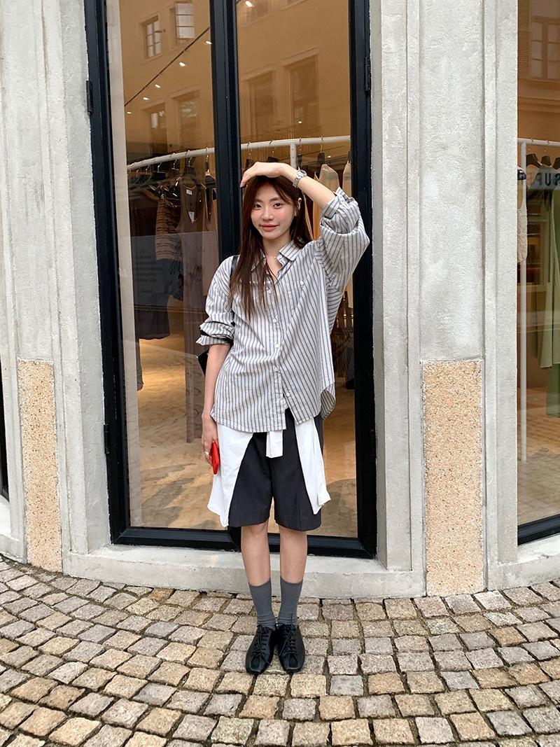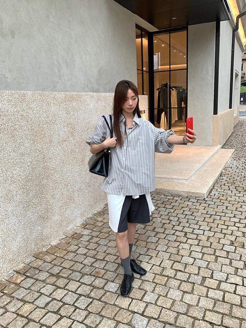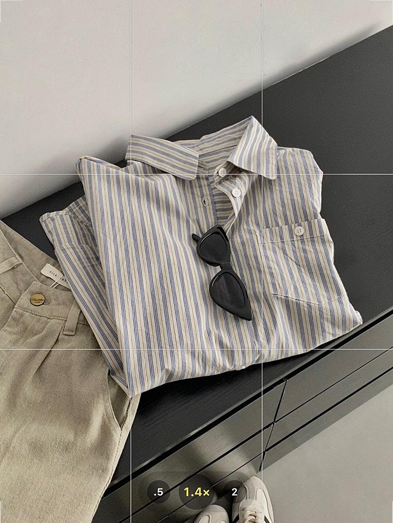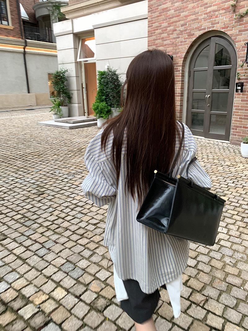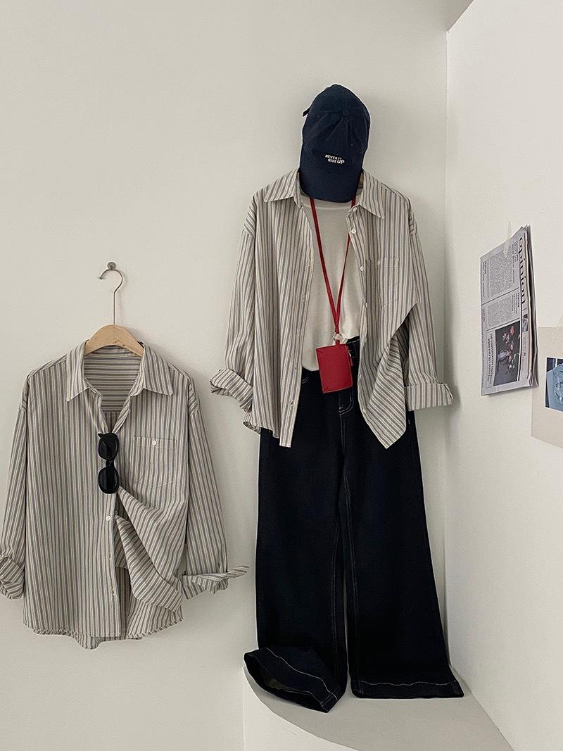Otoño Retro Azul Rayado Manga Larga Pechera Sencilla Multibotones Rayada Cuello Polo Camisa Mujer Holgada Adelgazante Versátil Blusa Top