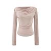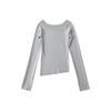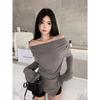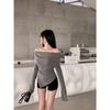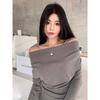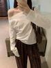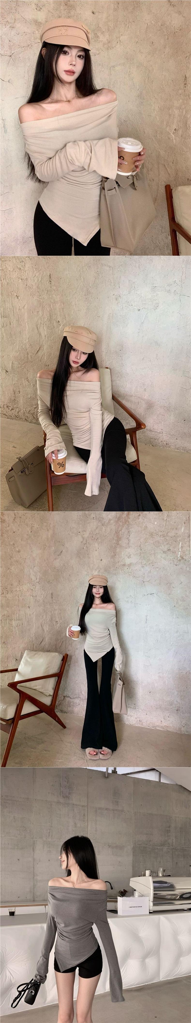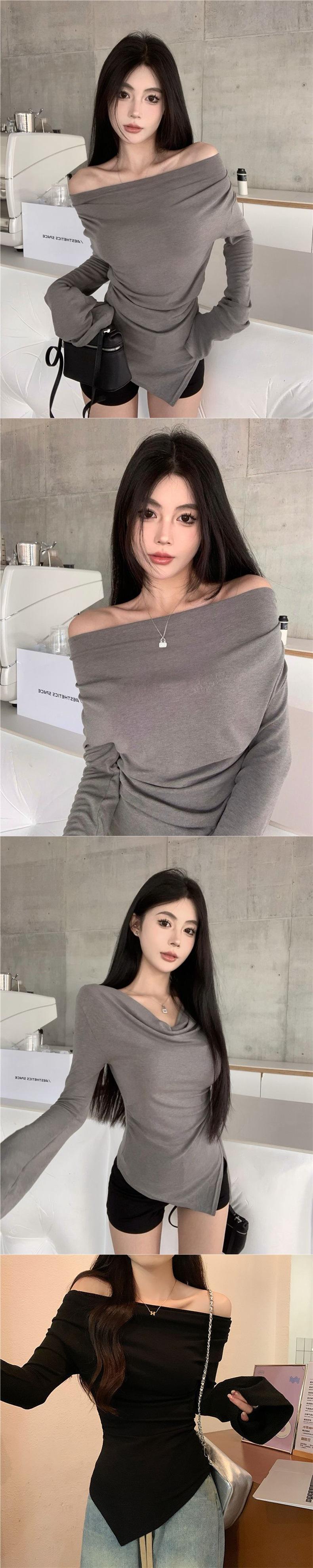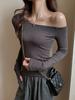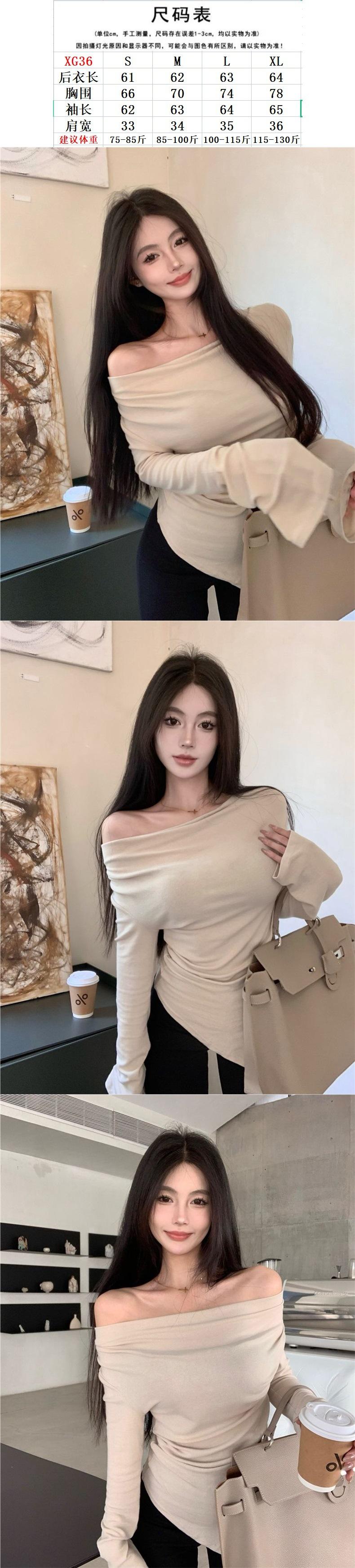 Playera de Manga Larga con Hombros Descubiertos y Cuello Inclinado, Pura y Sexy para Mujer, Otoño, Irregular, Ajustada, Chica Hot, Capa Interior Base