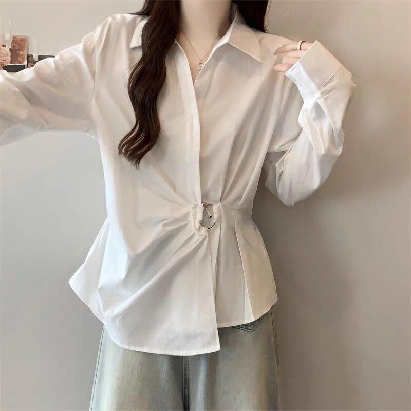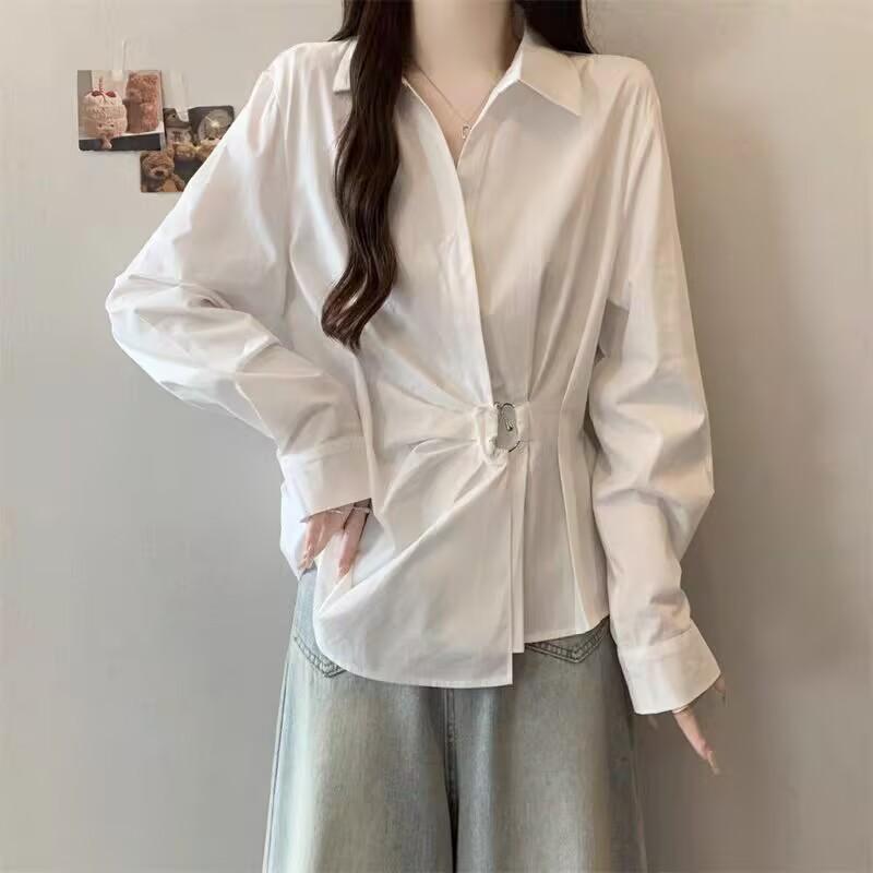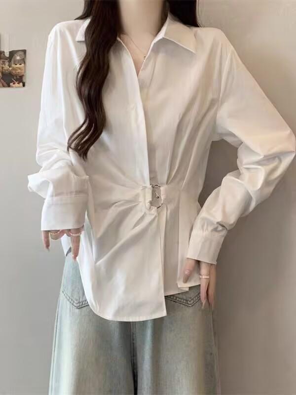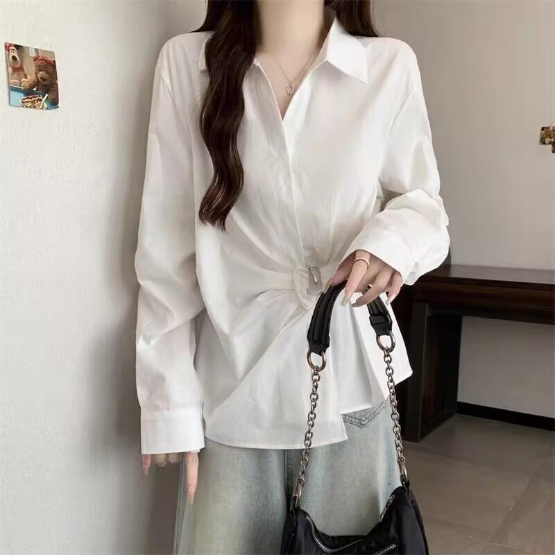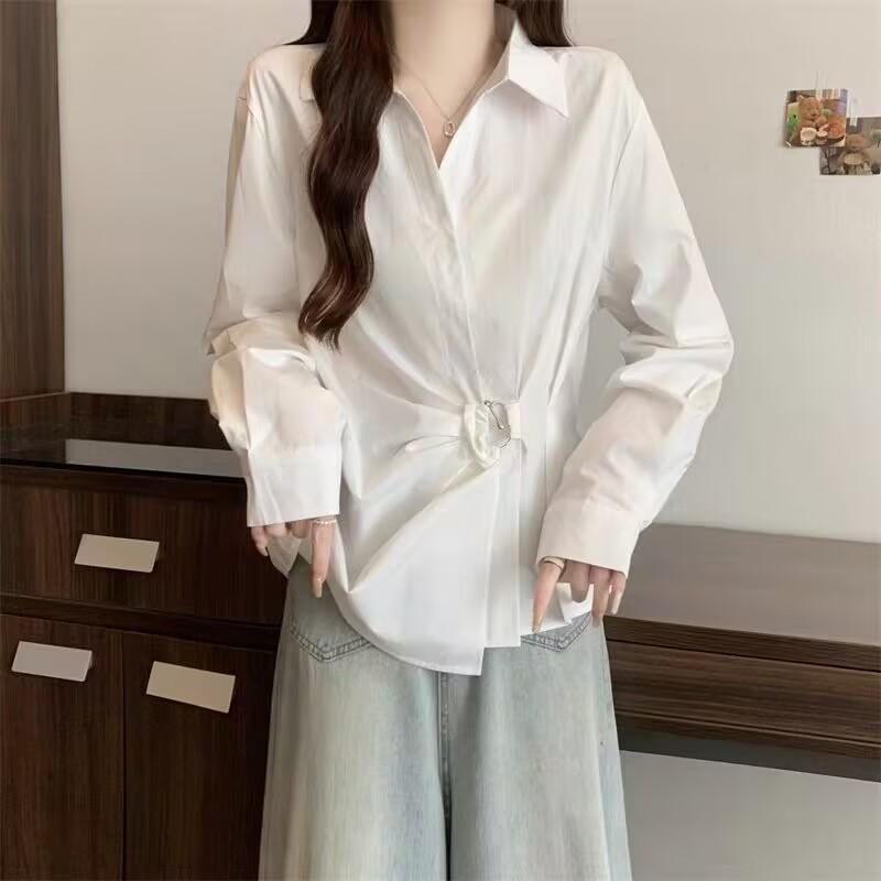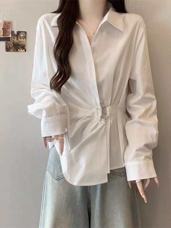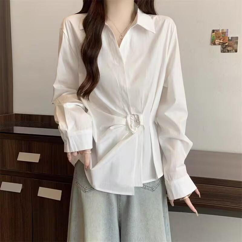 Camisa Blanca Irregular de Cuello en V de Manga Larga para Mujer Primavera y Otoño 2025 Nueva Camisa Holgada de Nicho Versátil Top Adelgazante