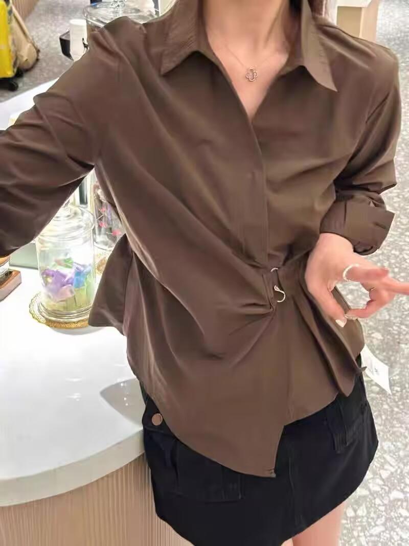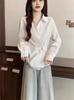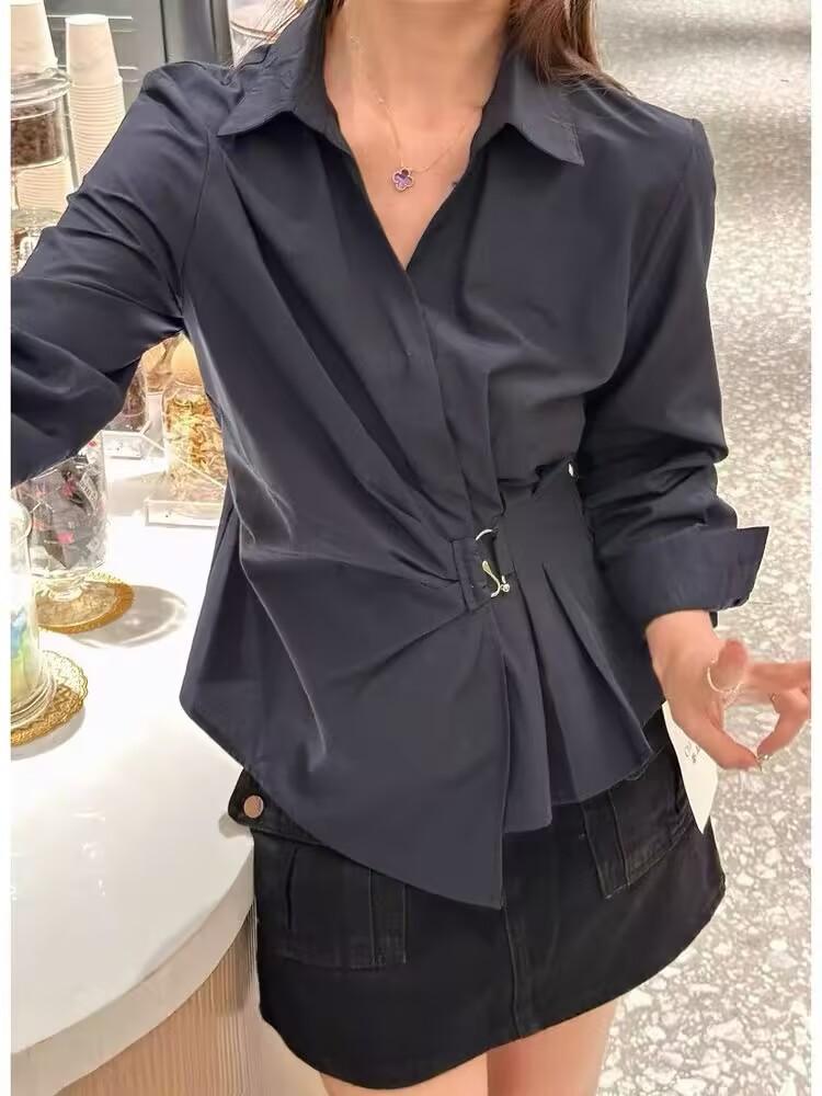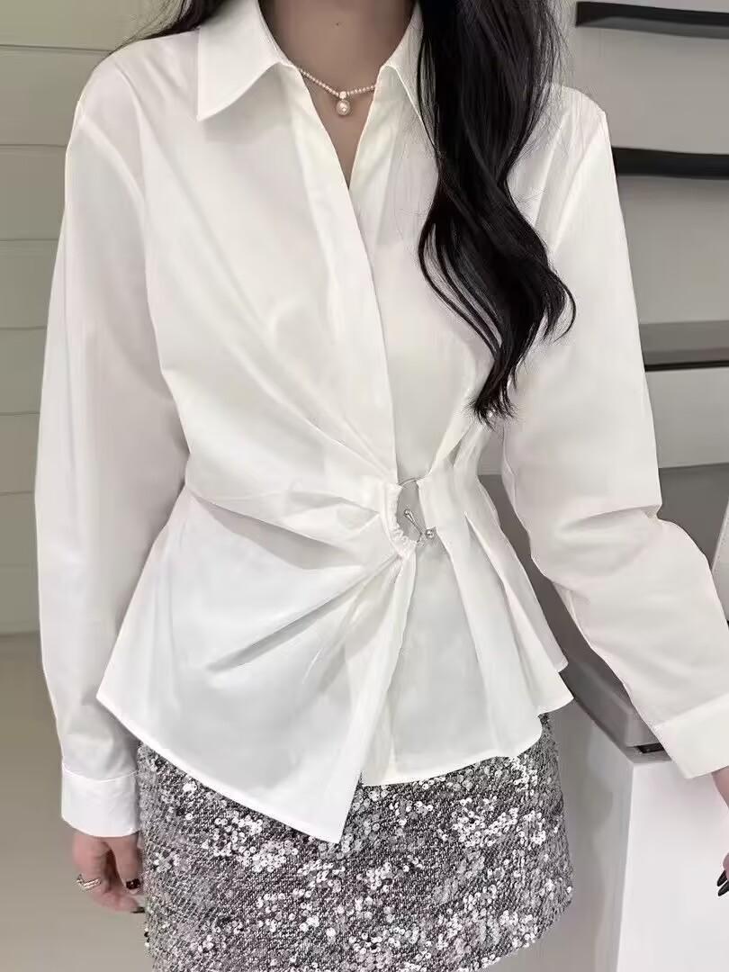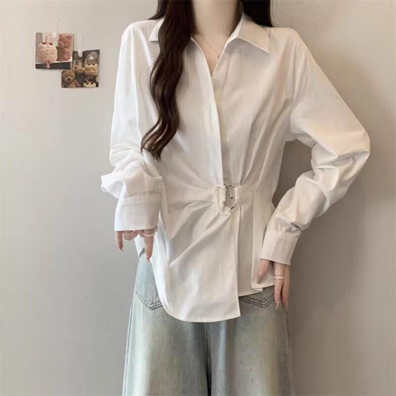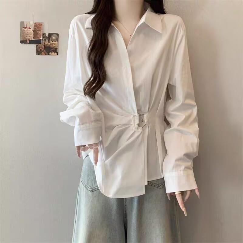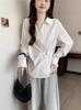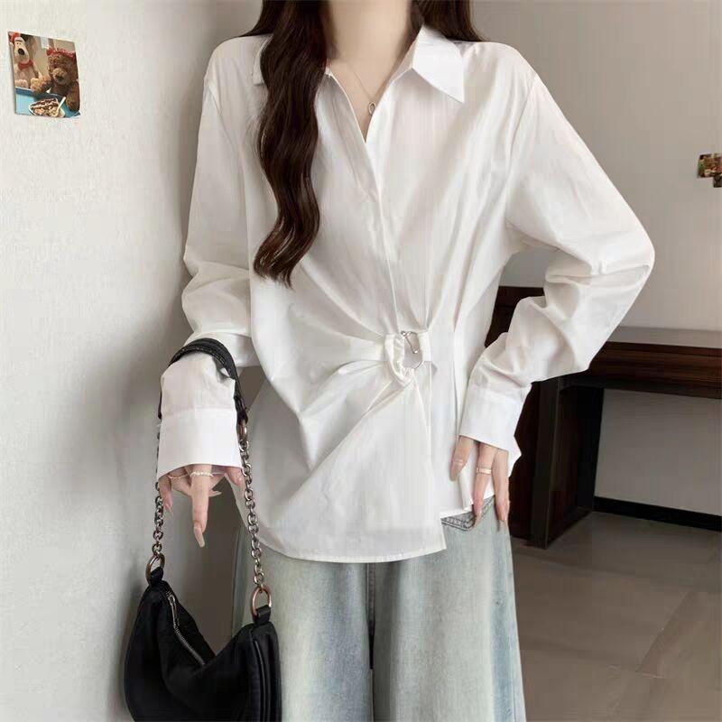 Camisa Blanca Irregular de Cuello en V de Manga Larga para Mujer Primavera y Otoño 2025 Nueva Camisa Holgada de Nicho Versátil Top Adelgazante