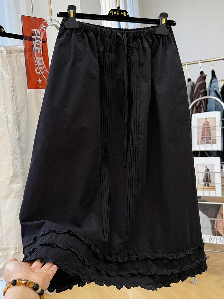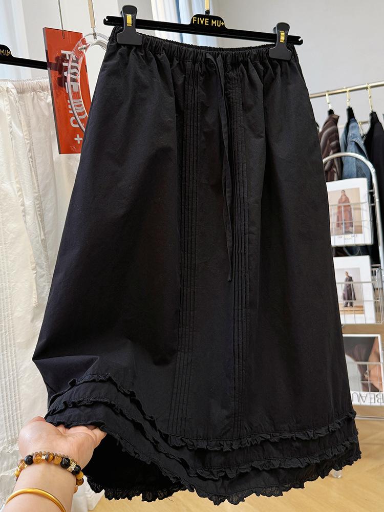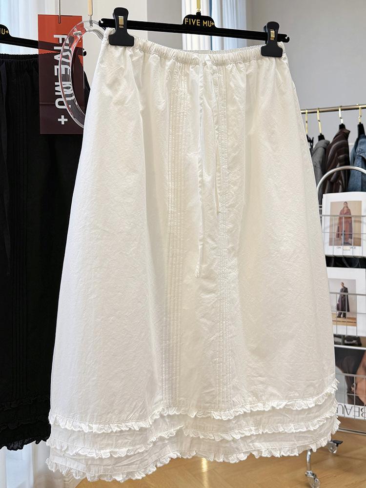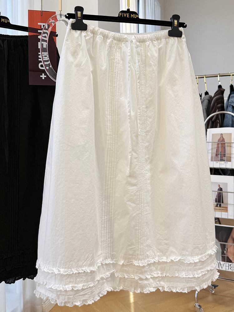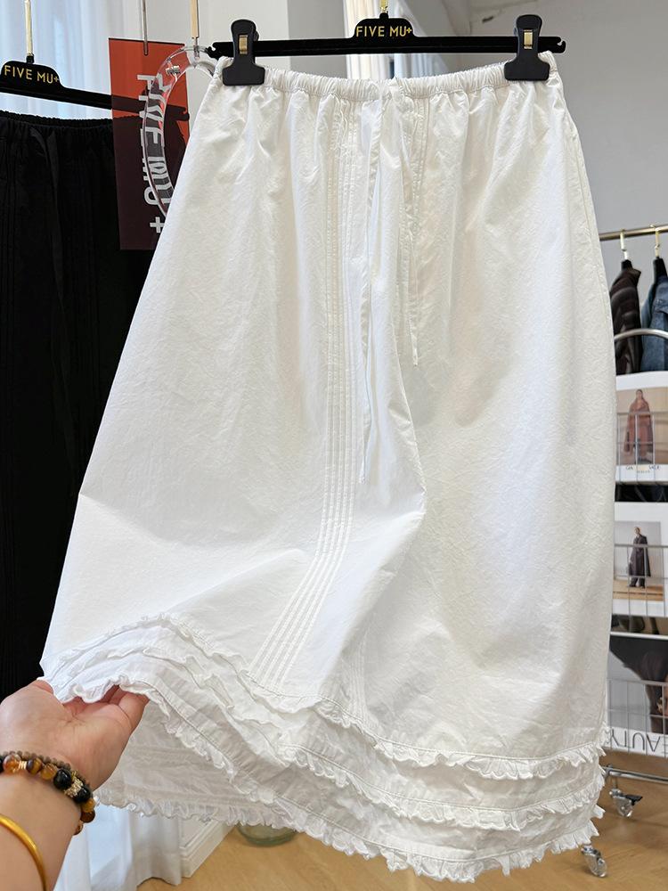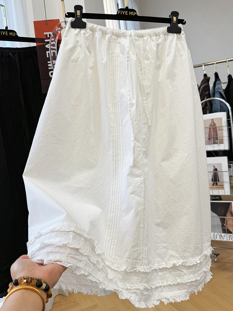 Falda A-line pura de largo medio con cordón en la cintura elástica para mujer Primavera Otoño Adelgazante Borde con volantes Falda bonita única