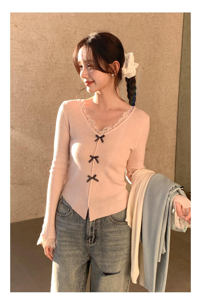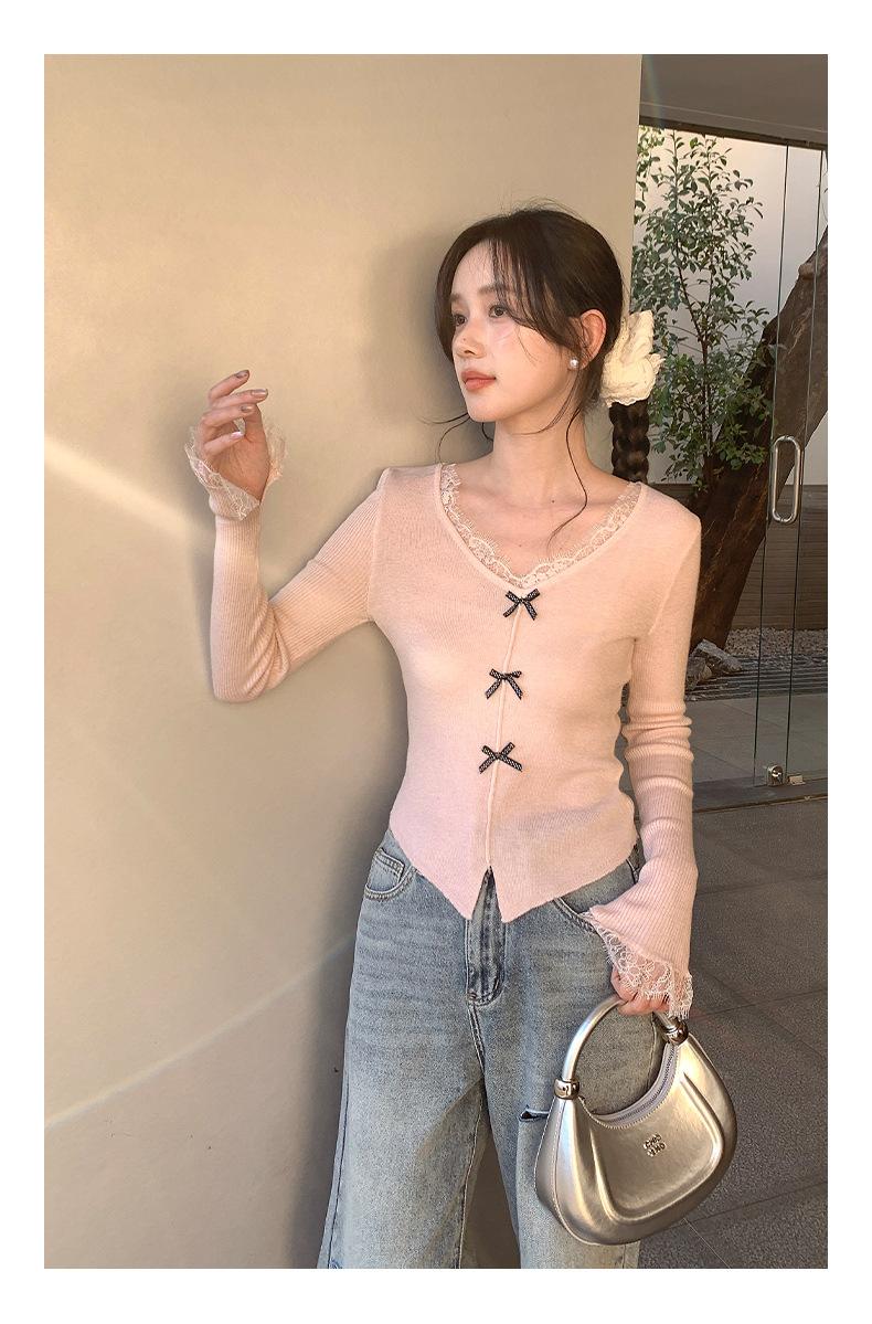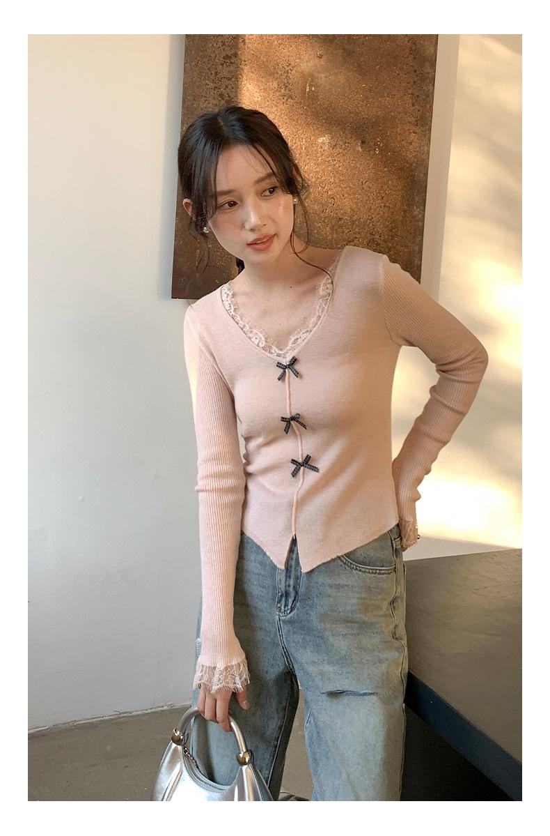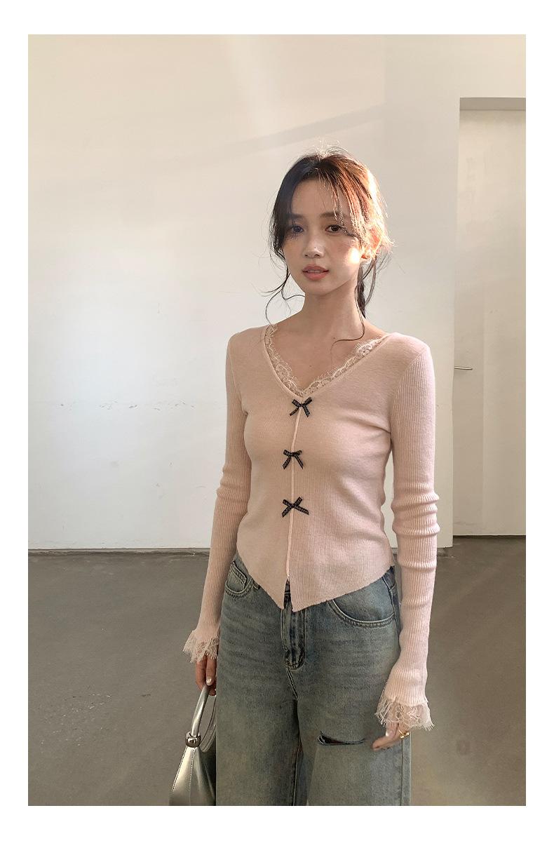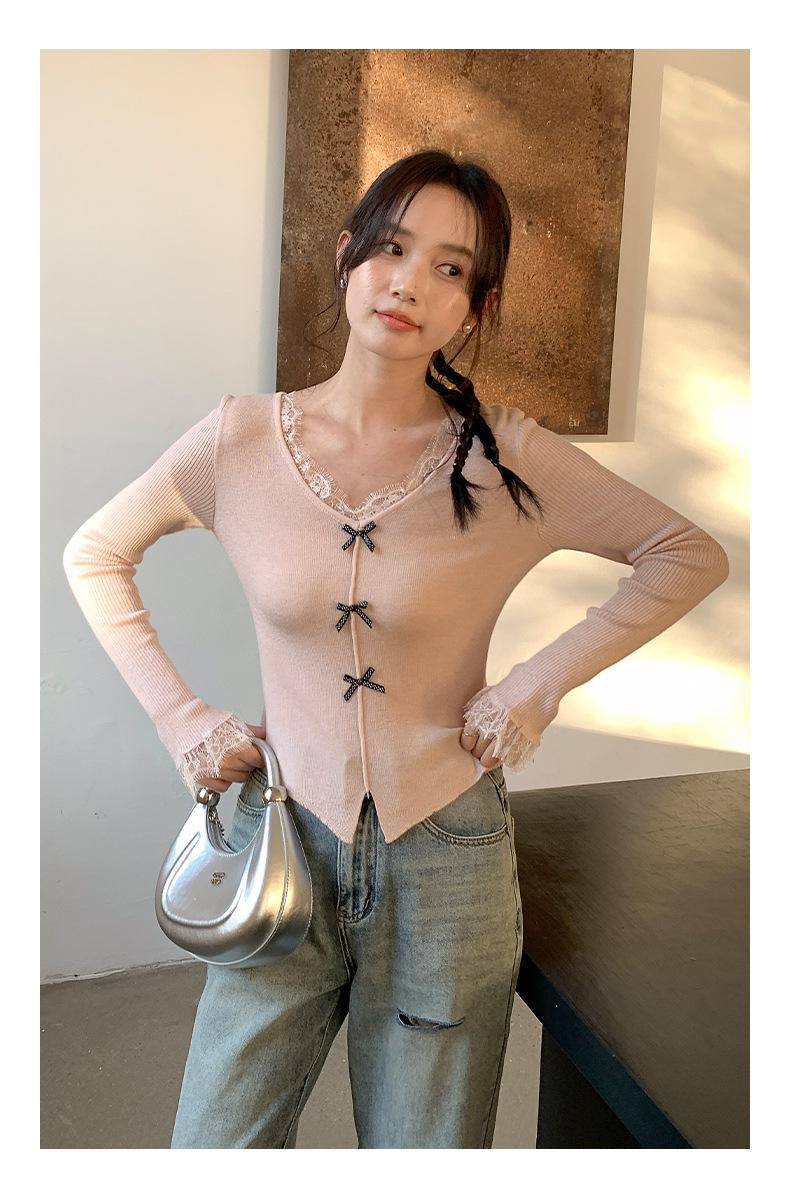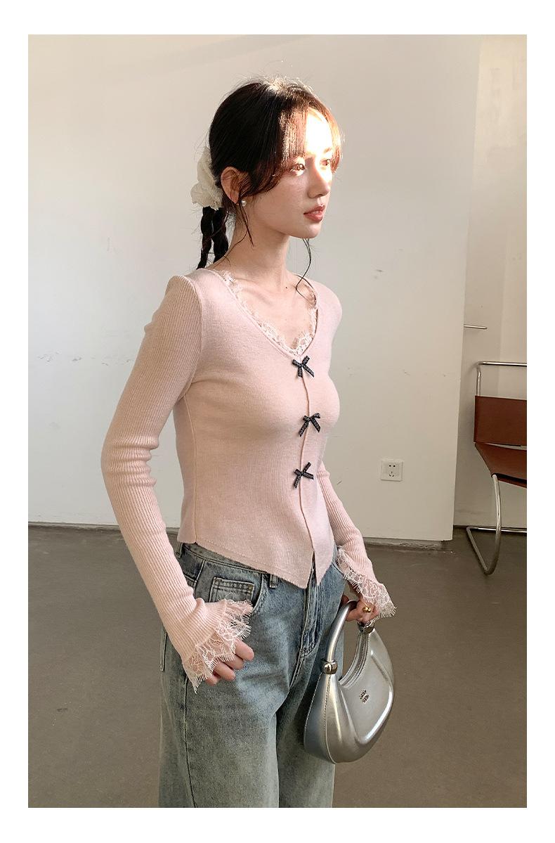 El estilo Yier Shan se ve bien lana corto encaje lazo corte ajustado suéter tejido mujer cuello en V estilo ins 0354