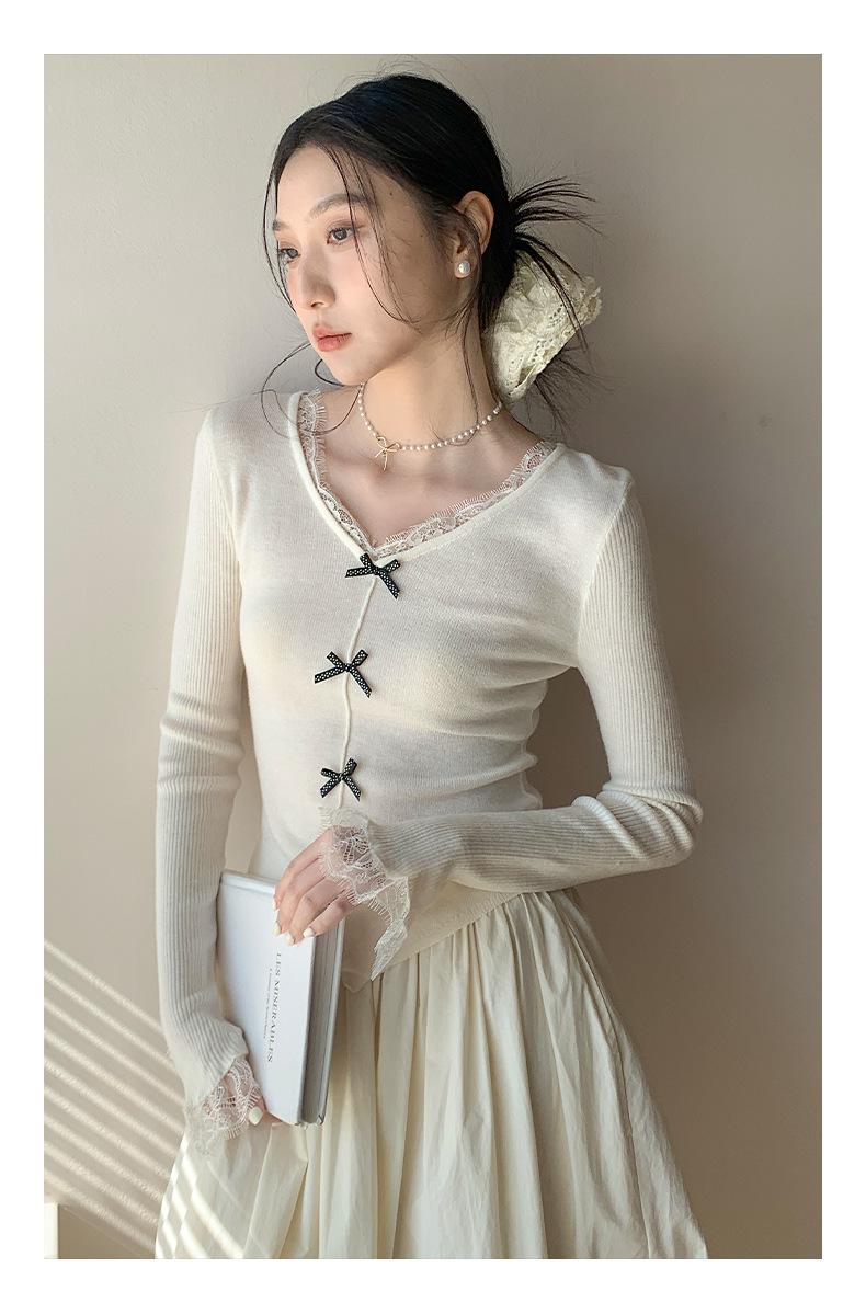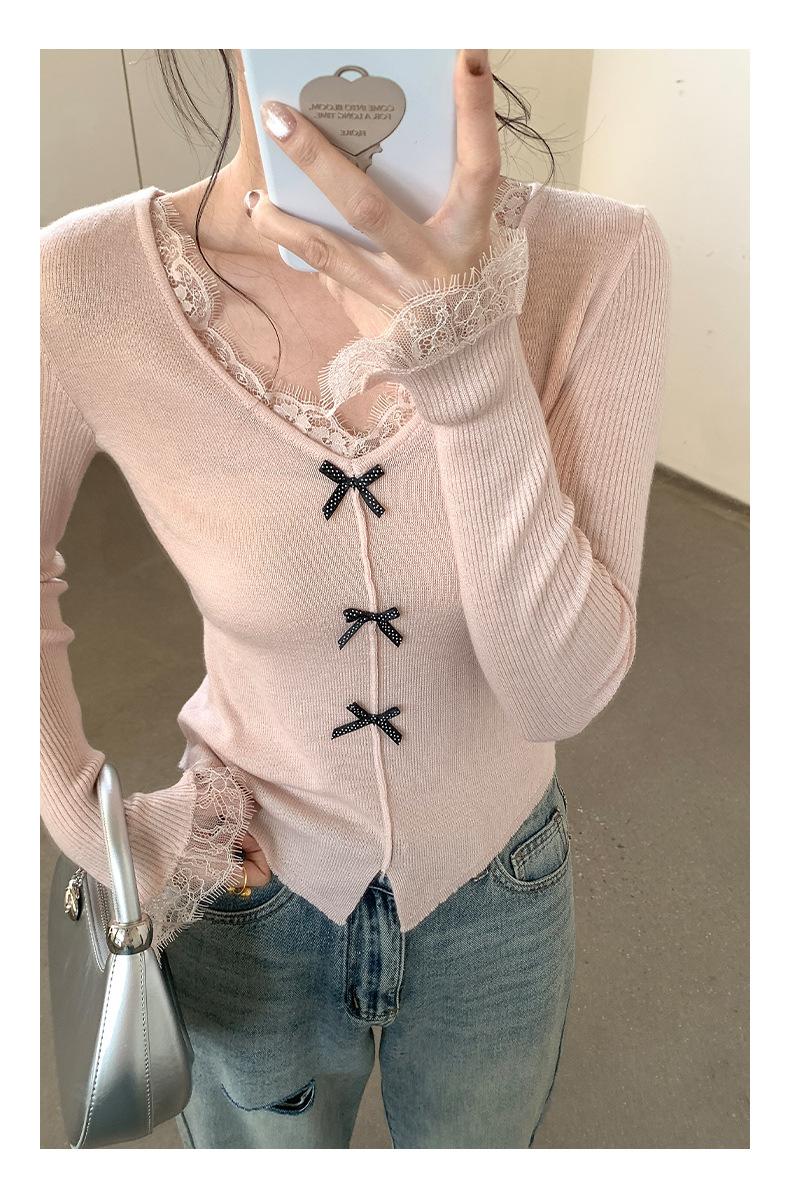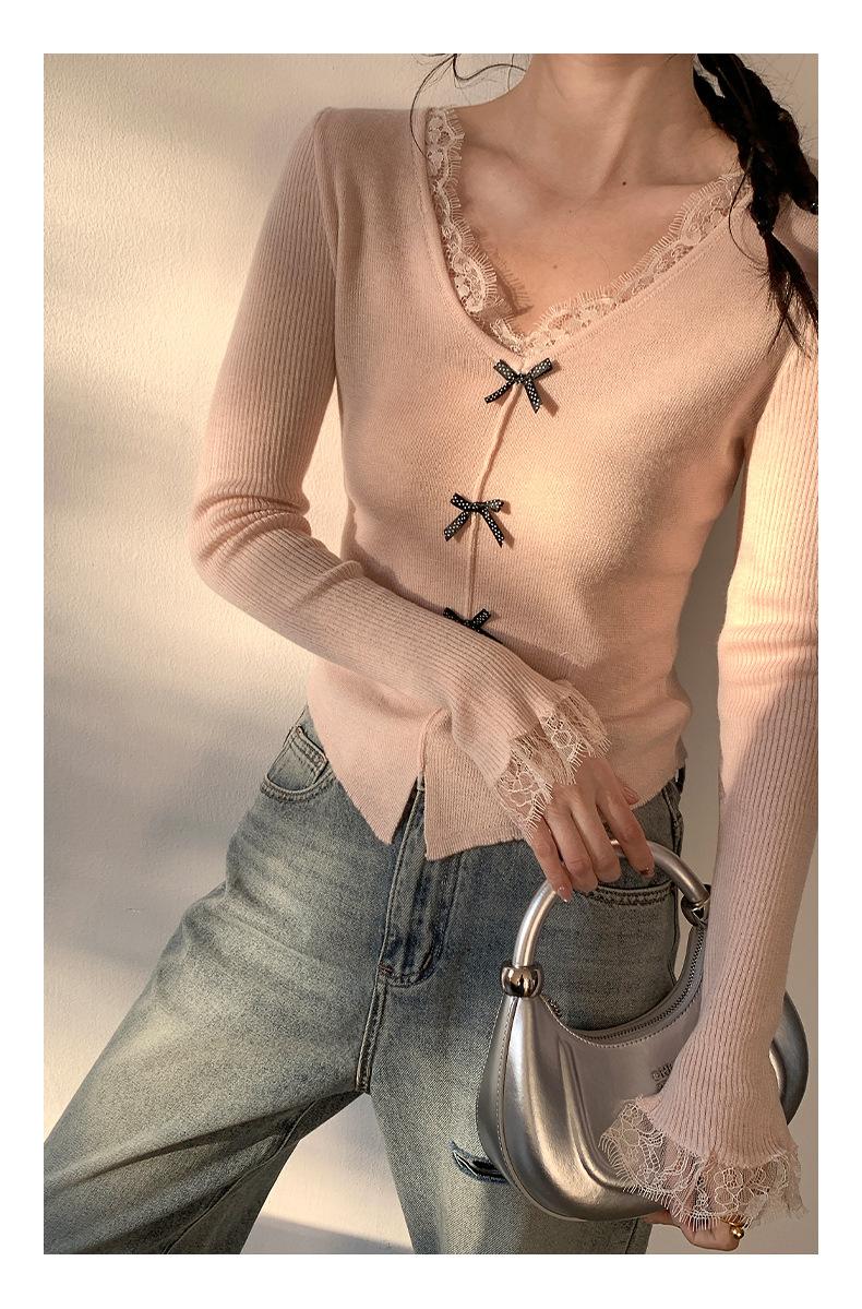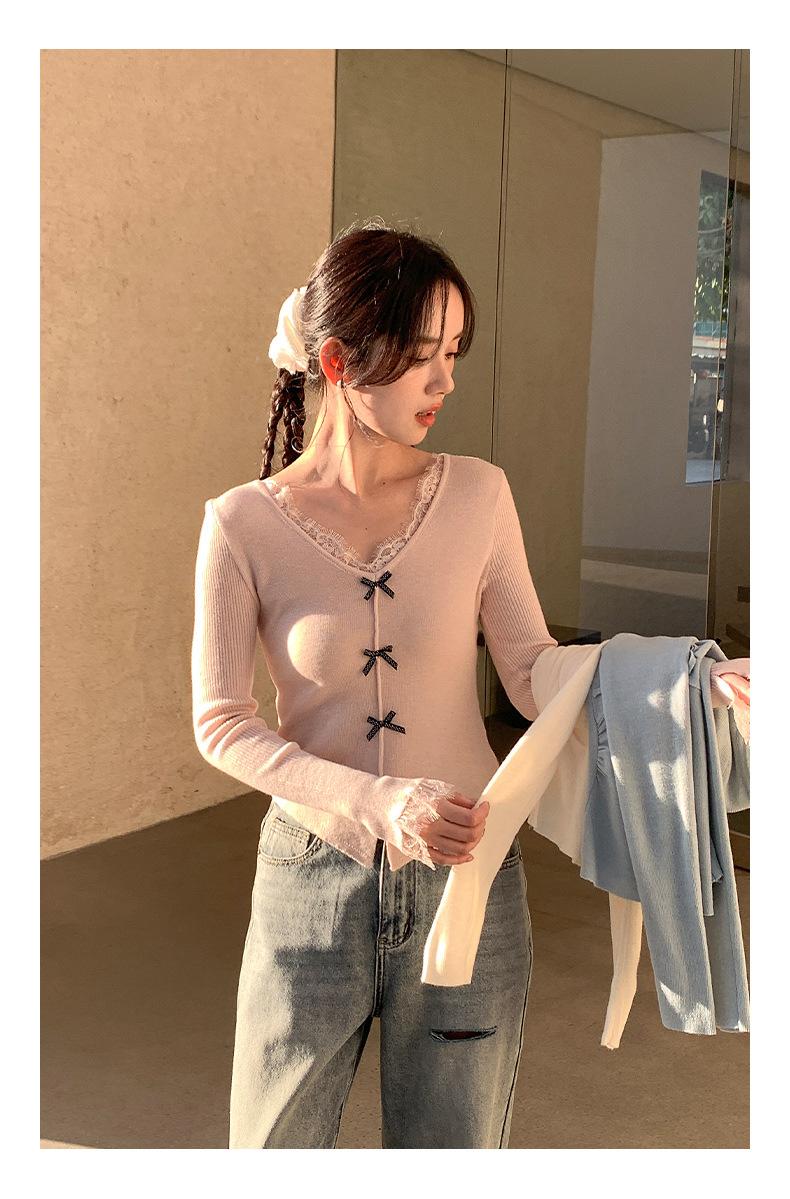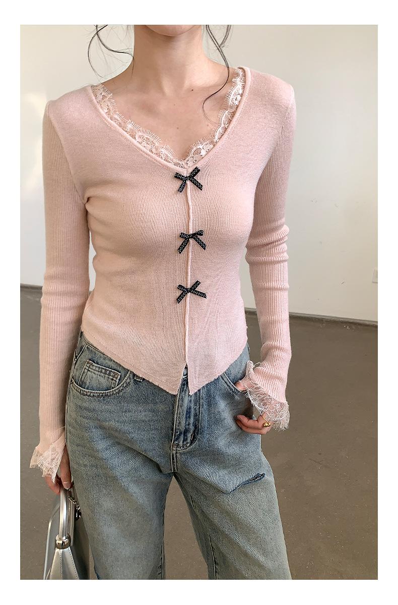 El estilo Yier Shan se ve bien lana corto encaje lazo corte ajustado suéter tejido mujer cuello en V estilo ins 0354