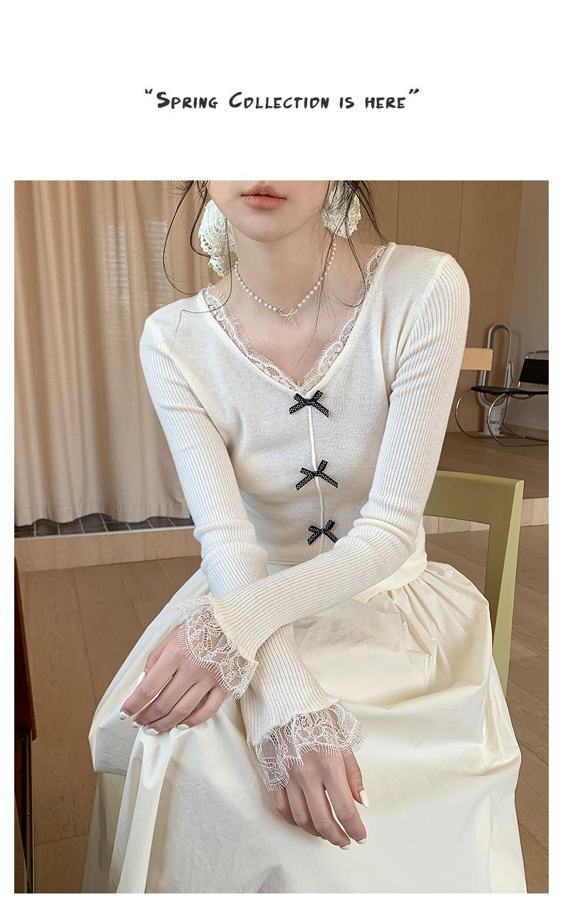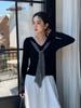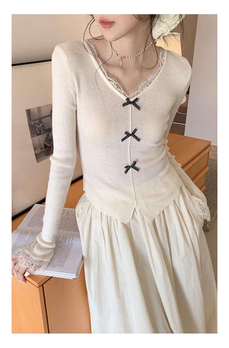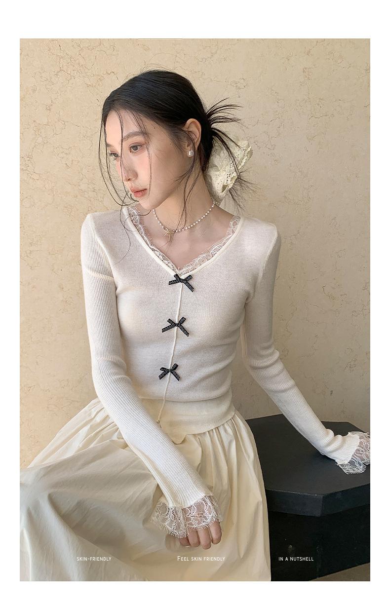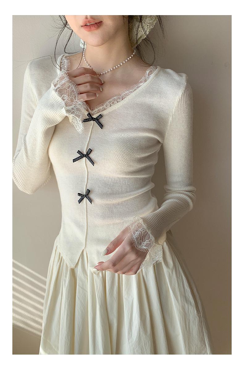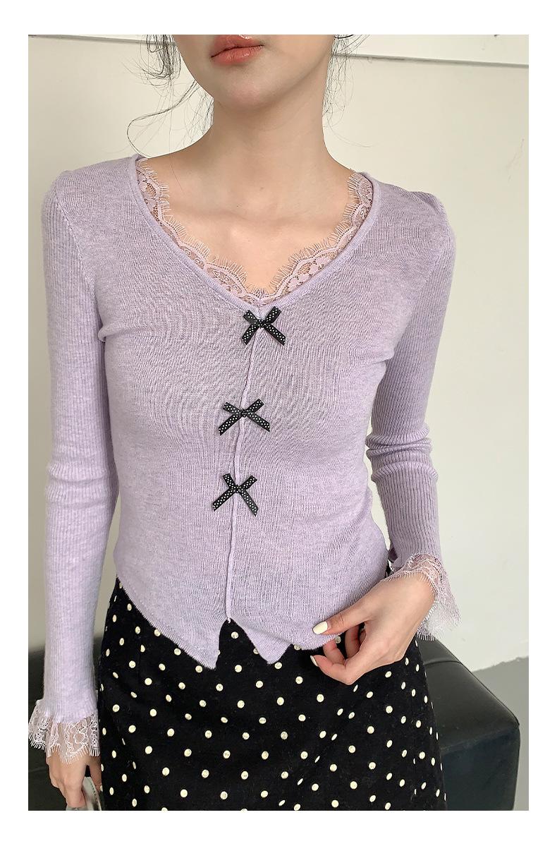 El estilo Yier Shan se ve bien lana corto encaje lazo corte ajustado suéter tejido mujer cuello en V estilo ins 0354