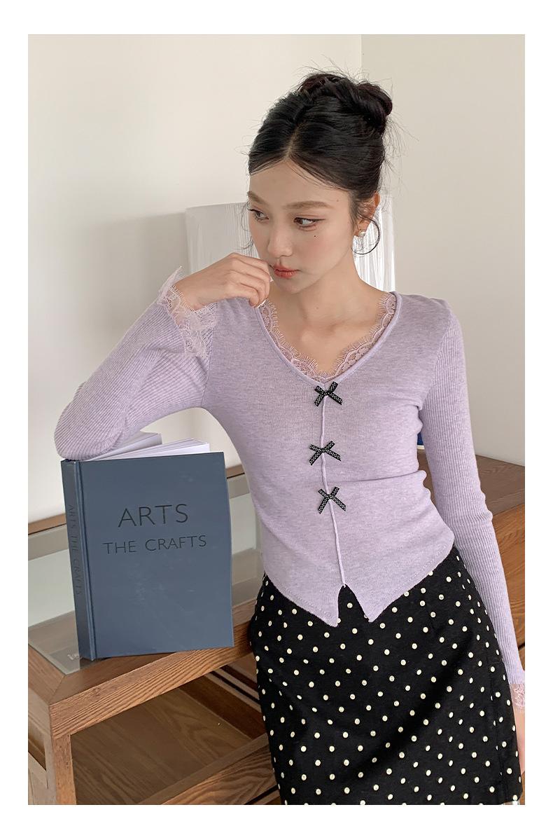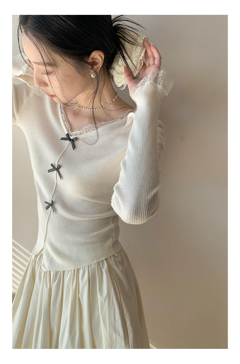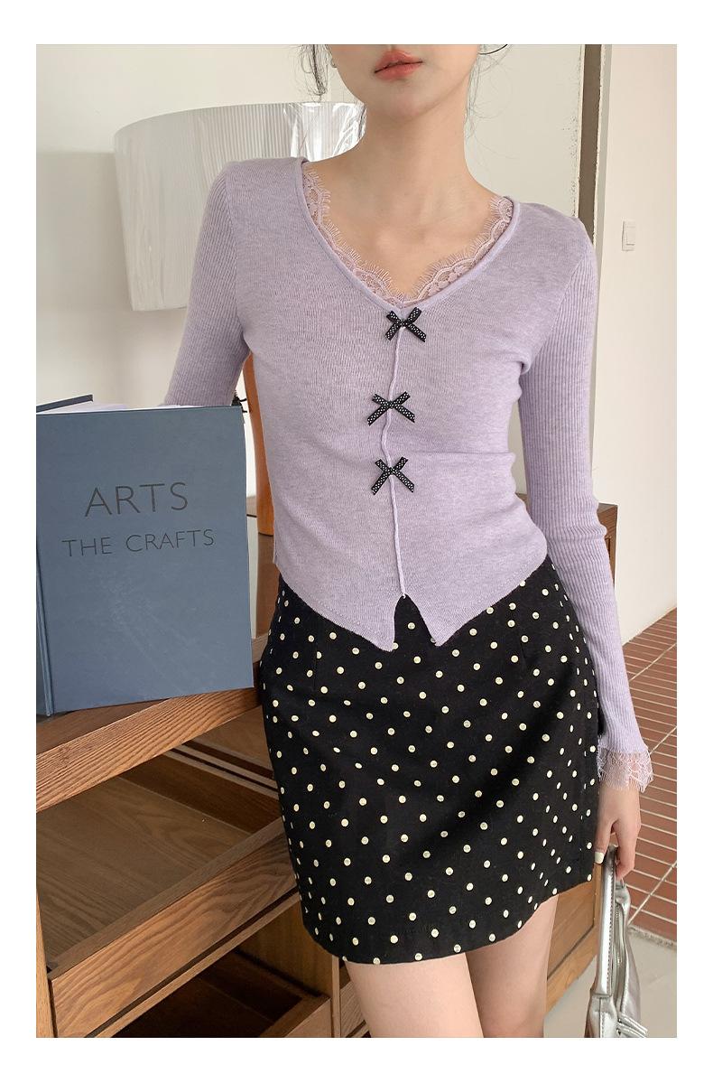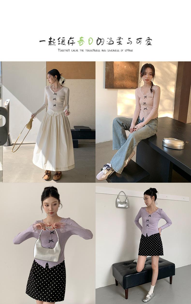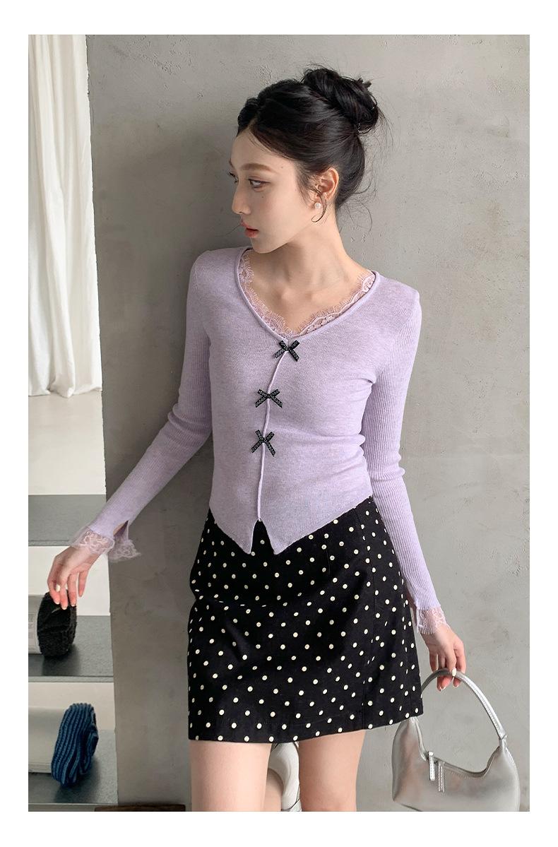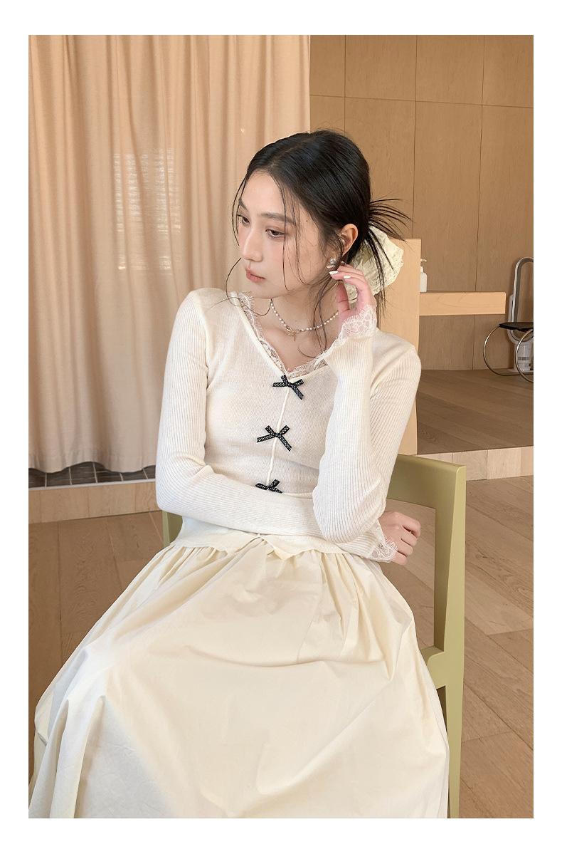 El estilo Yier Shan se ve bien lana corto encaje lazo corte ajustado suéter tejido mujer cuello en V estilo ins 0354