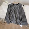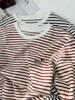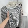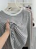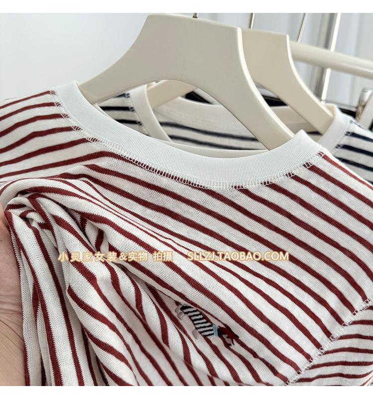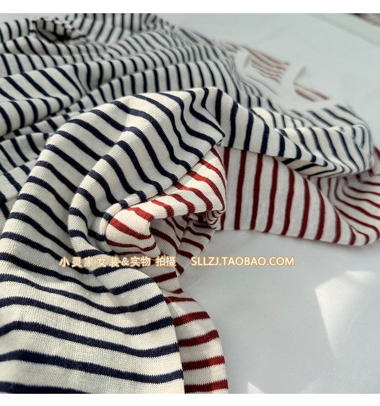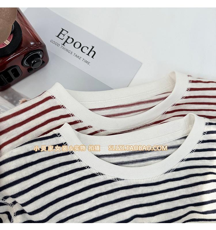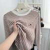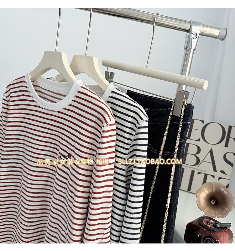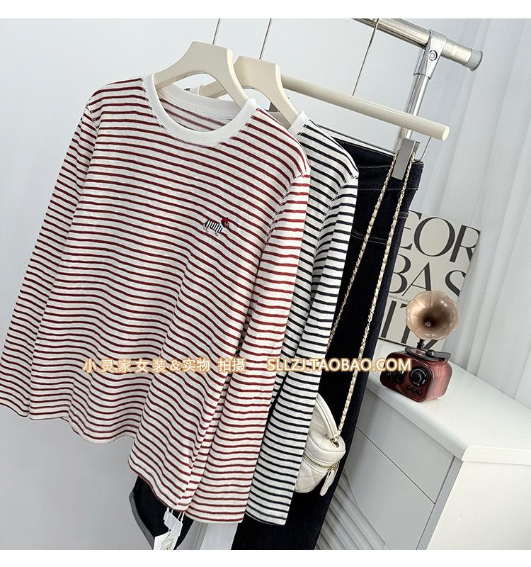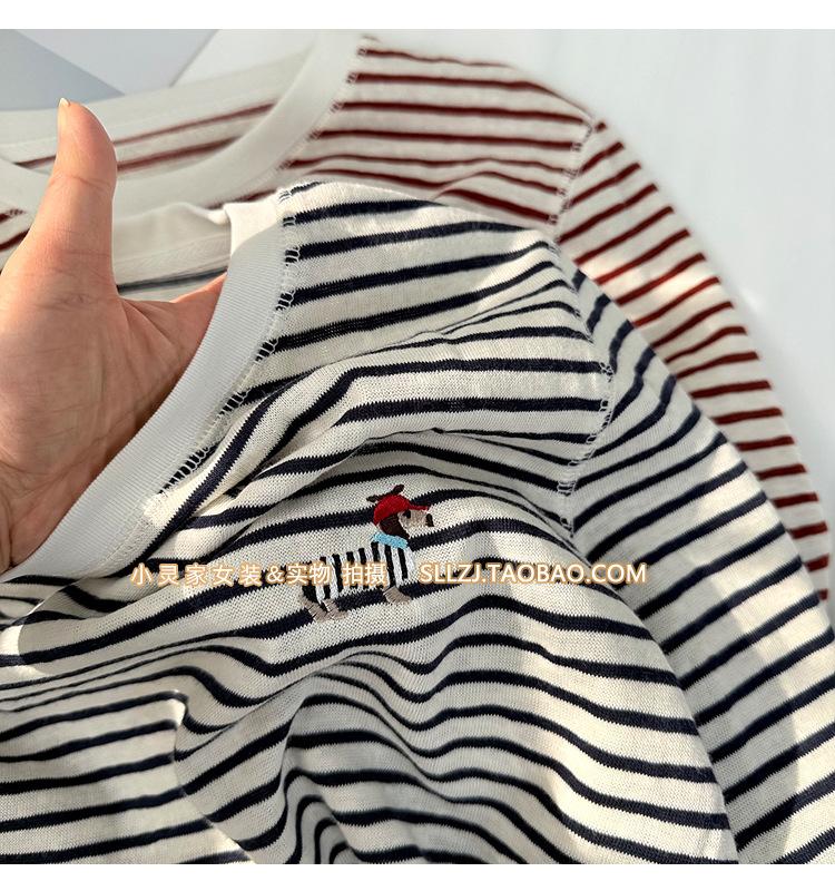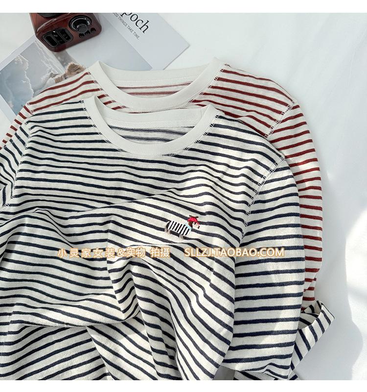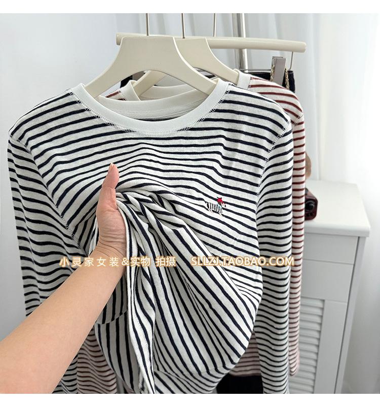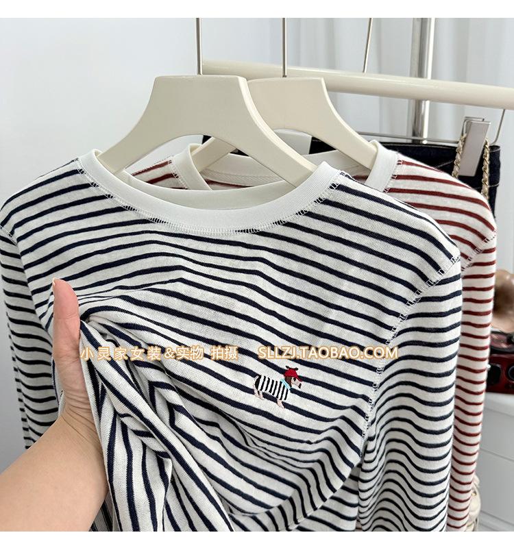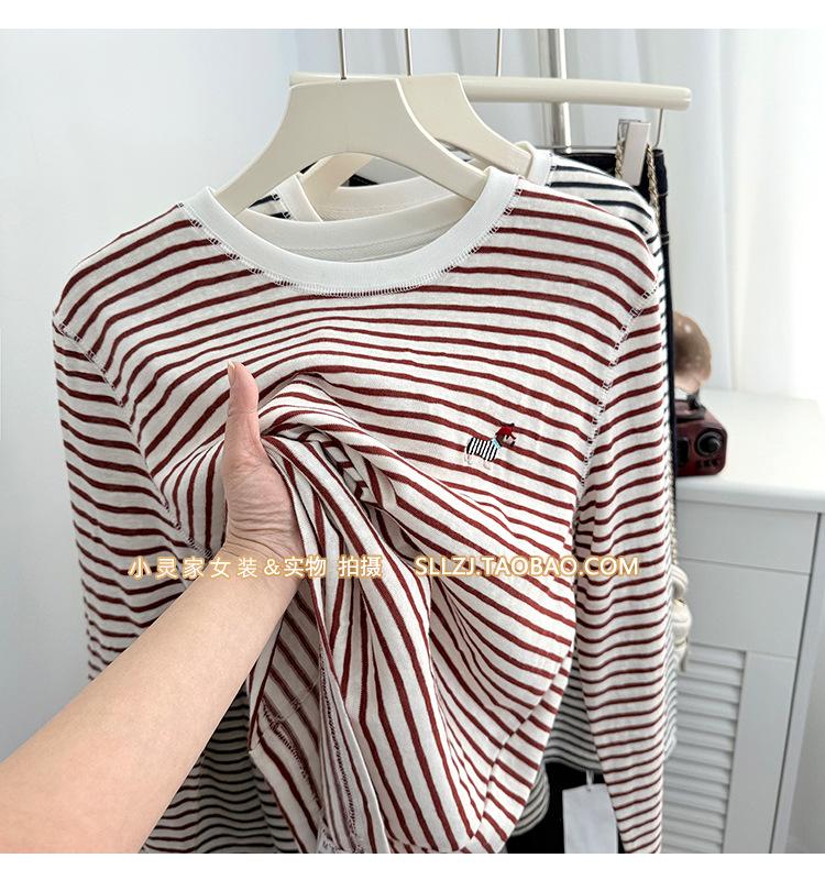 Camiseta de manga larga a rayas de algodón de bambú para mujer, primavera y otoño, delgada, sencilla, con bordado, que reduce la edad, moderna, holgada, con cuello redondo, top básico