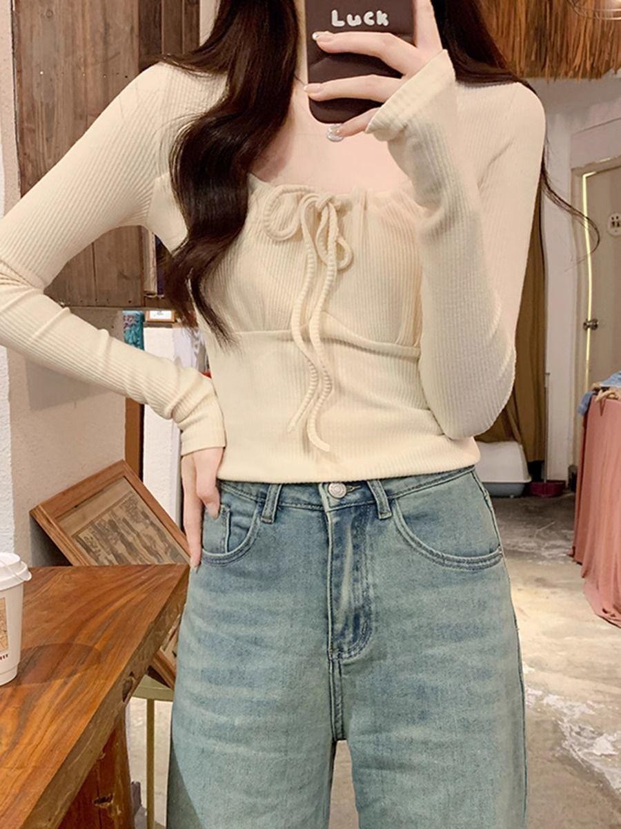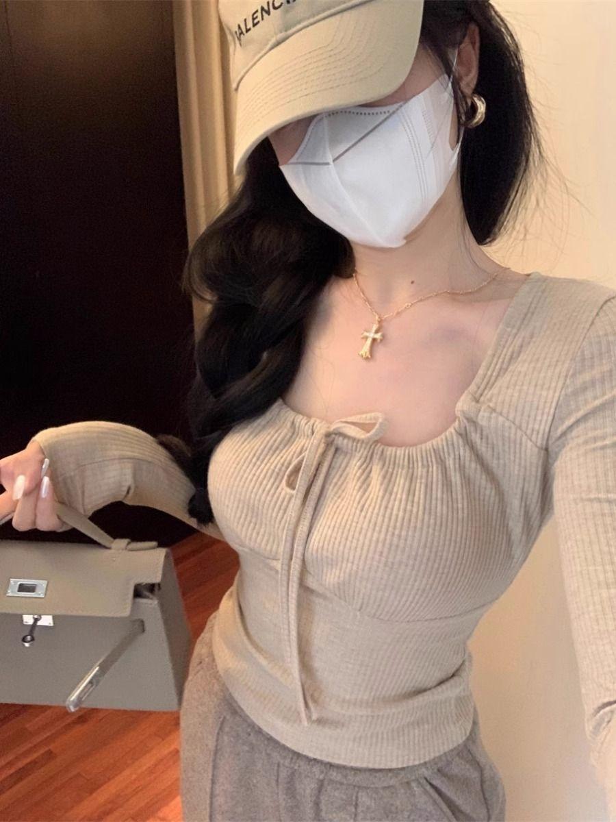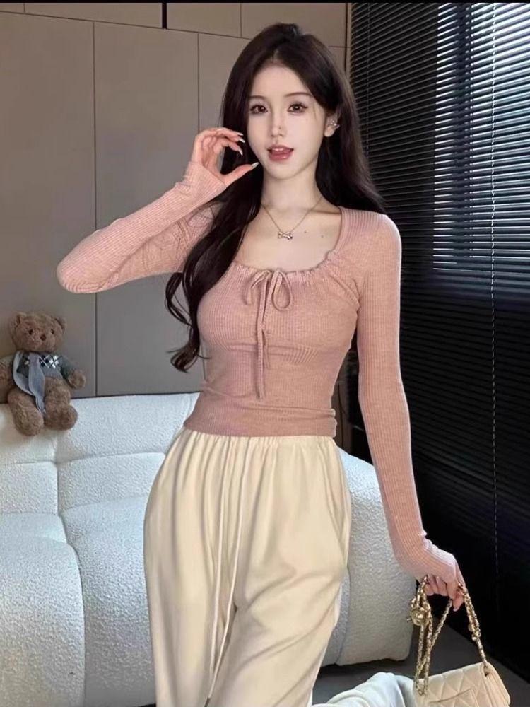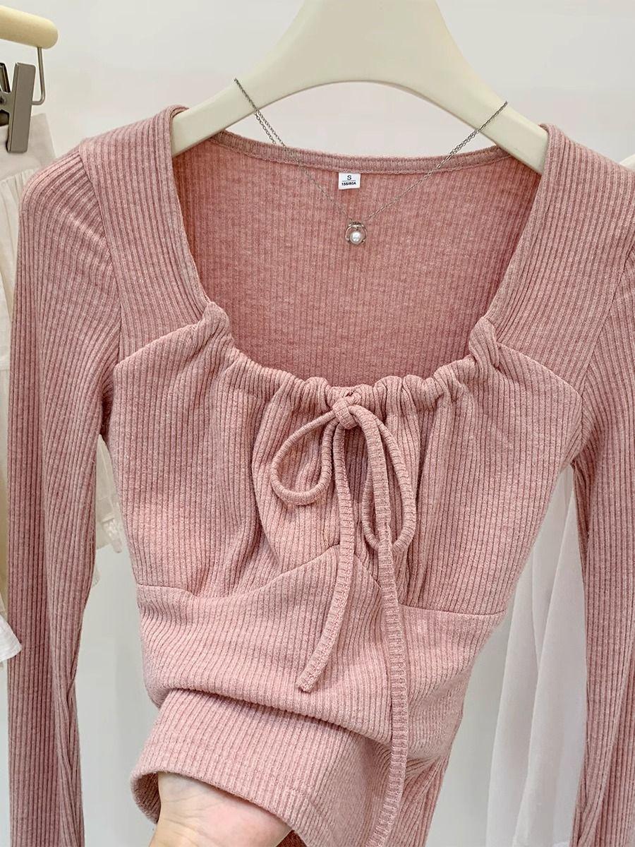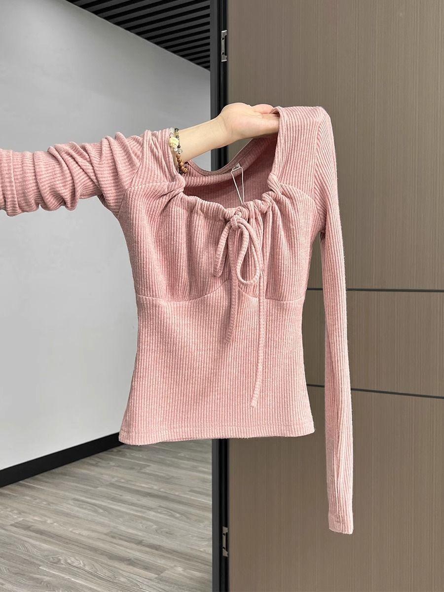 Playera Rosa de Manga Larga 2025 para Mujer en Otoño e Invierno con Escote Grande y Camiseta Interior para Top Corto Sexy Ajustado con Cordones