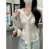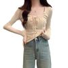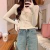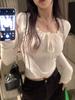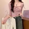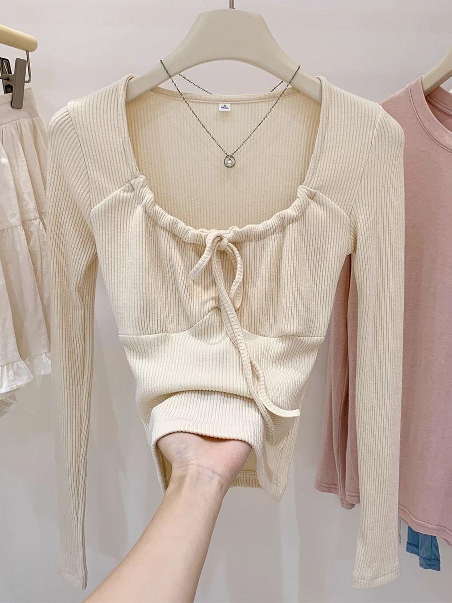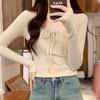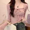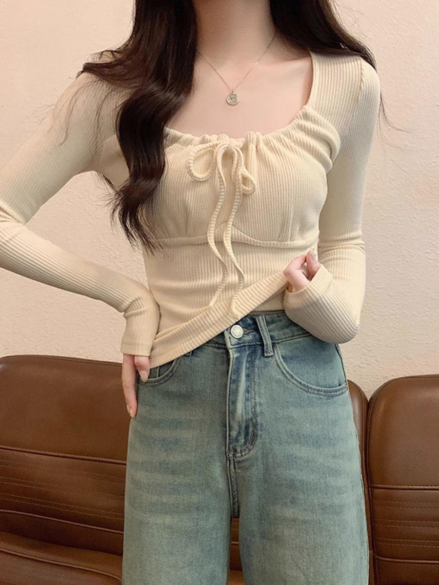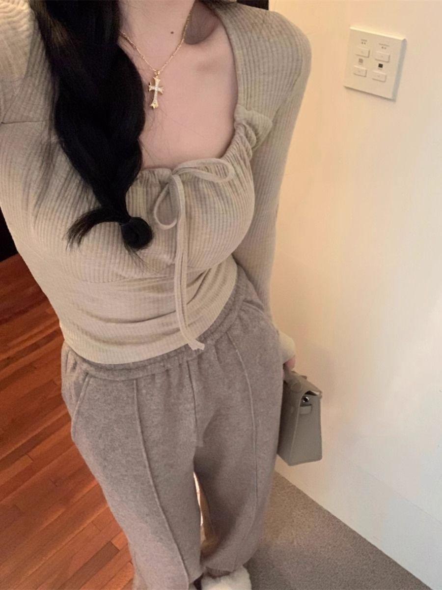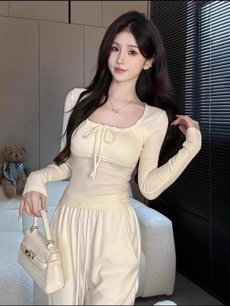 Playera Rosa de Manga Larga 2025 para Mujer en Otoño e Invierno con Escote Grande y Camiseta Interior para Top Corto Sexy Ajustado con Cordones