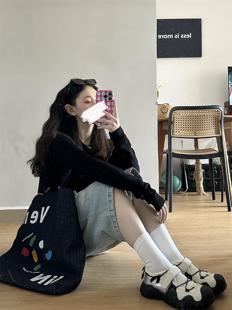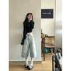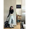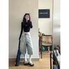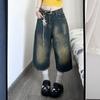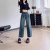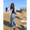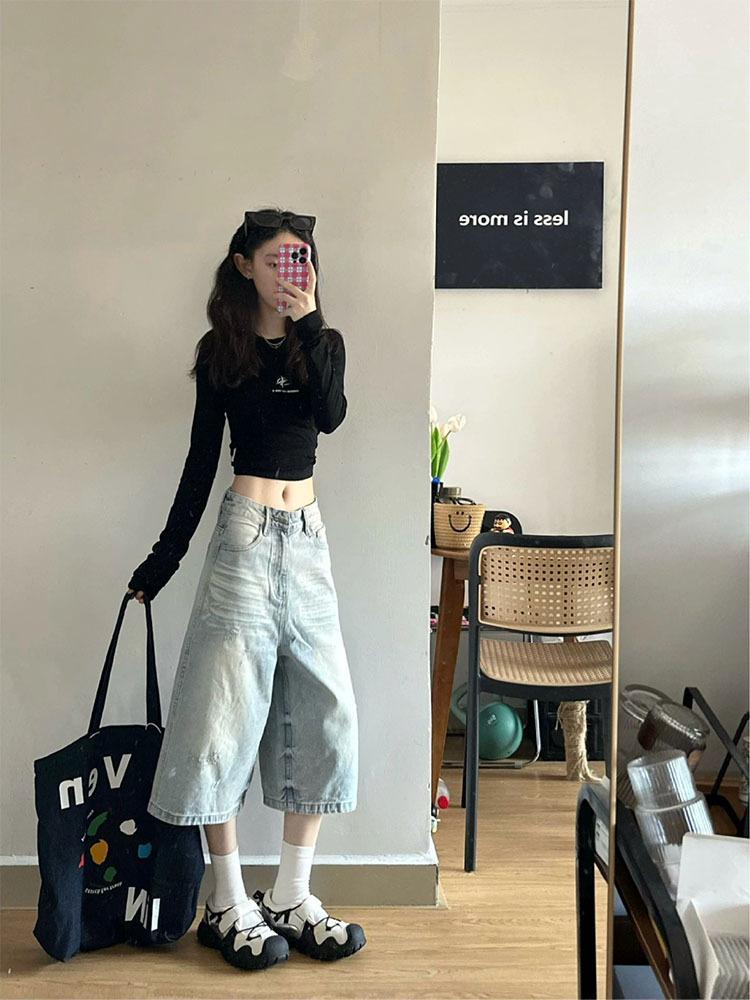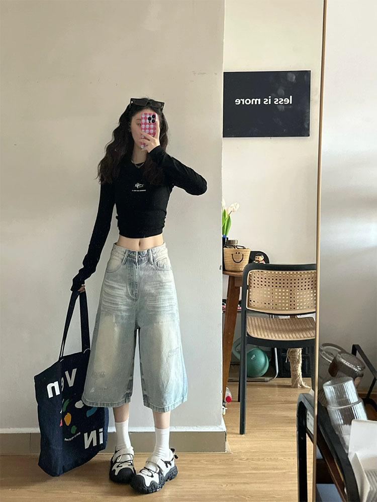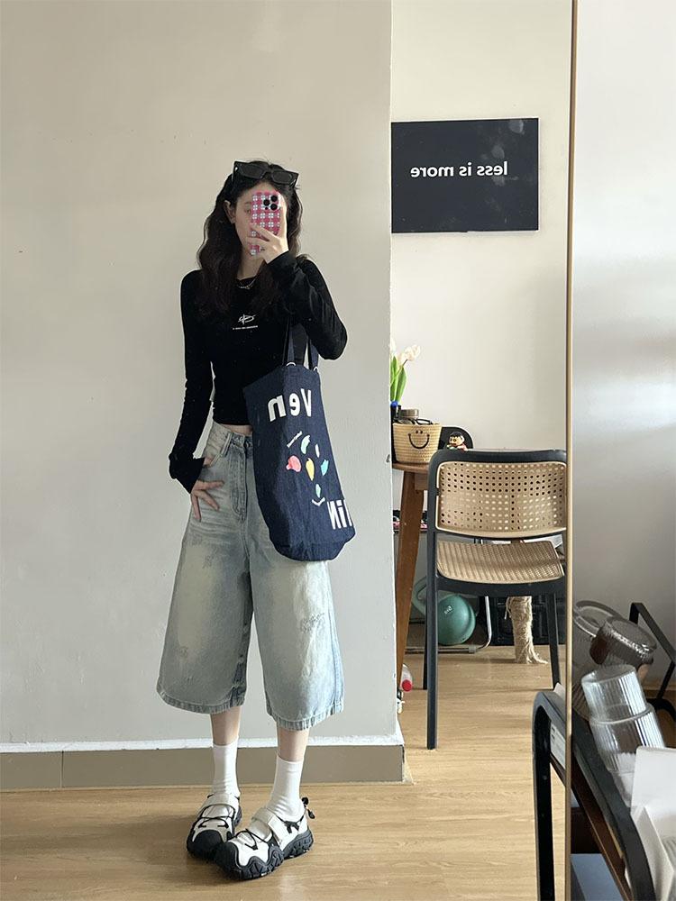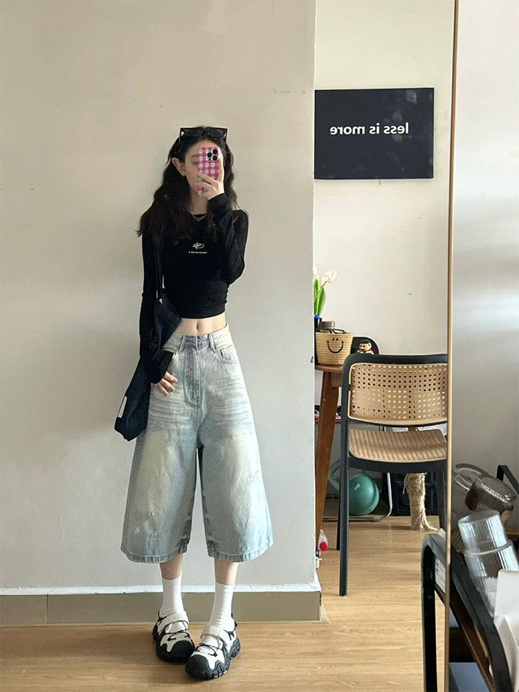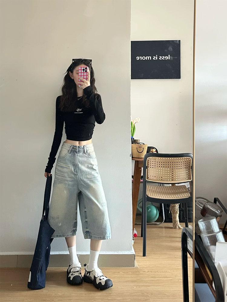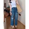 Jeans Retro Azul Claro de Talla Grande de Pierna Ancha para Mujer Verano Gordo mm Pantalones Recortados Sueltos de Cintura Alta Rotos Rectos Pantalones Medios