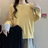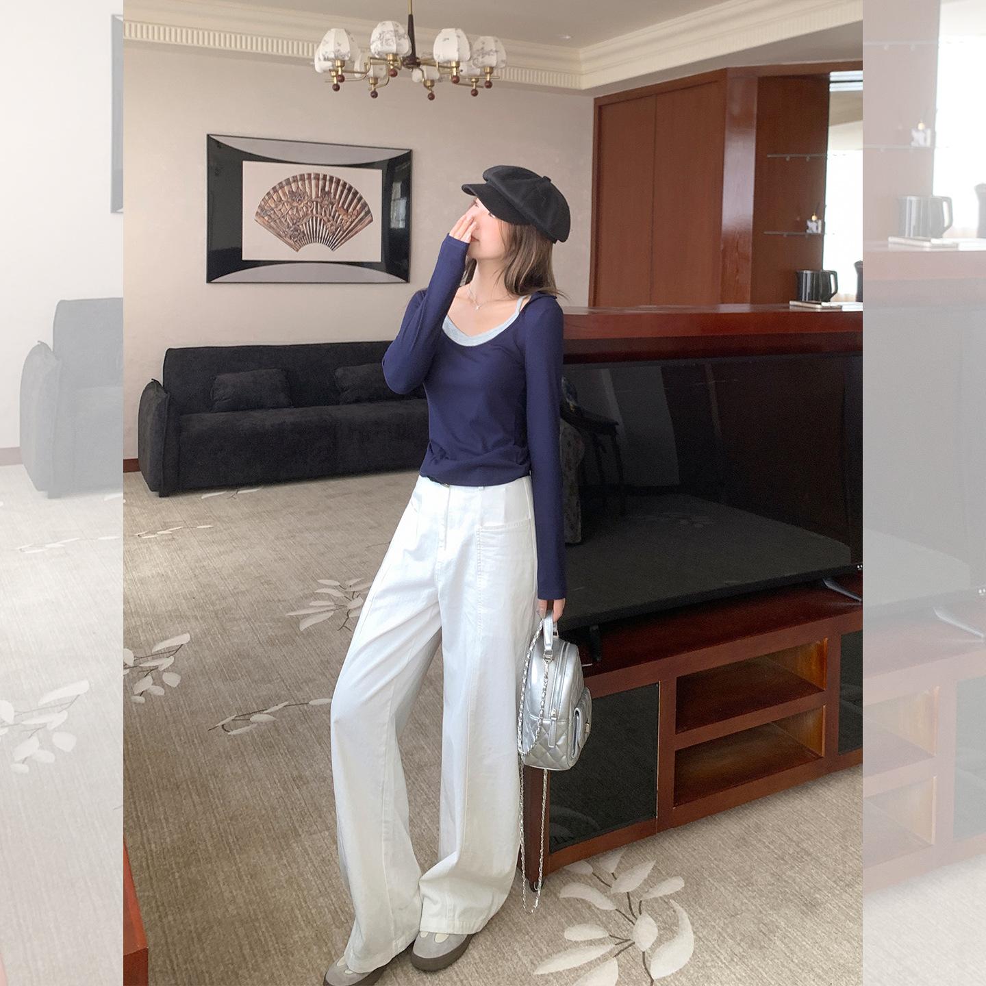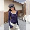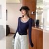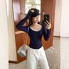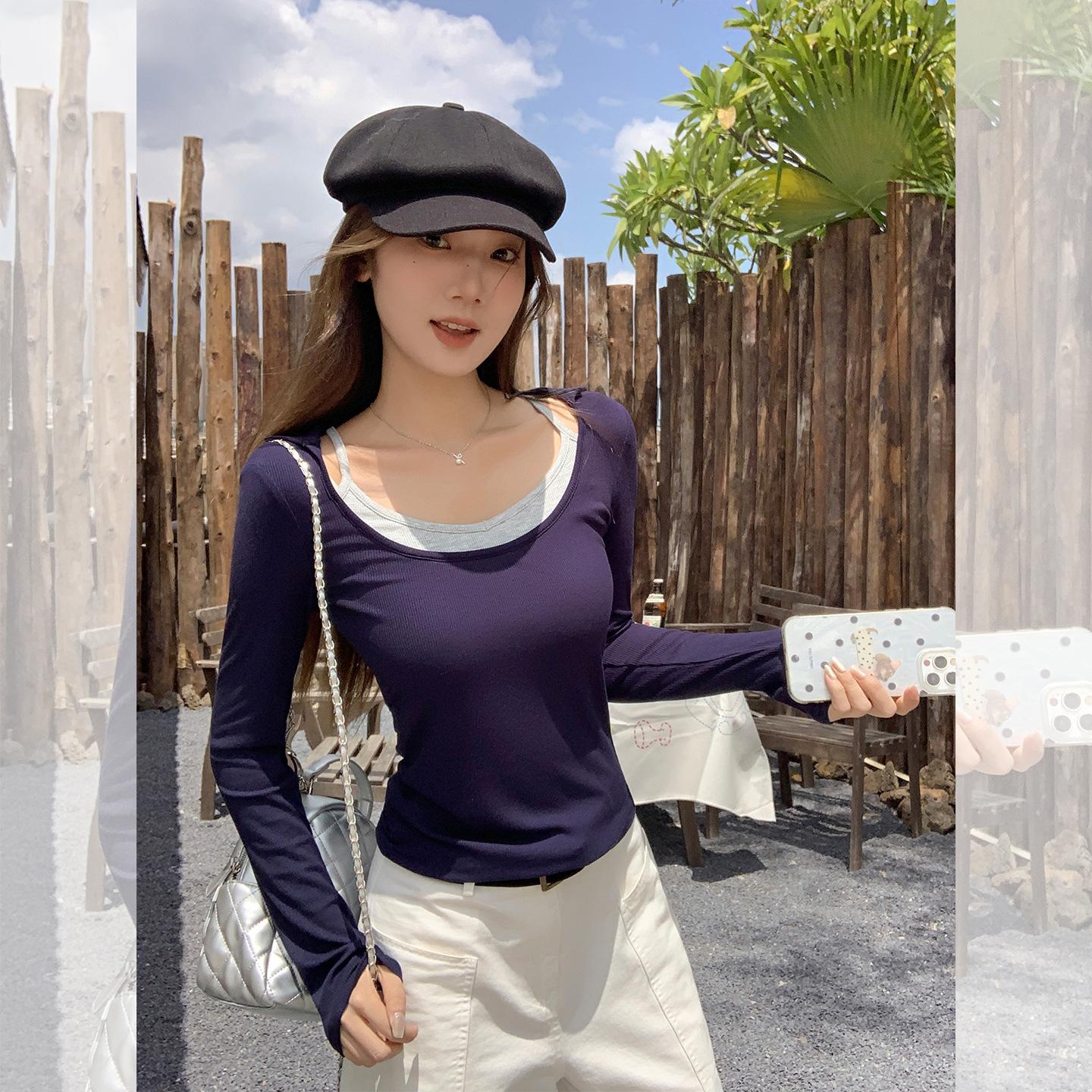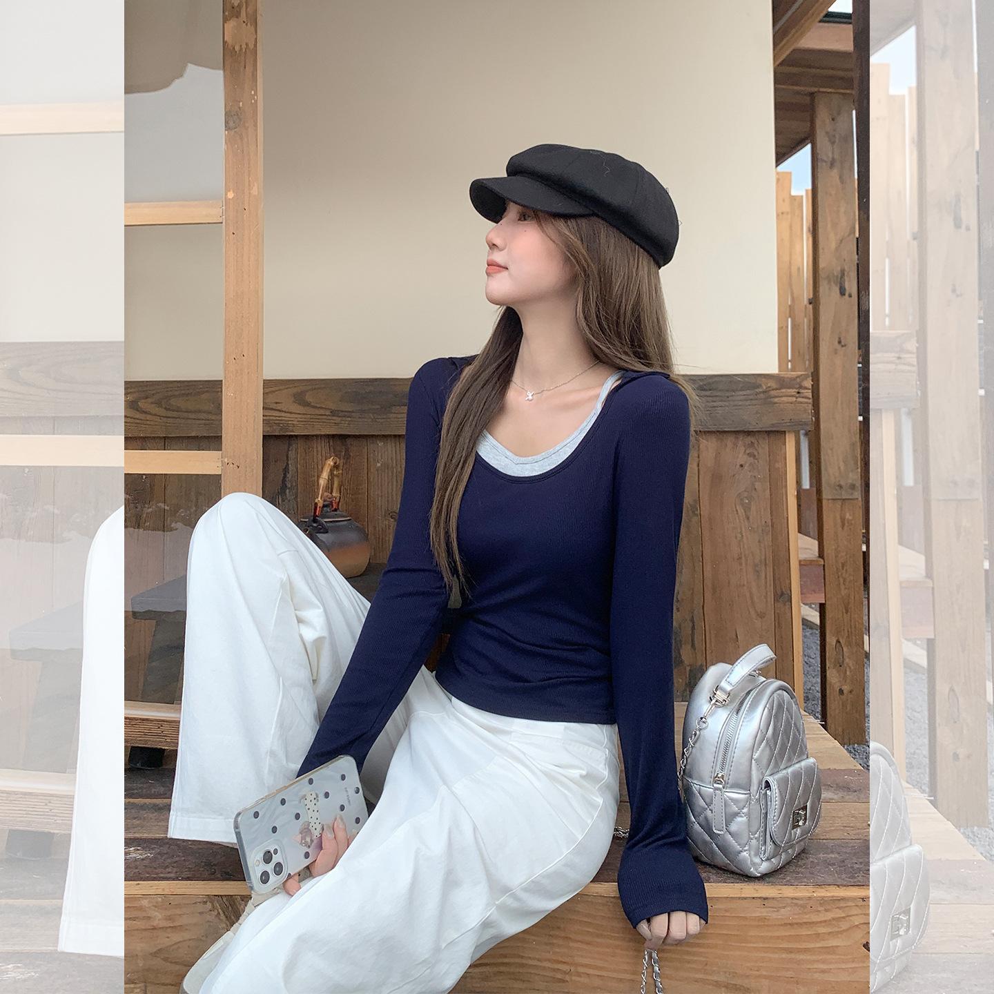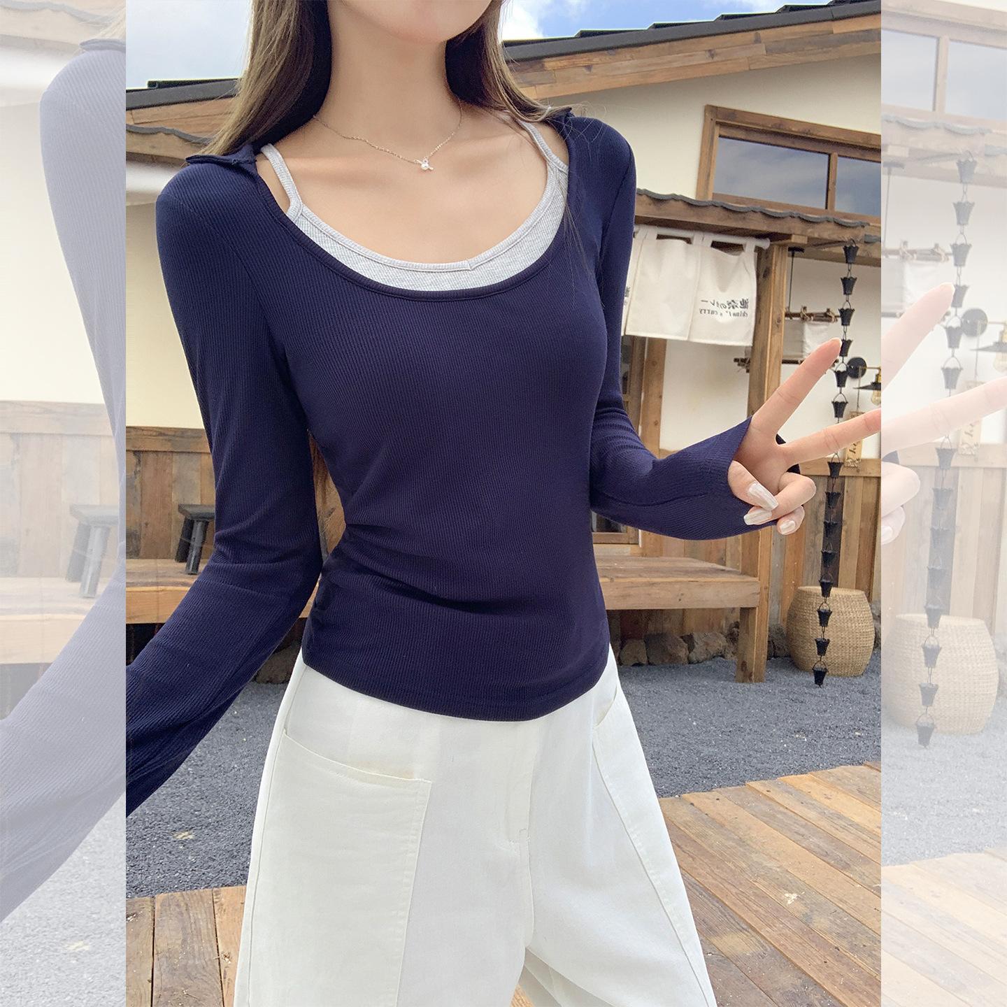 Foto real estilo coreano azul marino falso de dos piezas camiseta de manga larga mujer otoño nuevo estilo coreano ajuste ceñido diseño cuello U capa base top interior