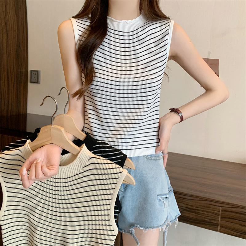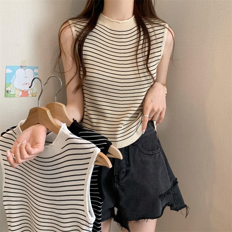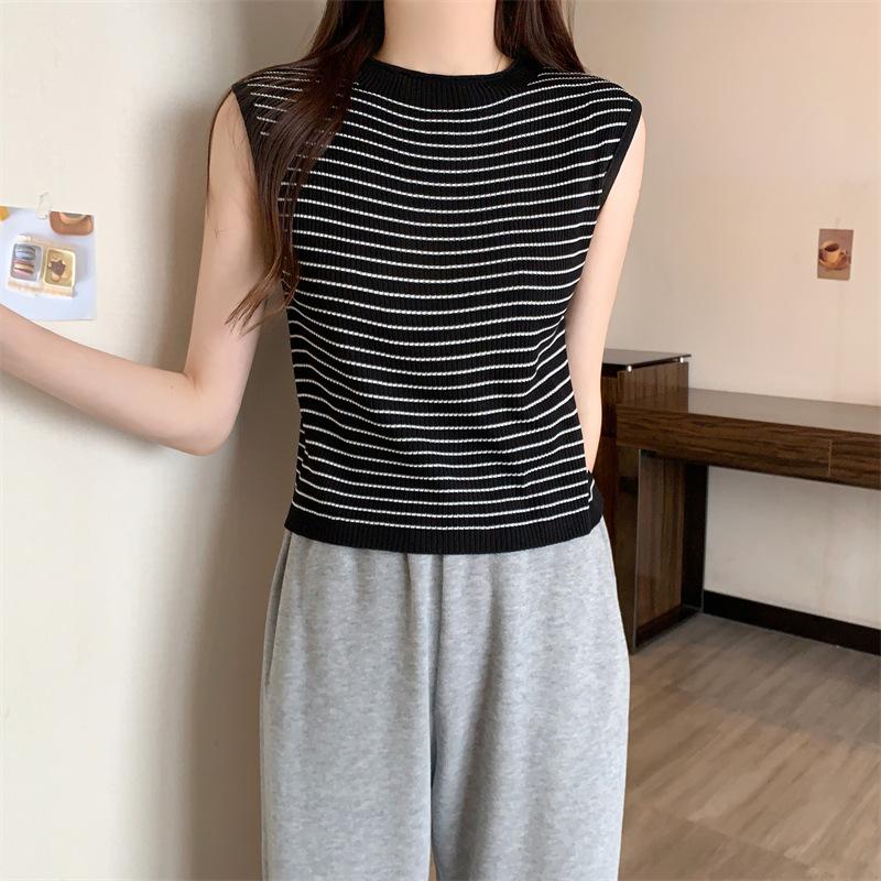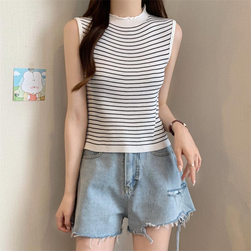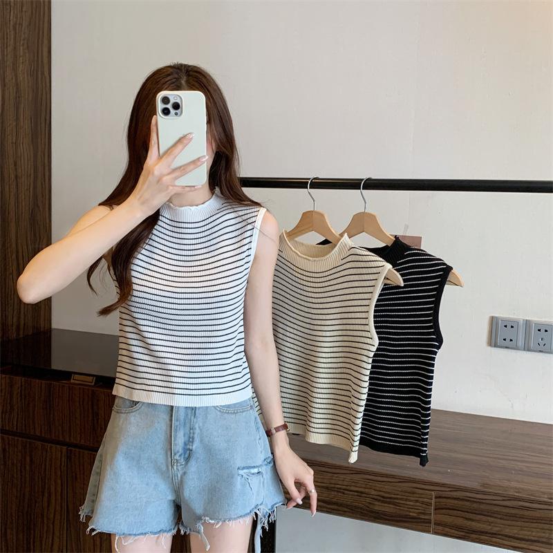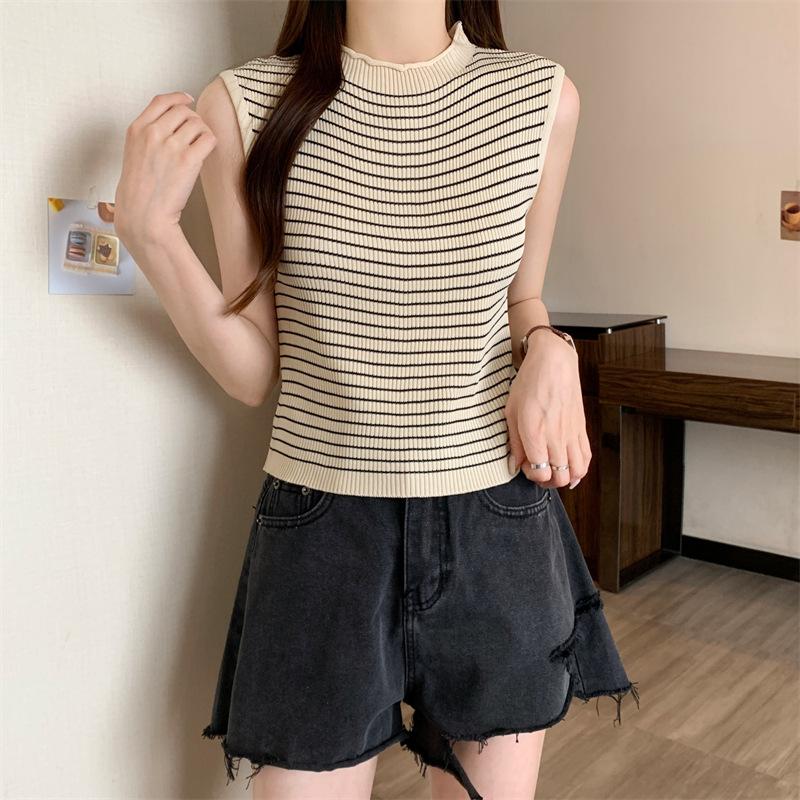2023 Verano Nuevo Chaleco Tejido a Rayas Top sin Mangas Ropa Interior para Mujer Ropa Exterior Ajustado Corto Chaleco Básico