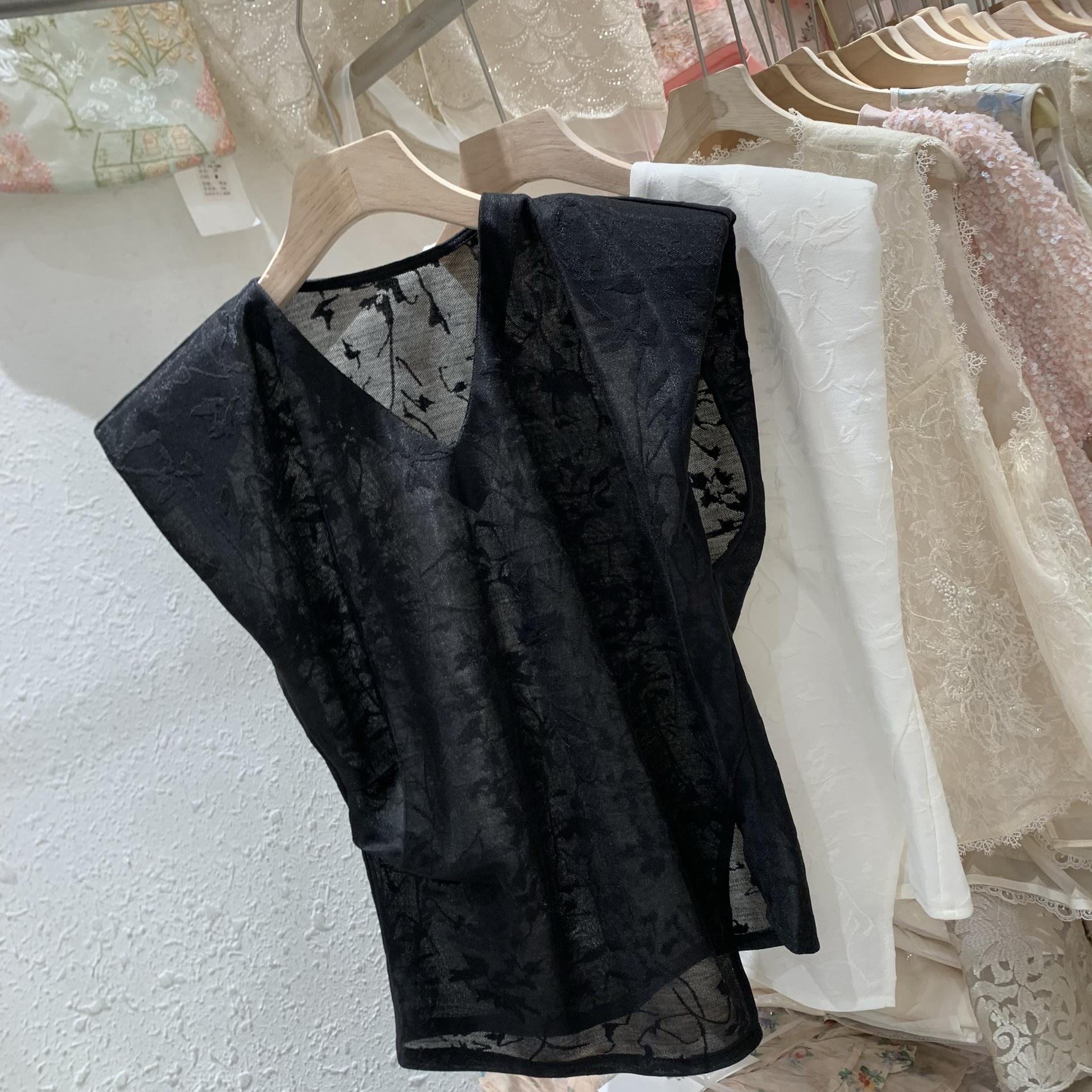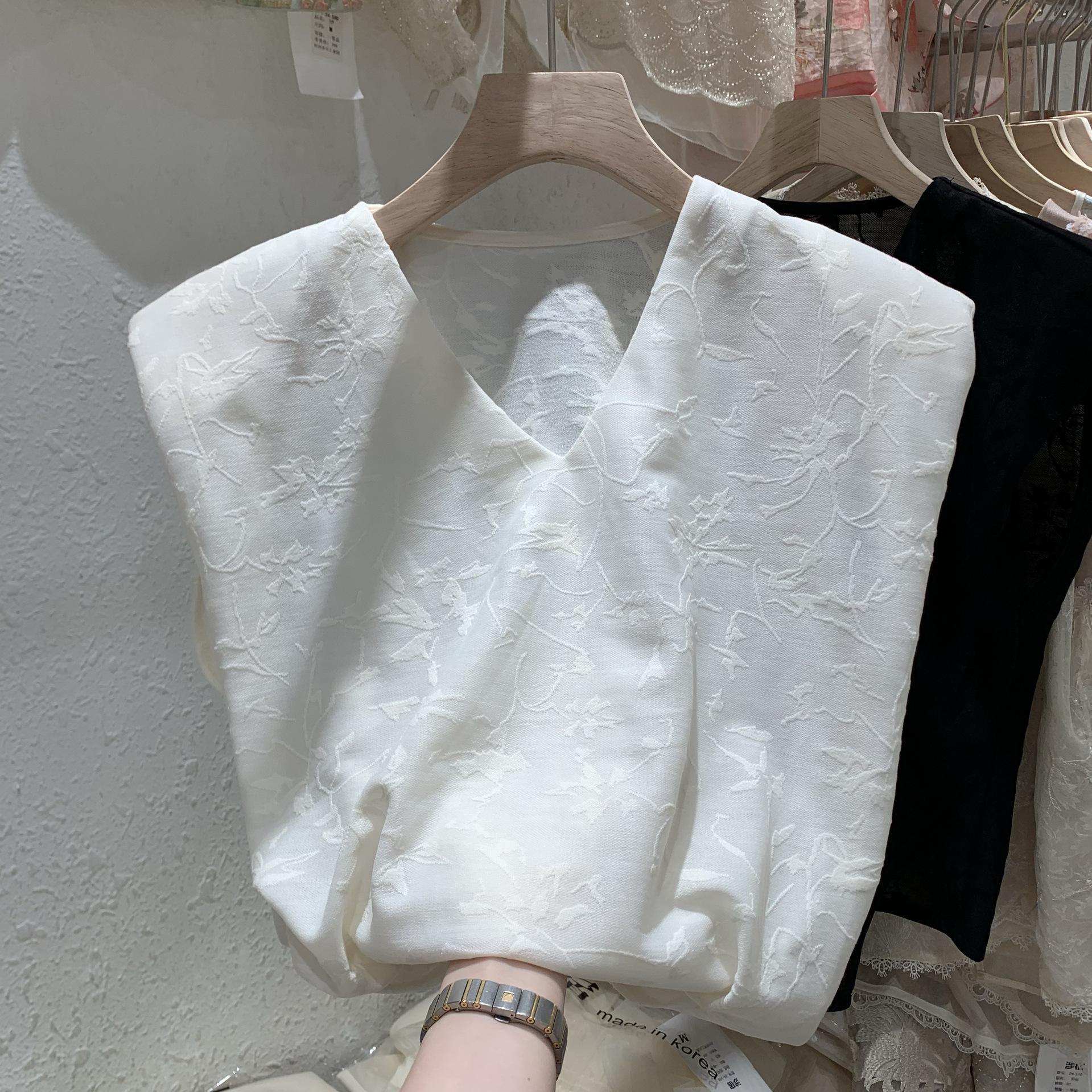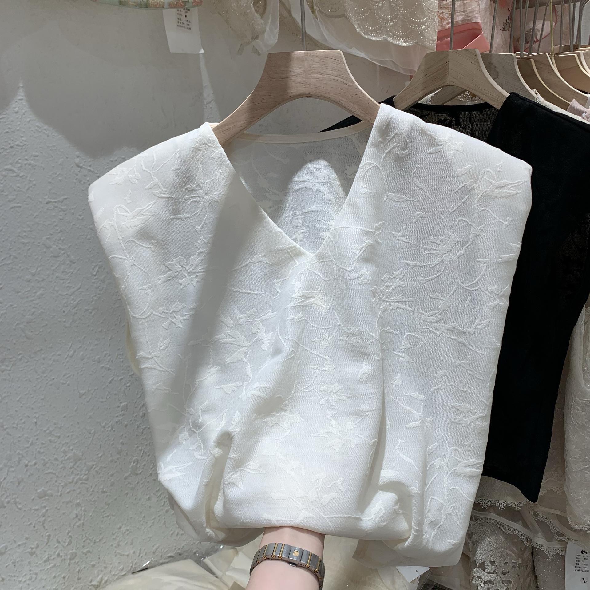 Sijiqing Verano Nuevo Estilo Europeo Jacquard Hombrera Blusa Chifón Top Mujer Manga Mariposa Abertura Adelgazante Camiseta Camisa Pequeña