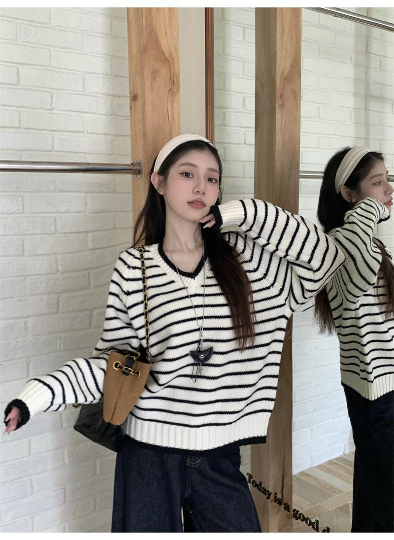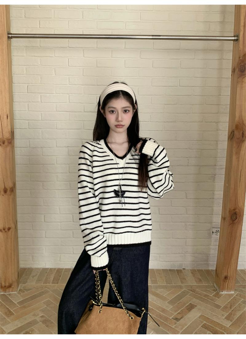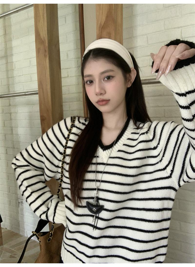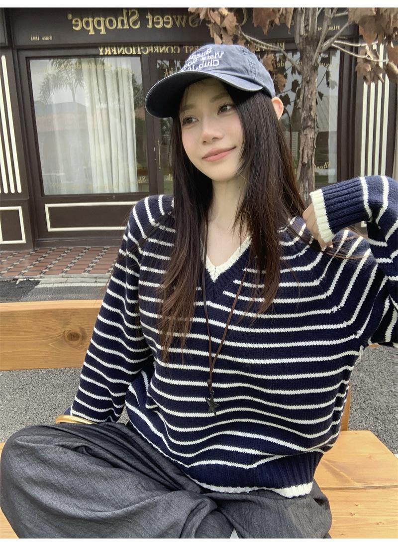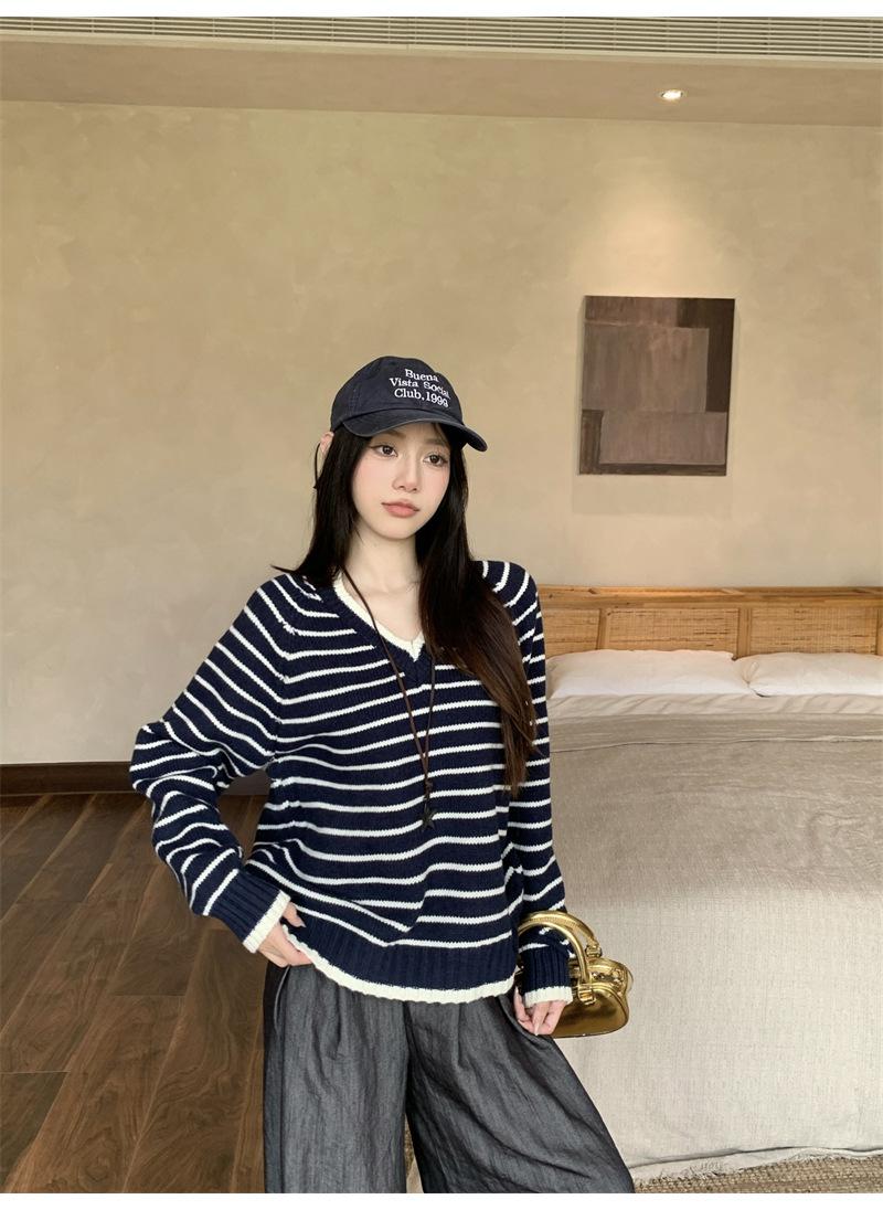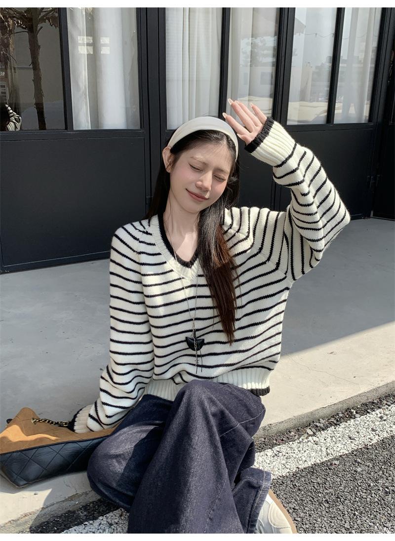 Suéter de Punto a Rayas con Cuello en V de Moda para Mujer Otoño Invierno 2025 Nuevo Suelto Holgado Tejido Manga Larga Top Básico
