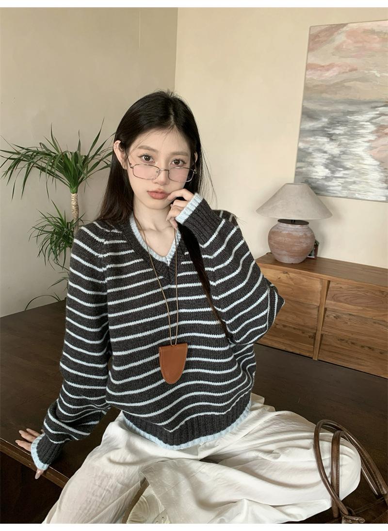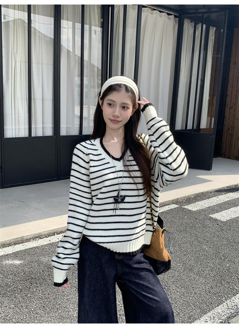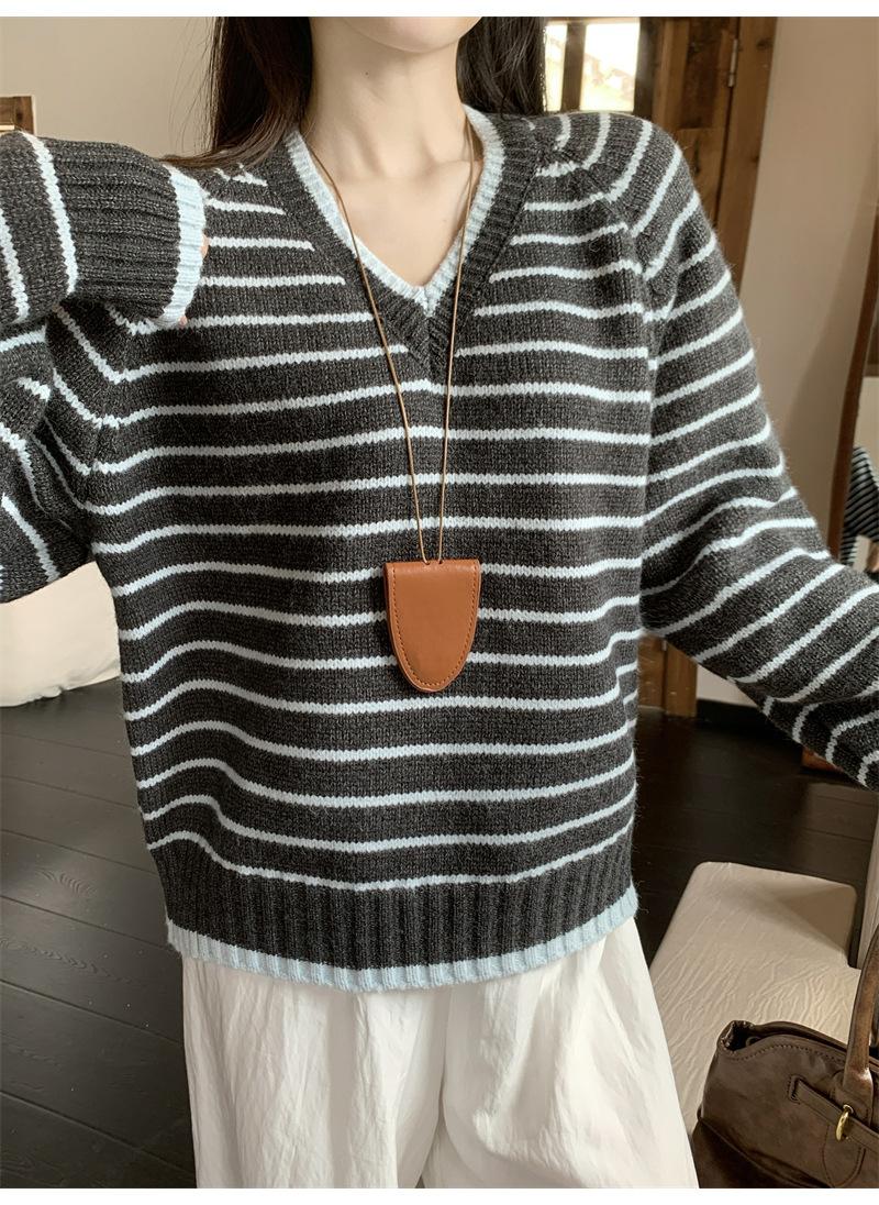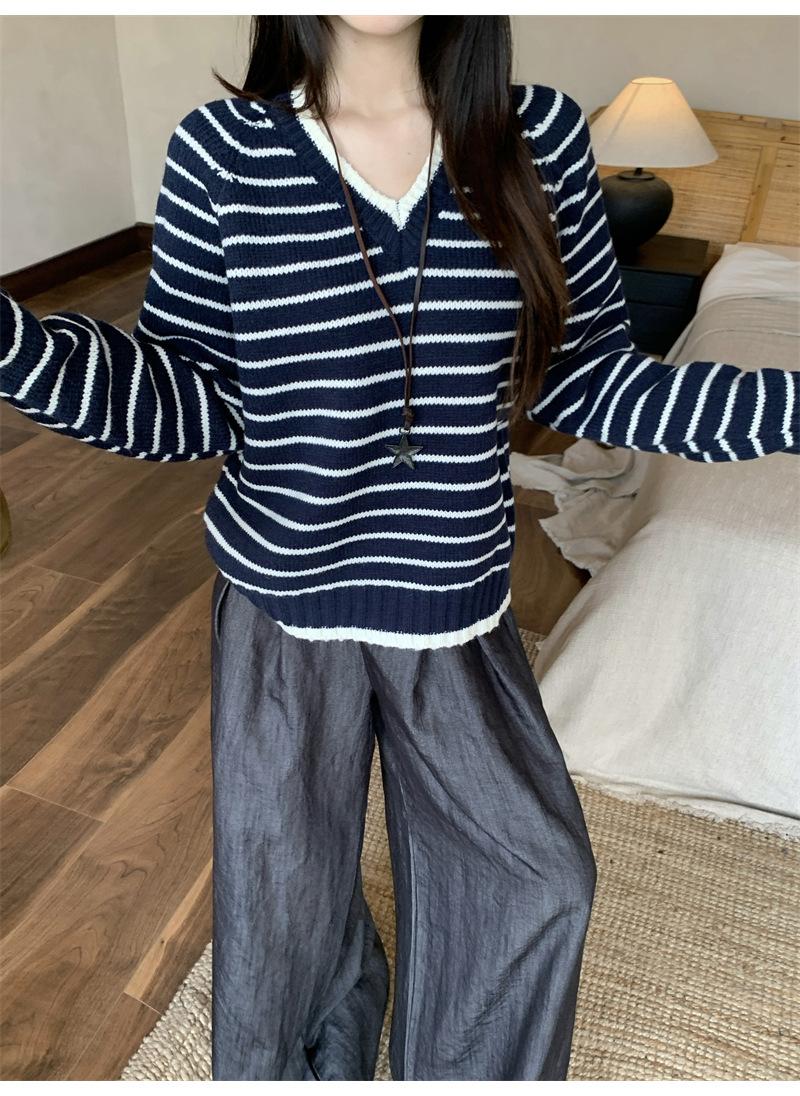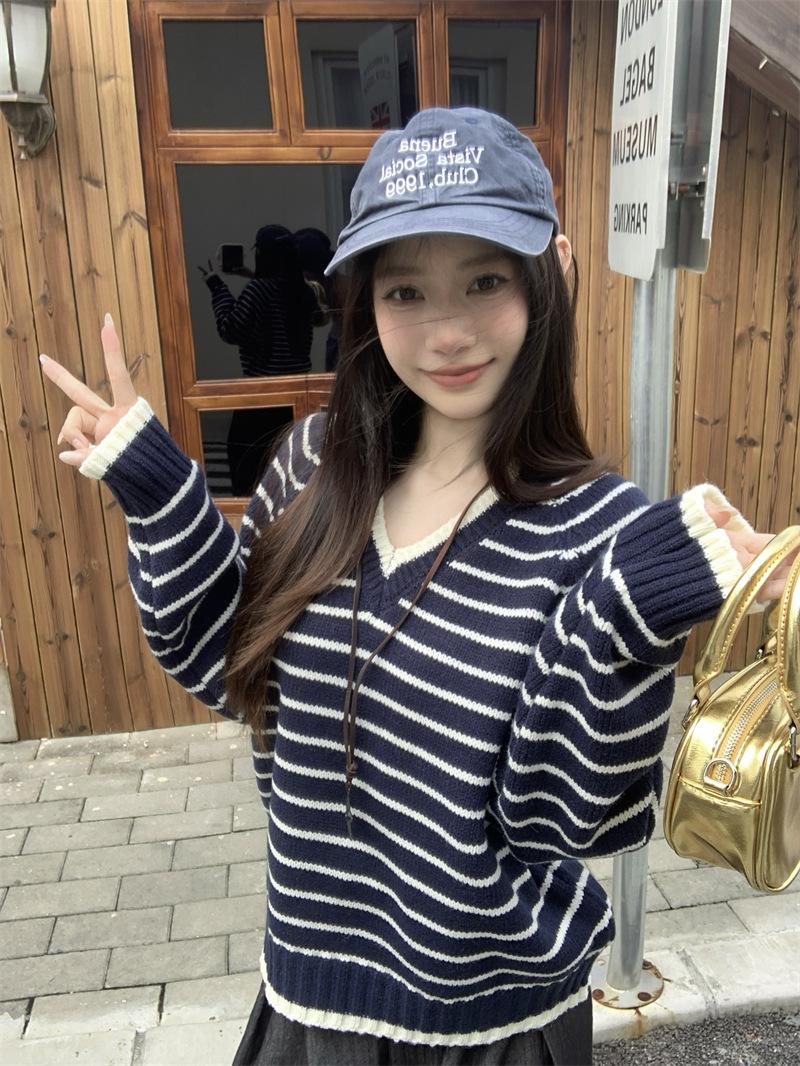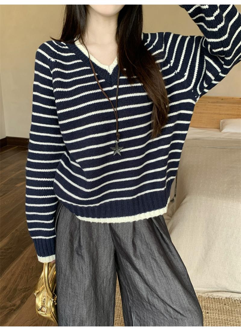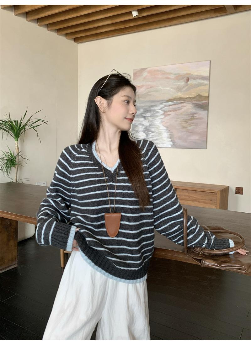 Suéter de Punto a Rayas con Cuello en V de Moda para Mujer Otoño Invierno 2025 Nuevo Suelto Holgado Tejido Manga Larga Top Básico