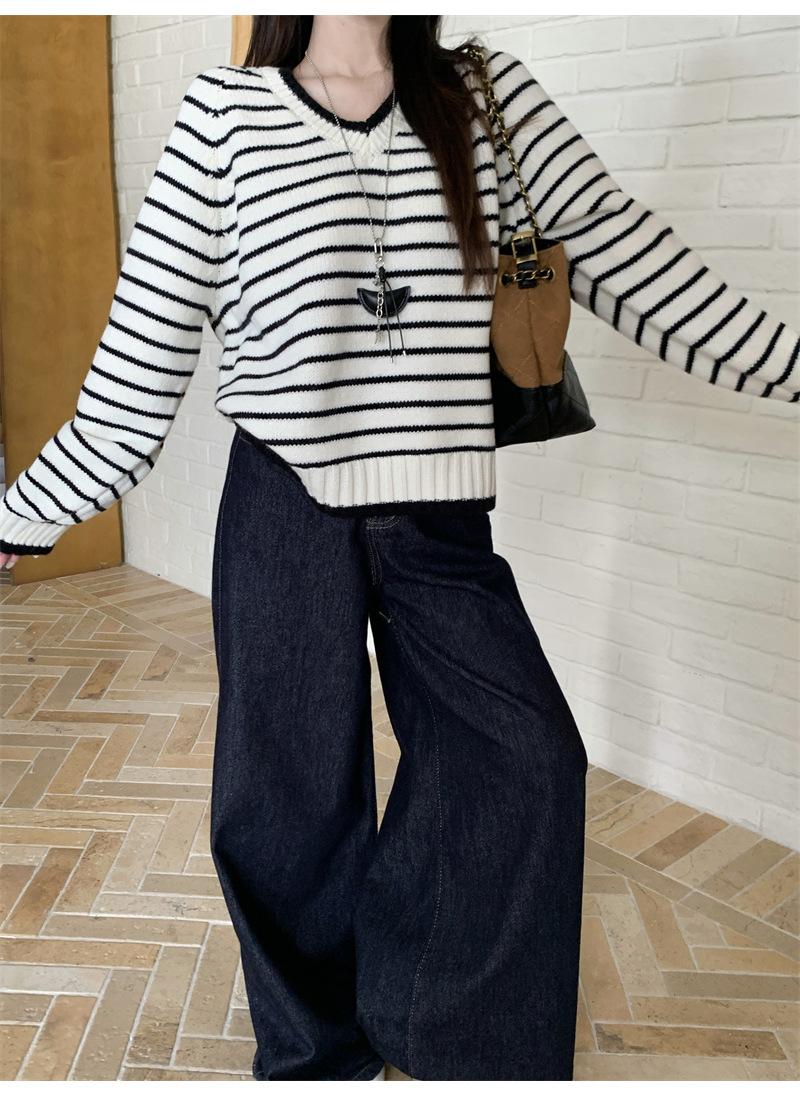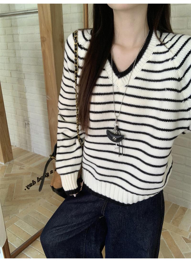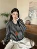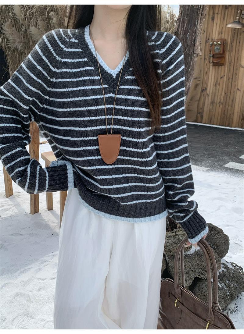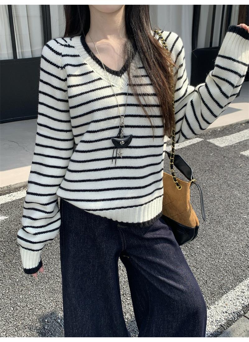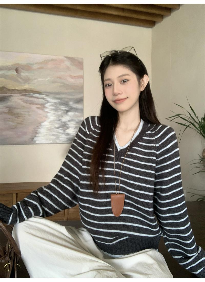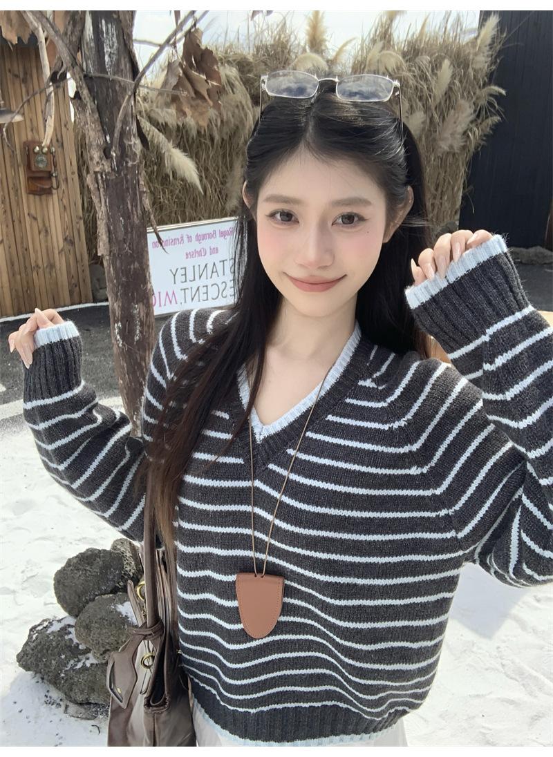 Suéter de Punto a Rayas con Cuello en V de Moda para Mujer Otoño Invierno 2025 Nuevo Suelto Holgado Tejido Manga Larga Top Básico