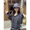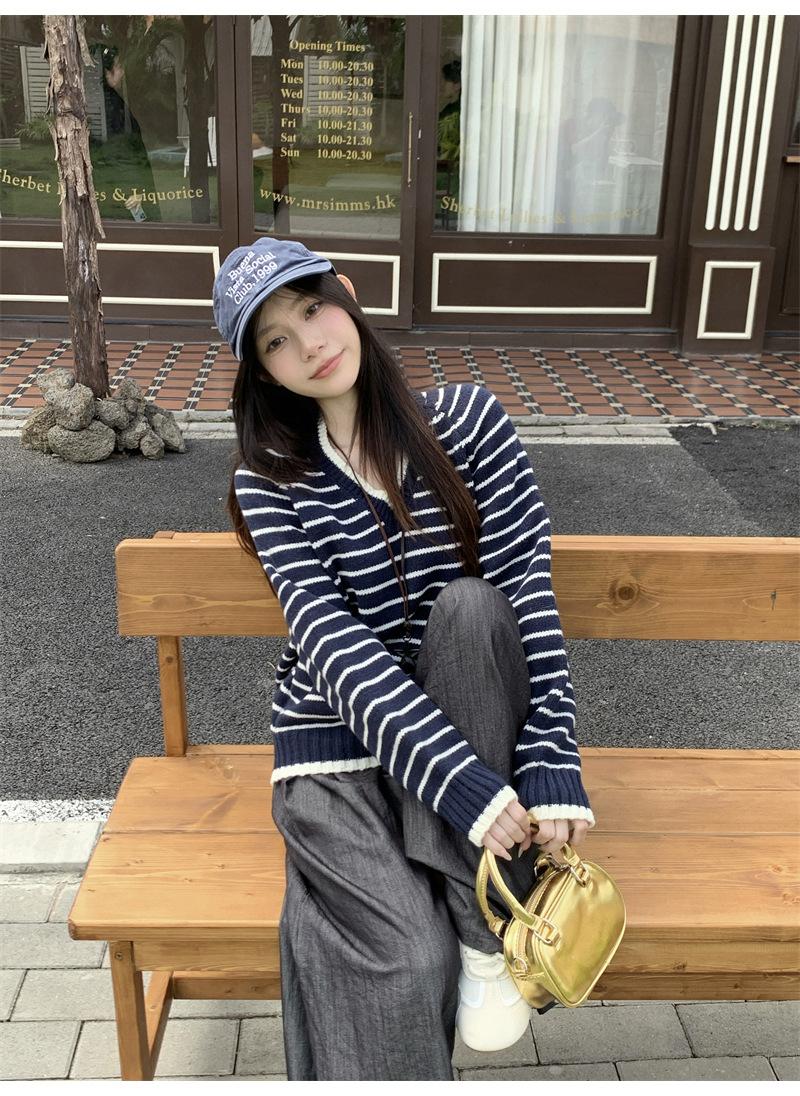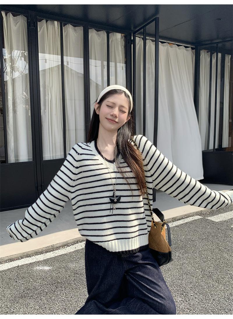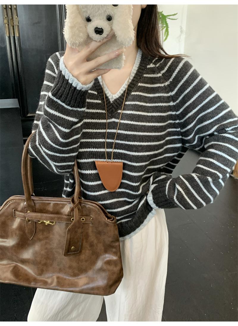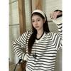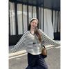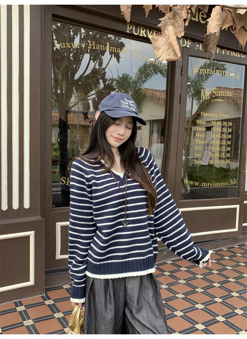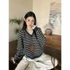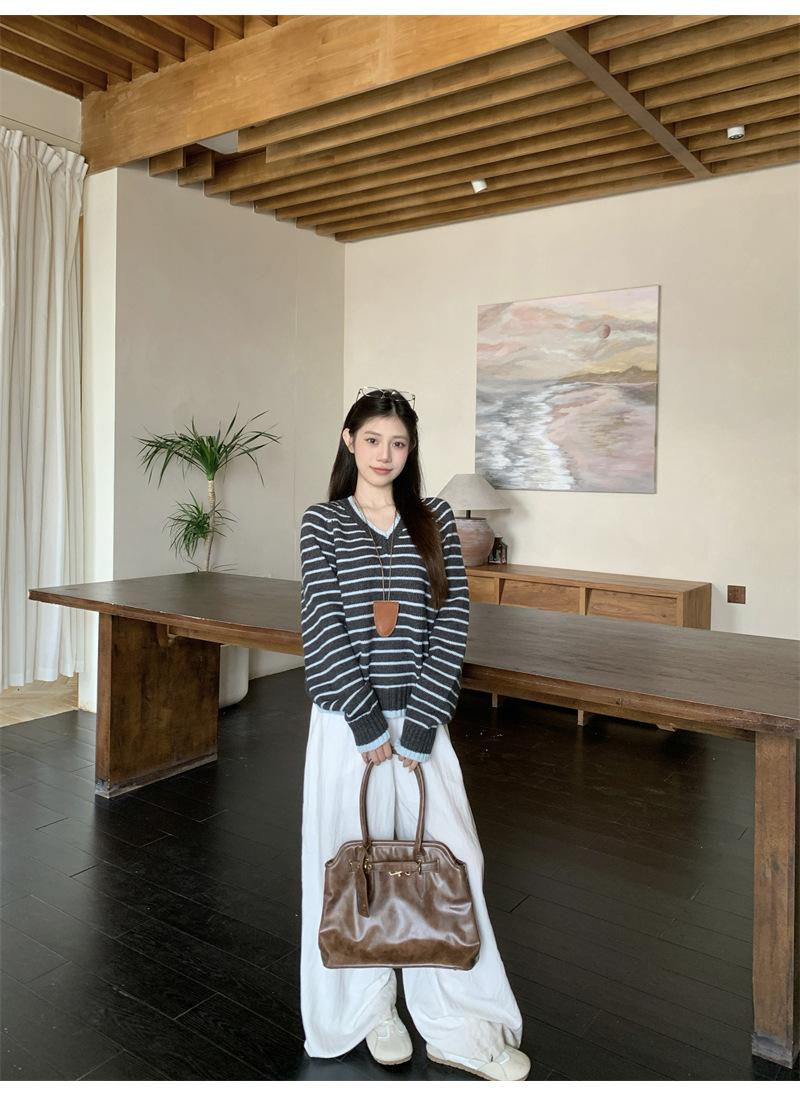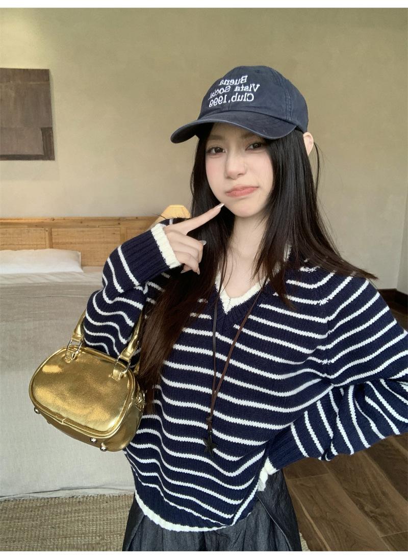 Suéter de Punto a Rayas con Cuello en V de Moda para Mujer Otoño Invierno 2025 Nuevo Suelto Holgado Tejido Manga Larga Top Básico