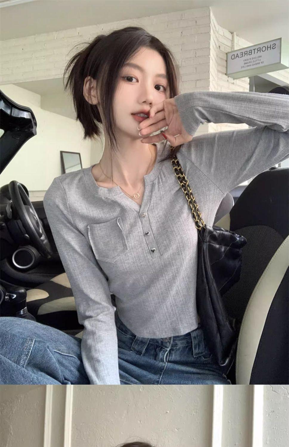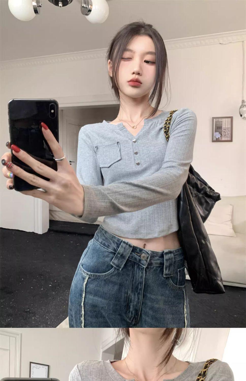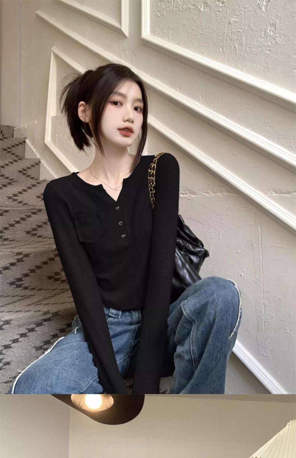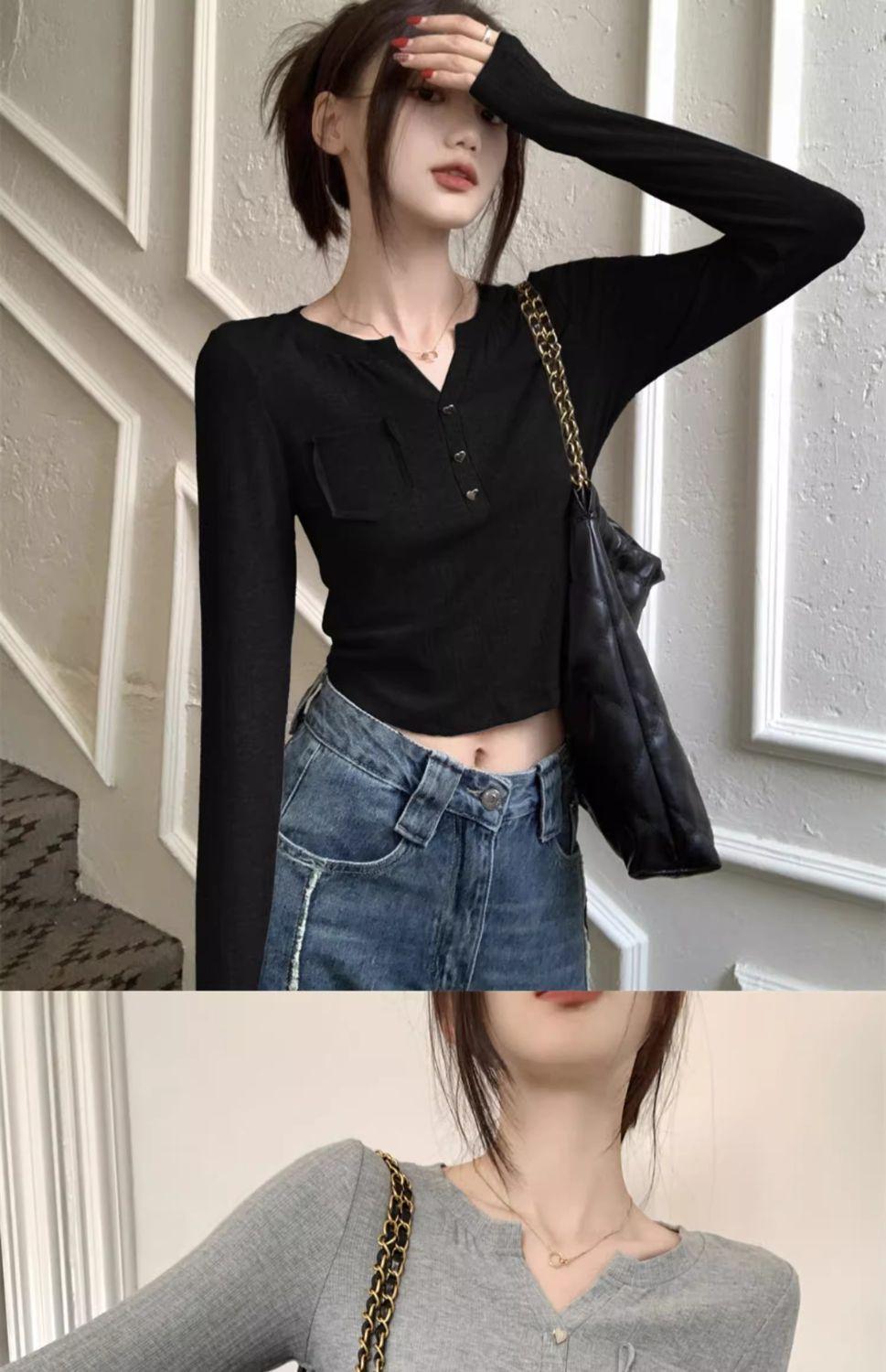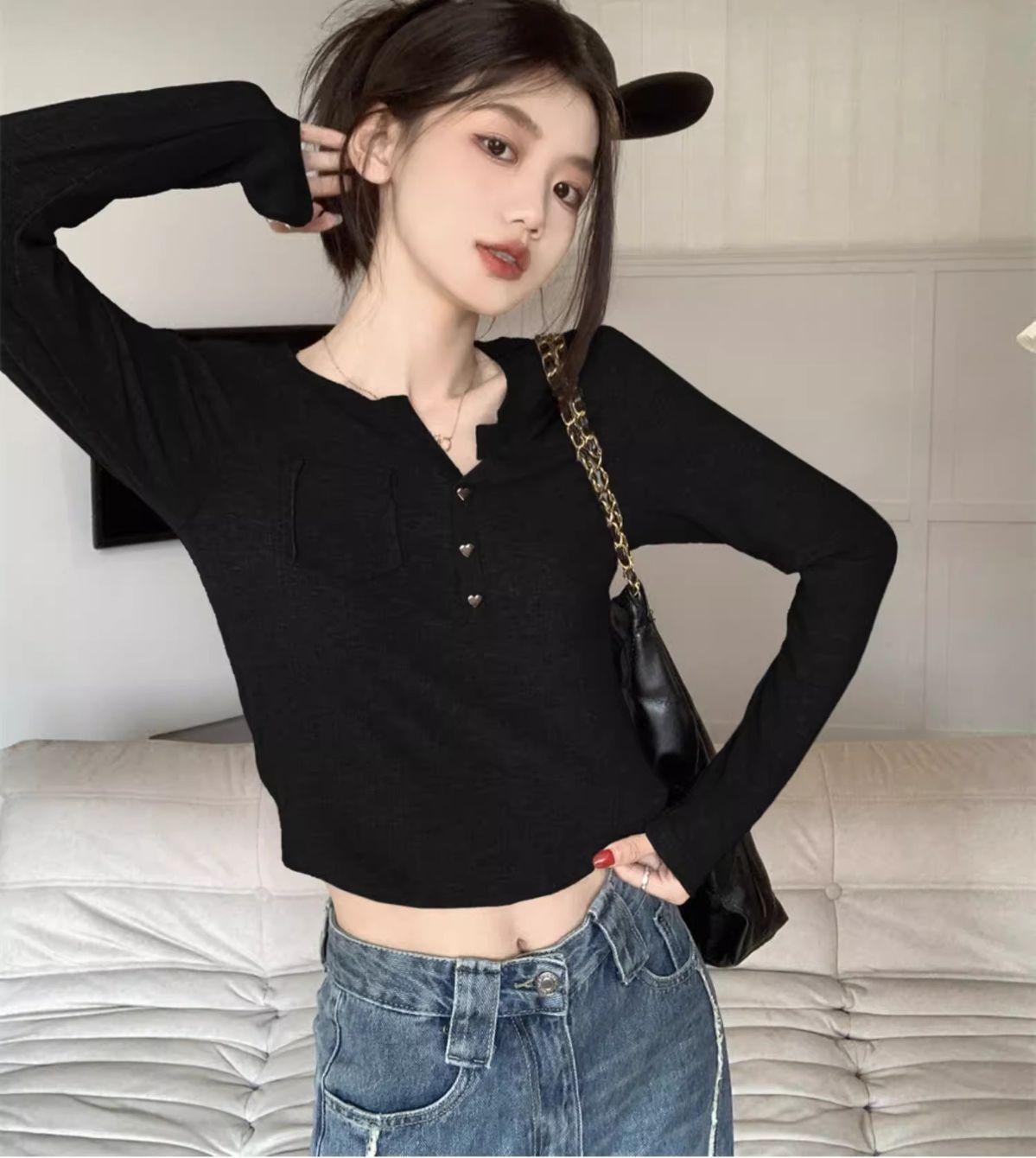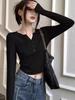 Sentido del Diseño Nicho Cuello en V Negro Manga Larga Camiseta Mujer Primavera Otoño Chica Caliente Ajustado Crop Top Cintura Alta Corta Camisa Base