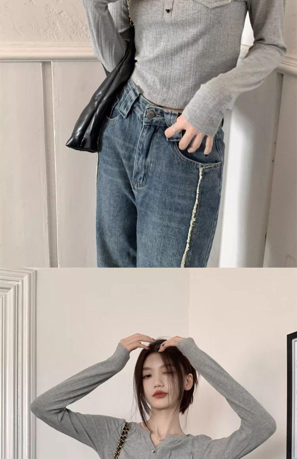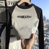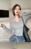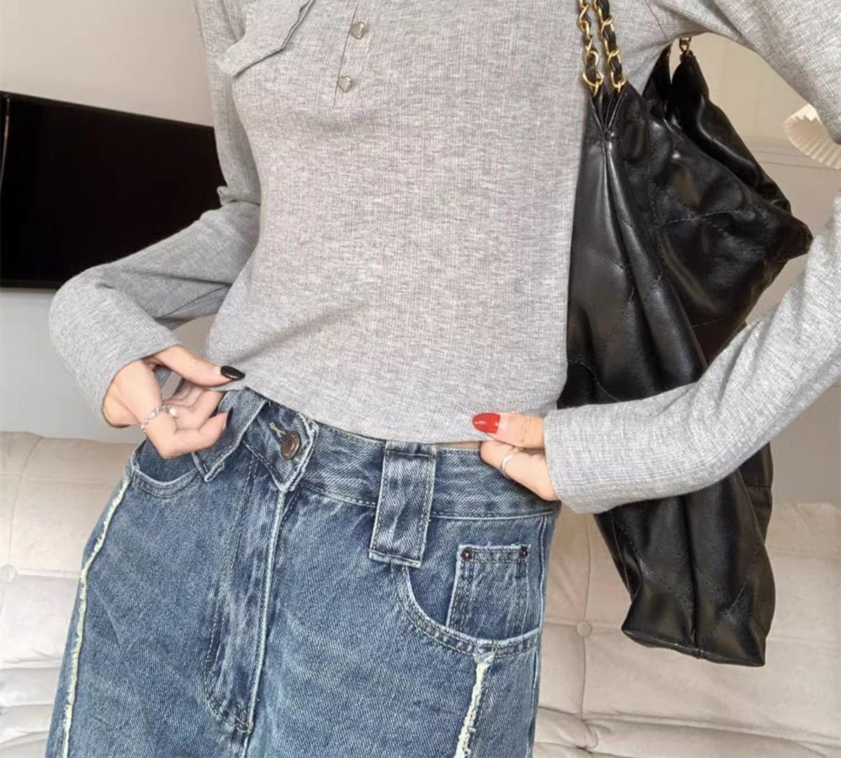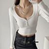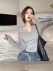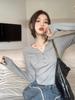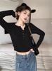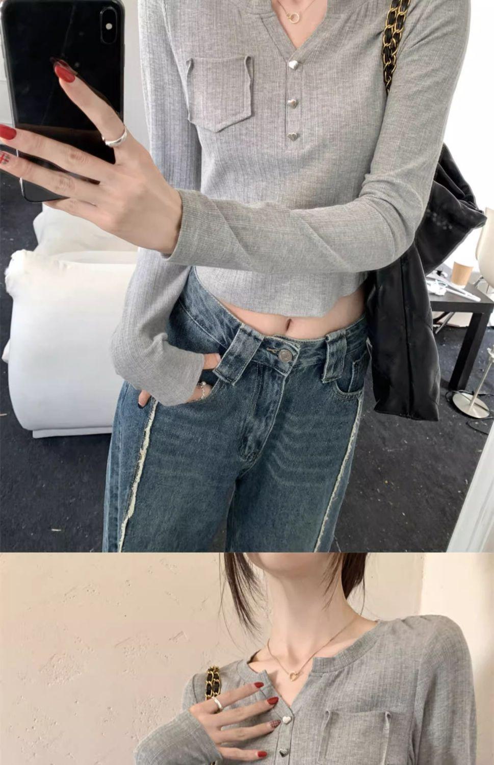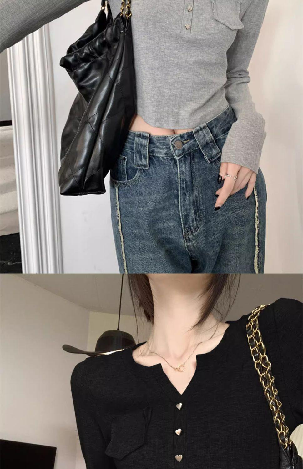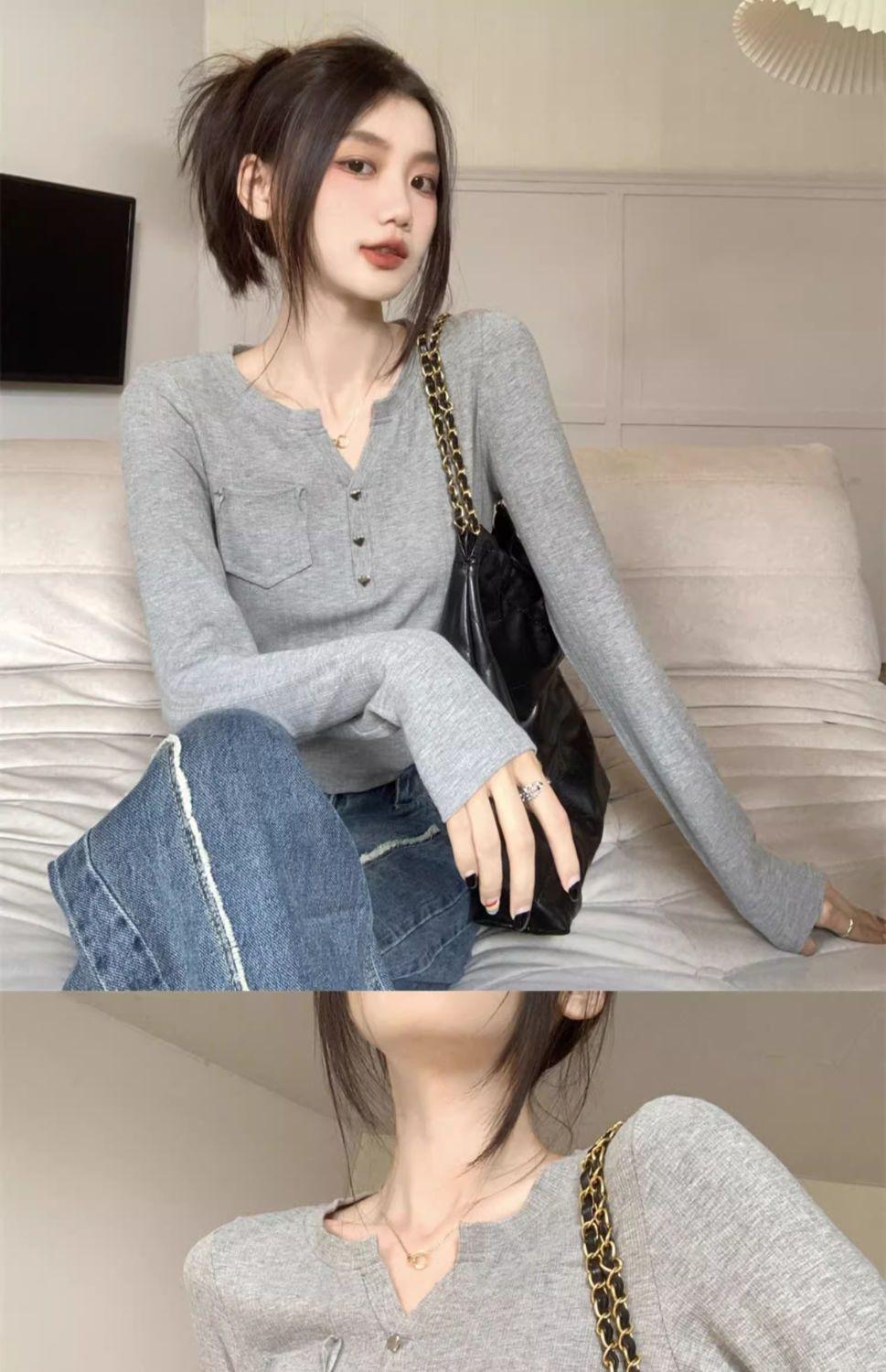 Sentido del Diseño Nicho Cuello en V Negro Manga Larga Camiseta Mujer Primavera Otoño Chica Caliente Ajustado Crop Top Cintura Alta Corta Camisa Base