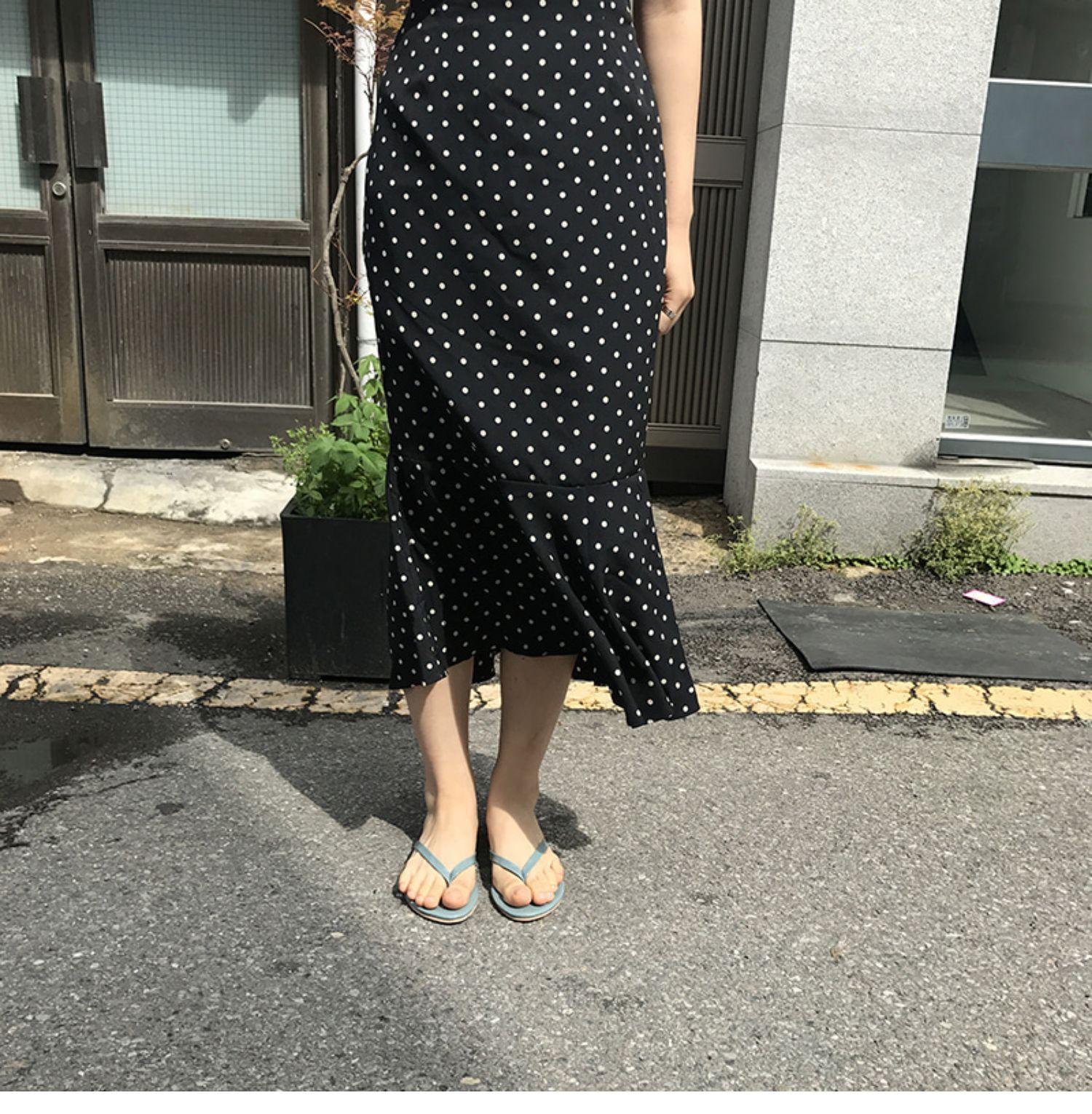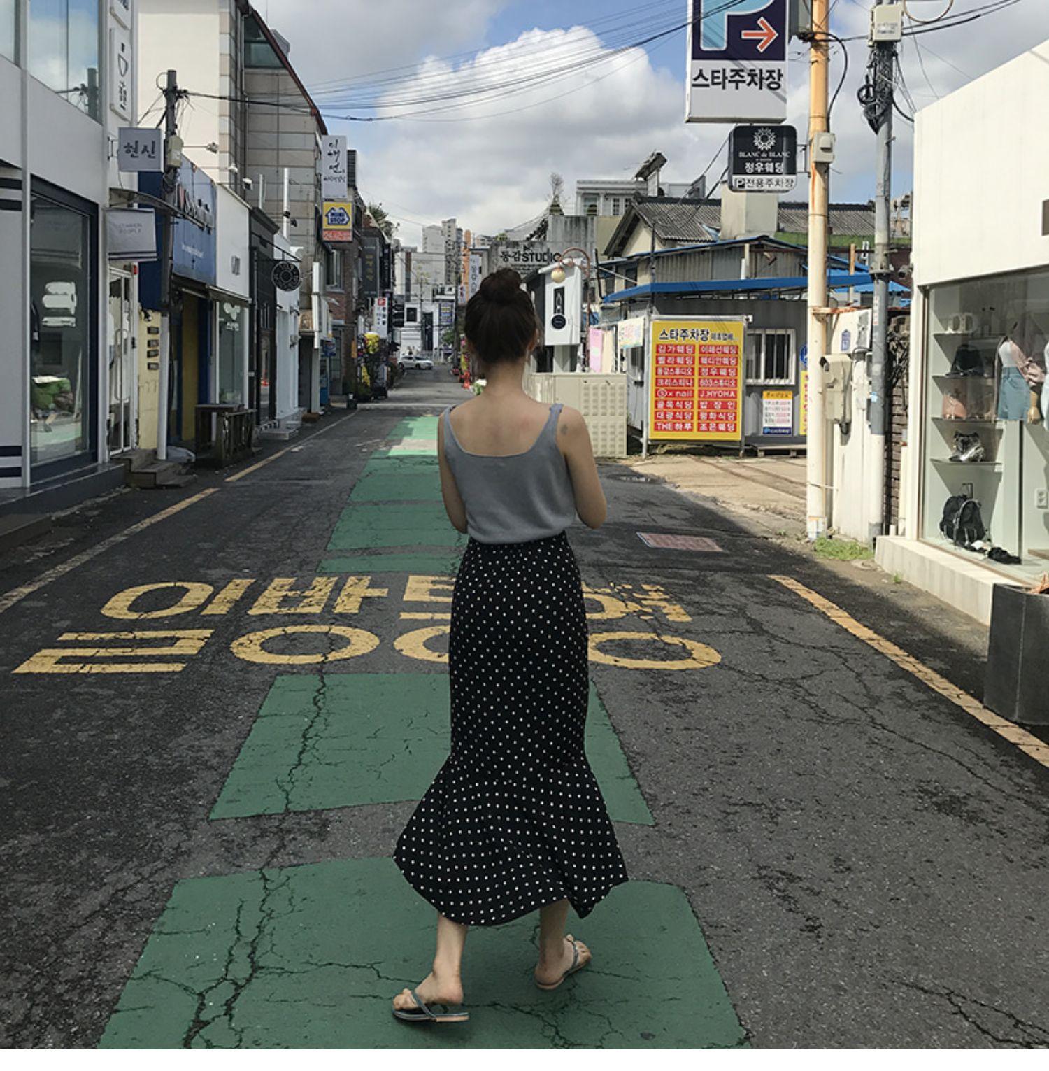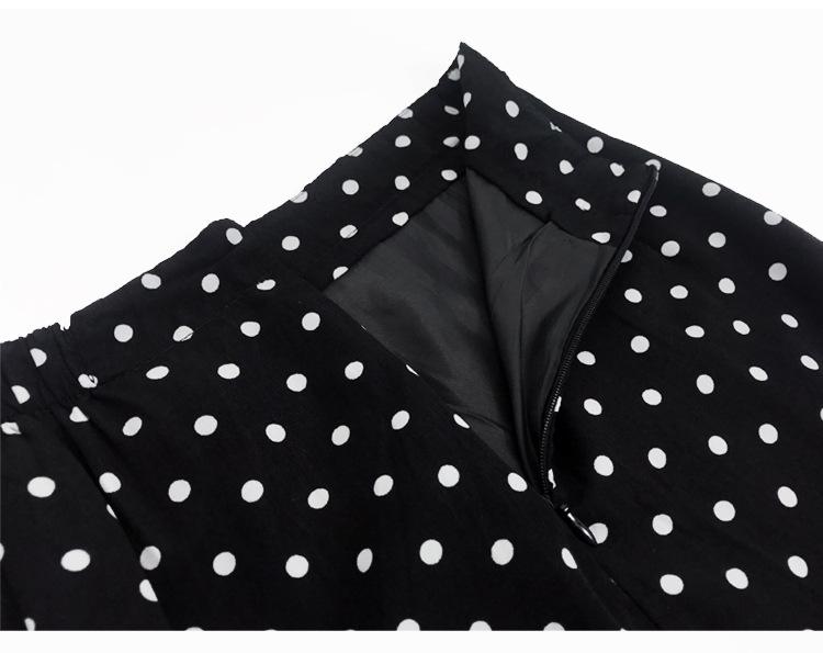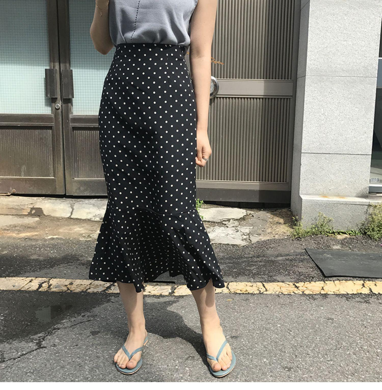 Falda Cola de Pez para Mujer Nueva Verano Largo Medio Retro Estilo Hong Kong Cubre Caderas Cintura Alta Falda Larga Negra Lunares Falda de Gasa