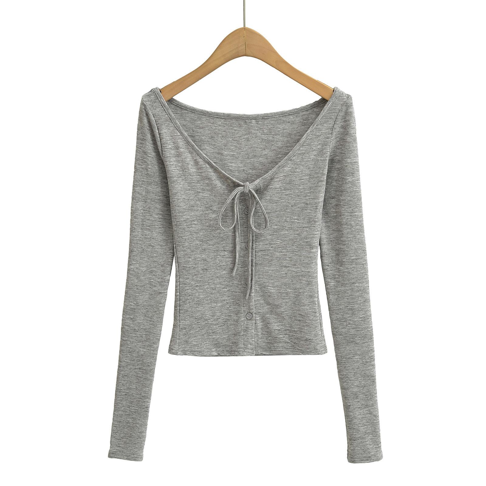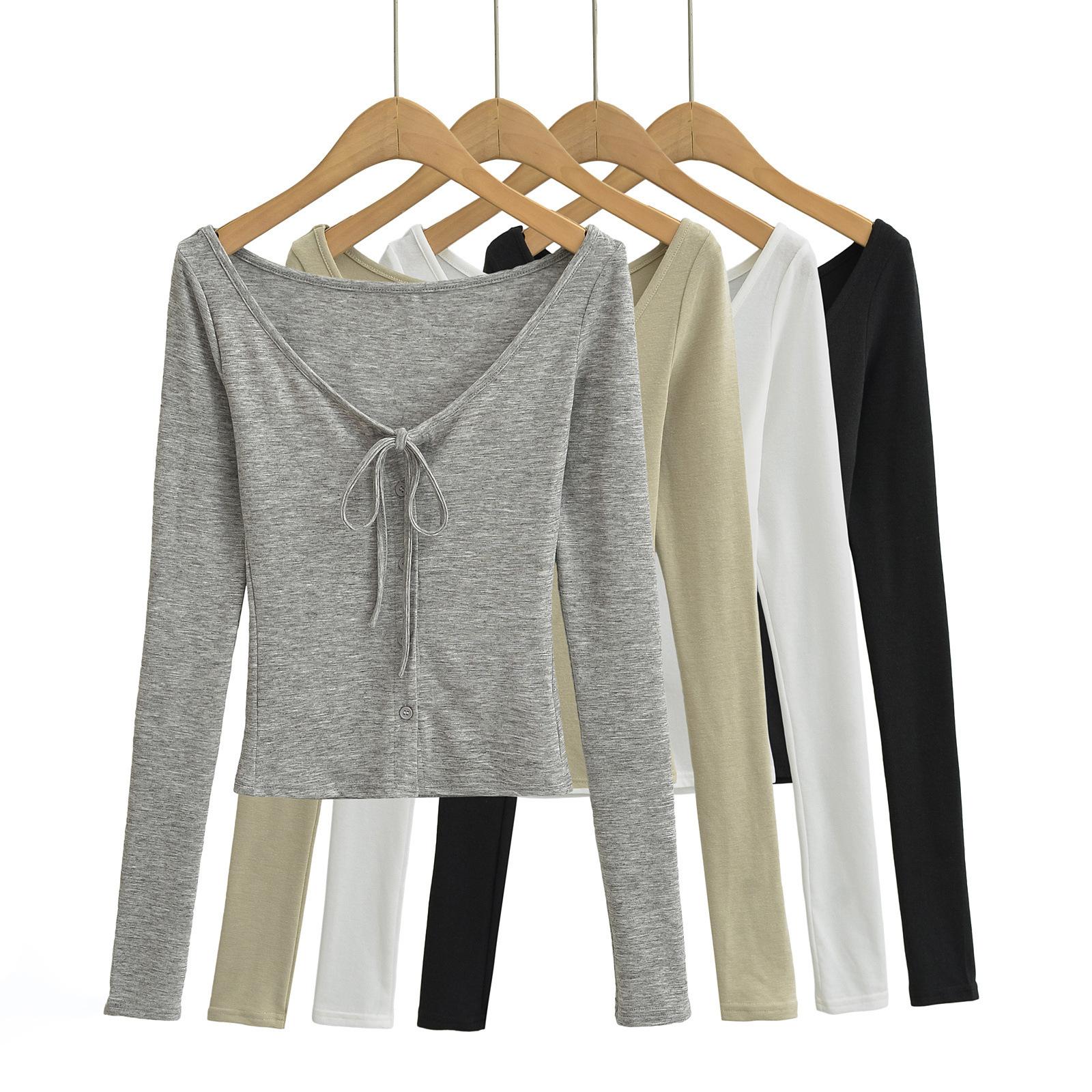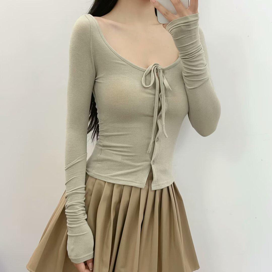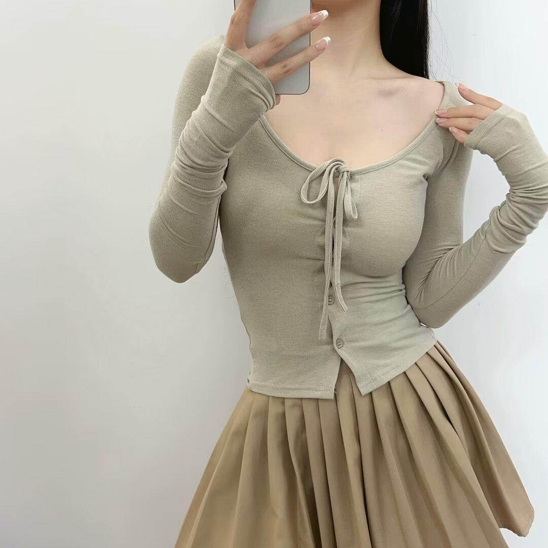 Estilo Deseo Puro Cuello en V con Cordones Manga Larga Camiseta Base para Mujer Otoño Chica Picante Ropa Casual Clavícula Sexy Camiseta Top para Mujer