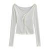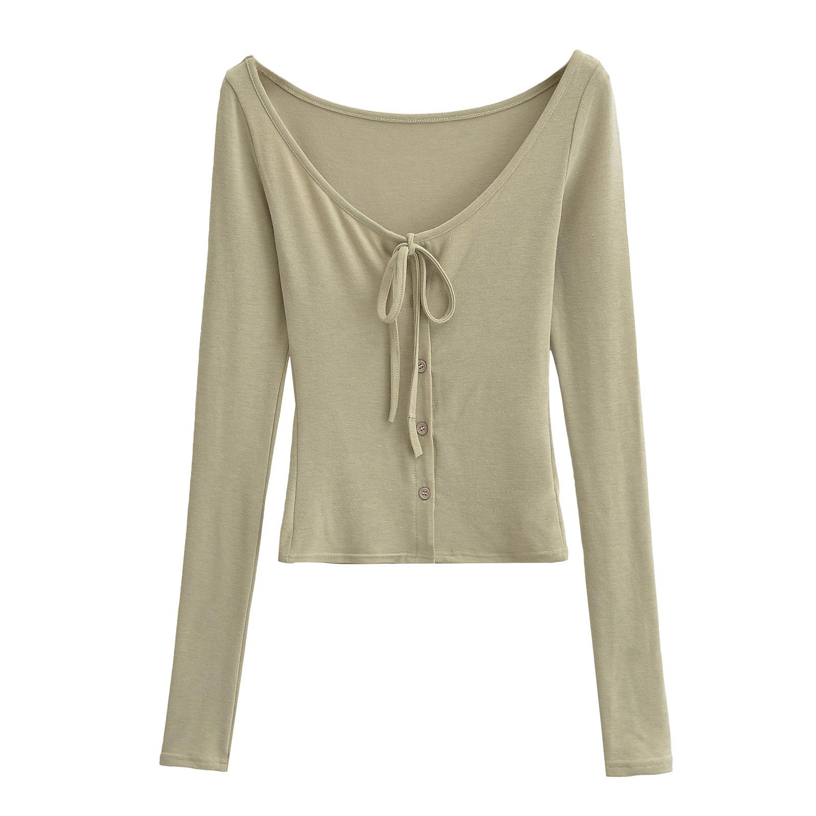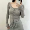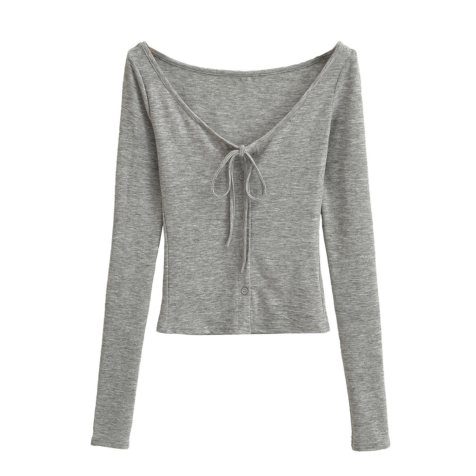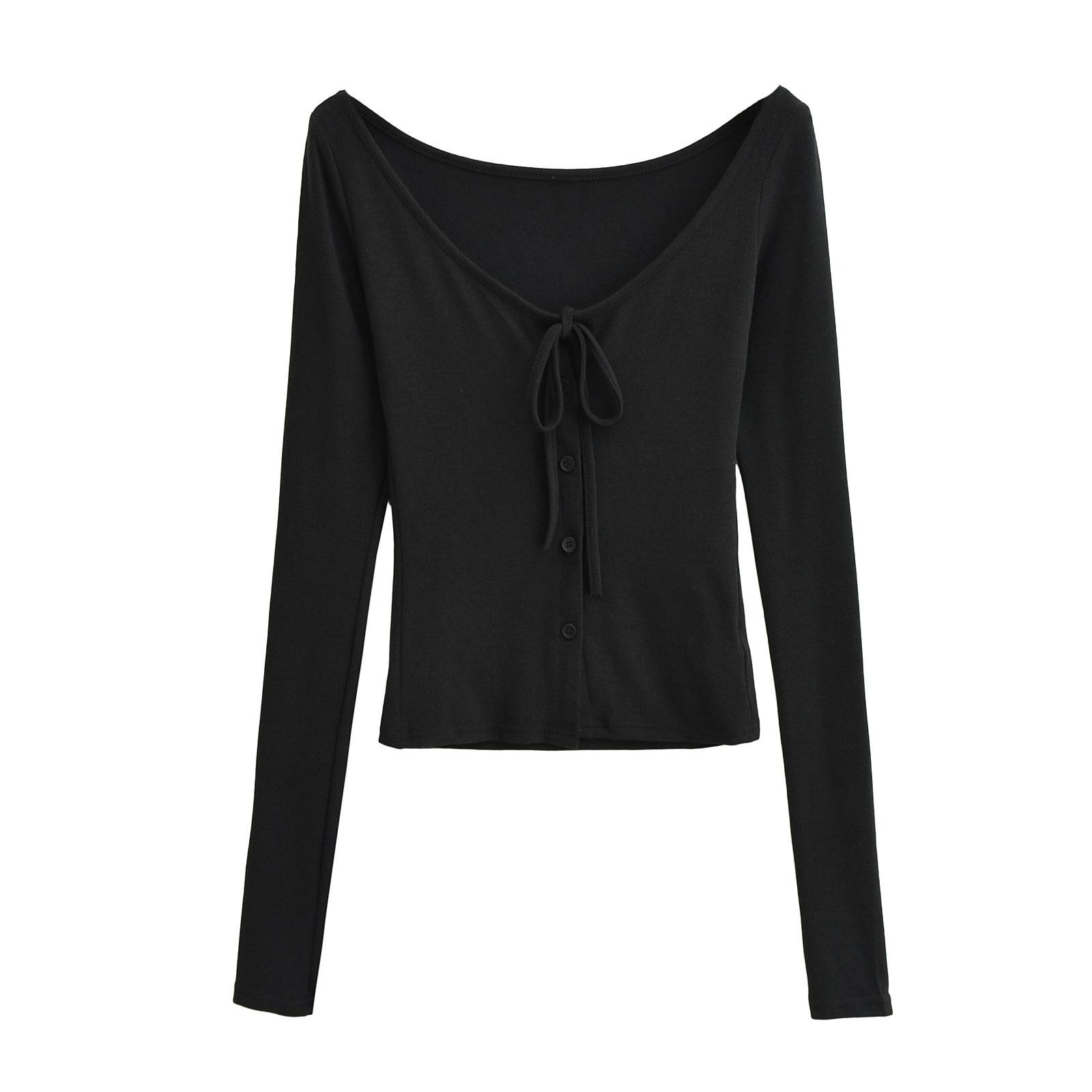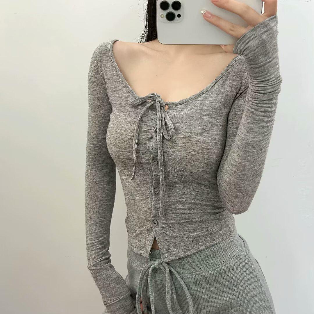 Estilo Deseo Puro Cuello en V con Cordones Manga Larga Camiseta Base para Mujer Otoño Chica Picante Ropa Casual Clavícula Sexy Camiseta Top para Mujer