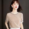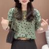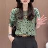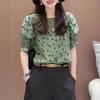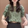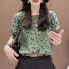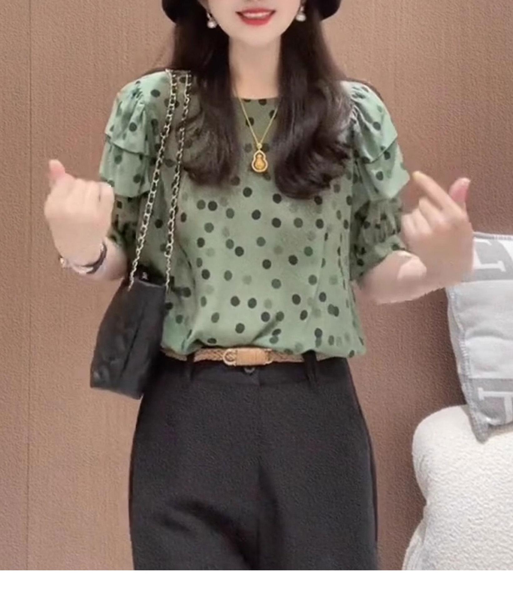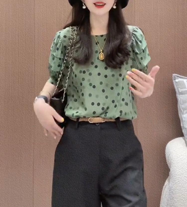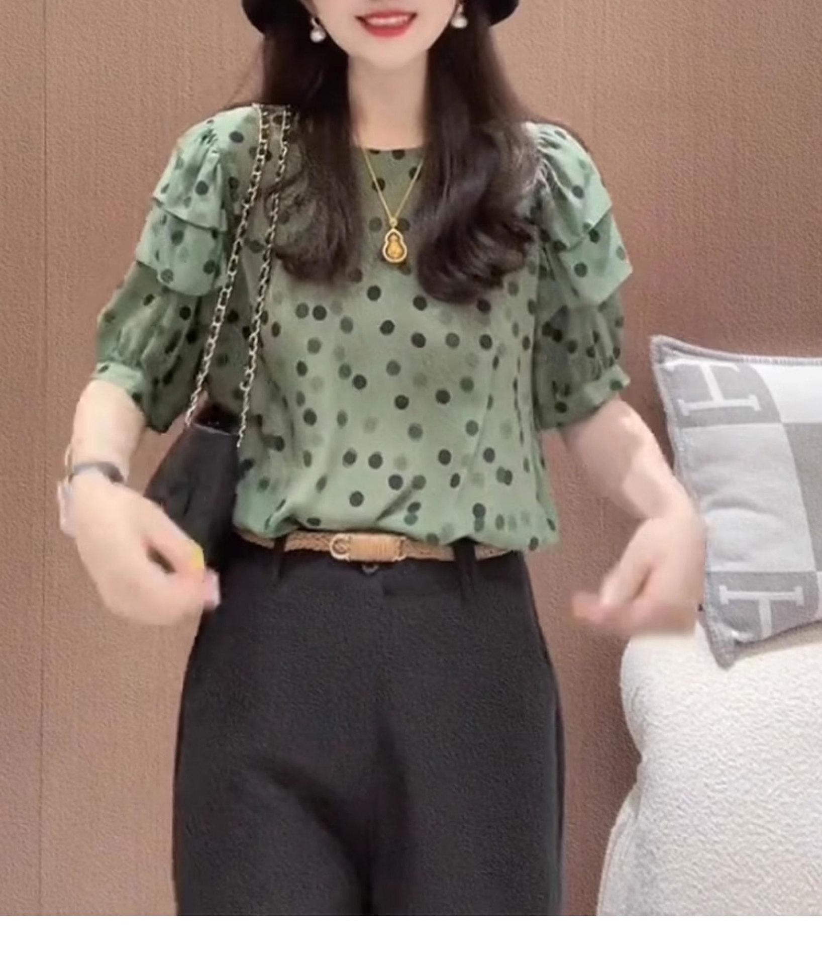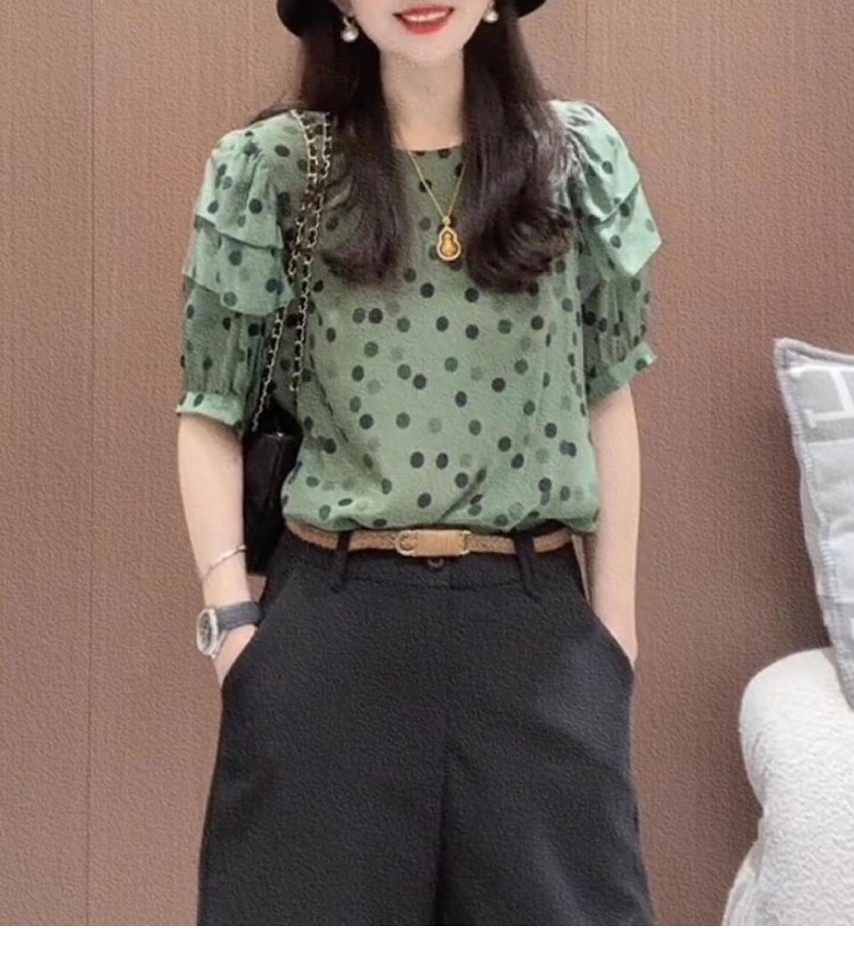Top Nuevo de Verano 2025 de Manga Corta con Lunares Trendy de Cuello Redondo Verde para Mujer
