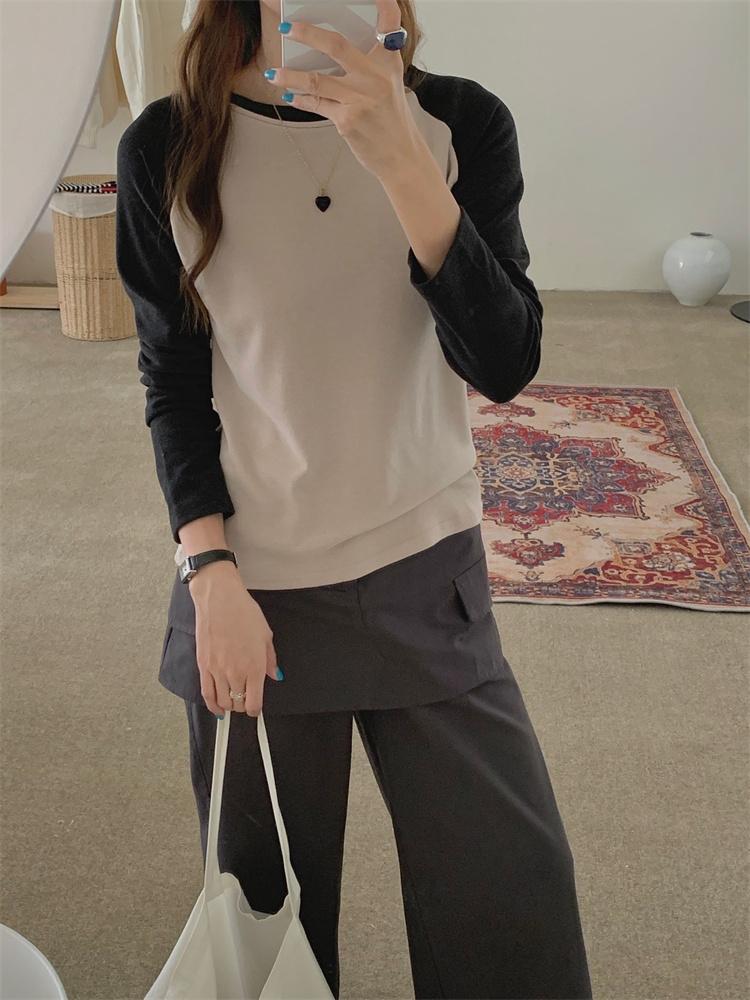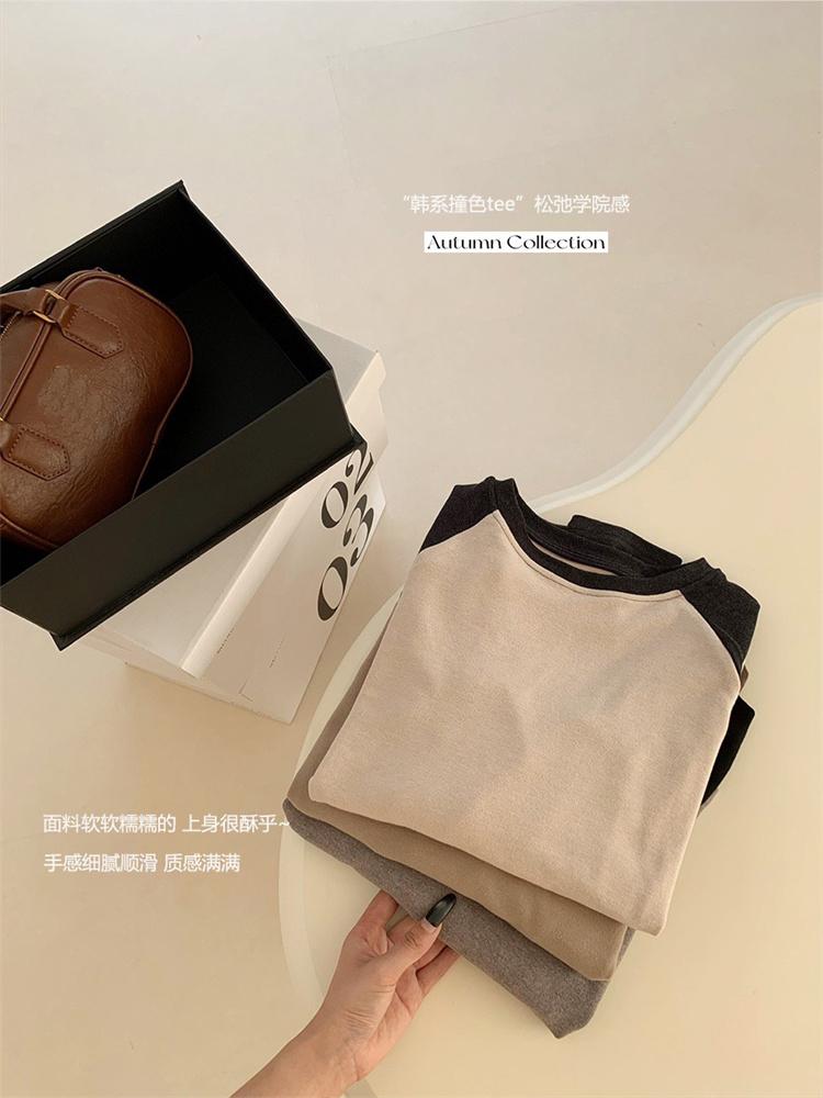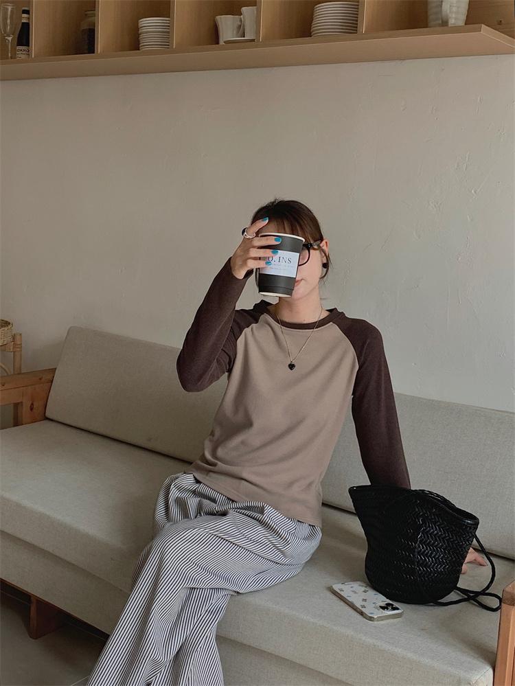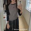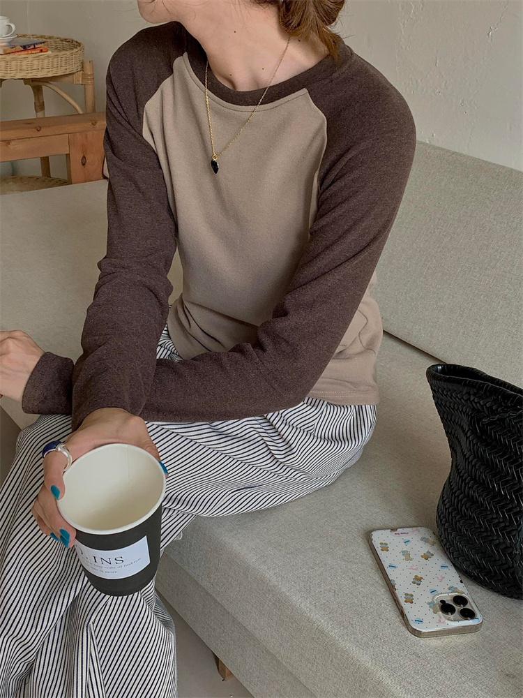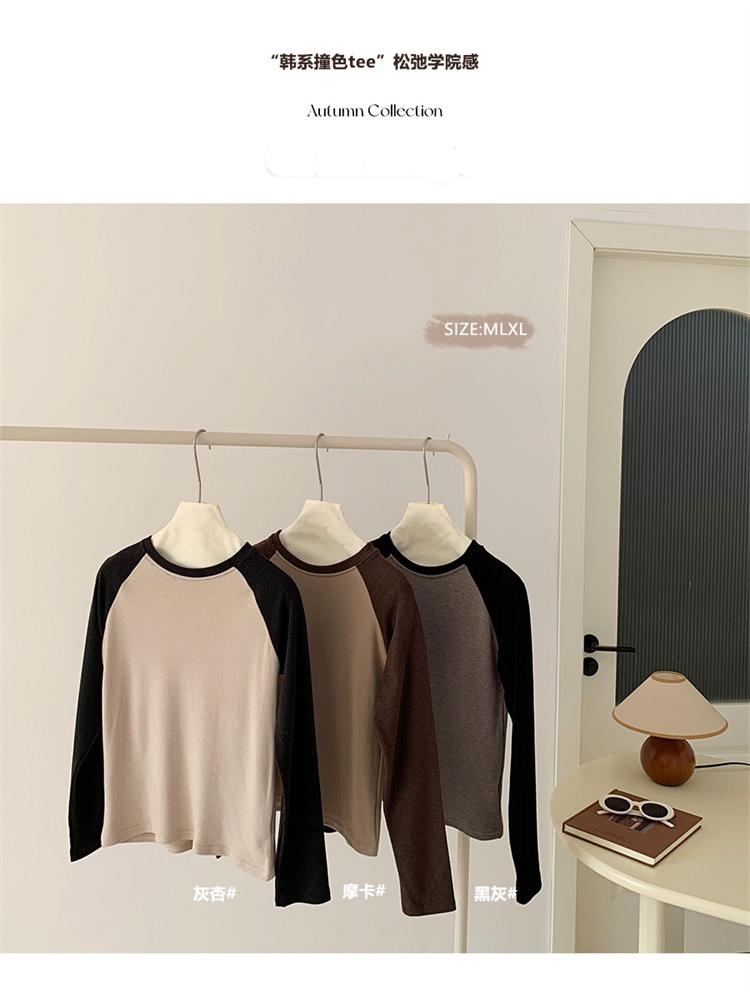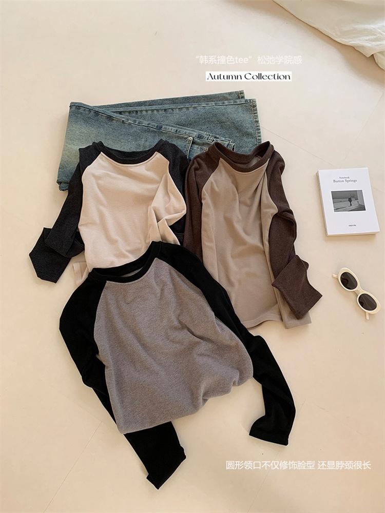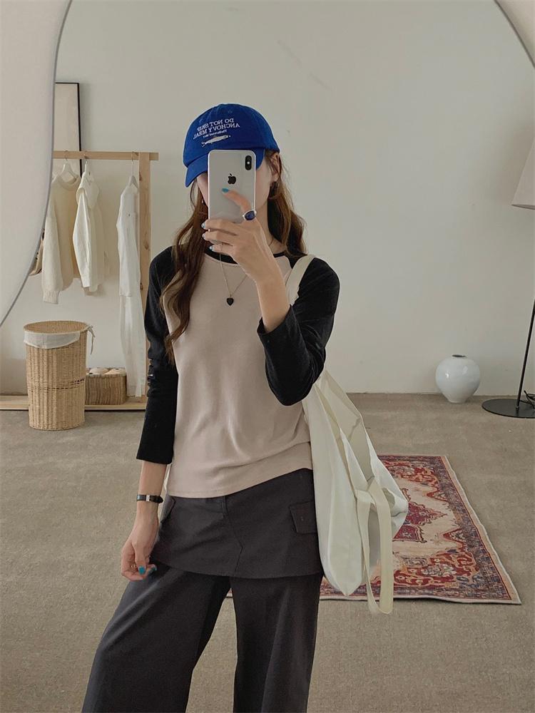 Camiseta Coreana de Cuello Redondo con Manga Raglán y Combinación de Colores para Mujer, Otoño e Invierno, Holgada, Adelgazante, Interior, Manga Larga, Camiseta Básica