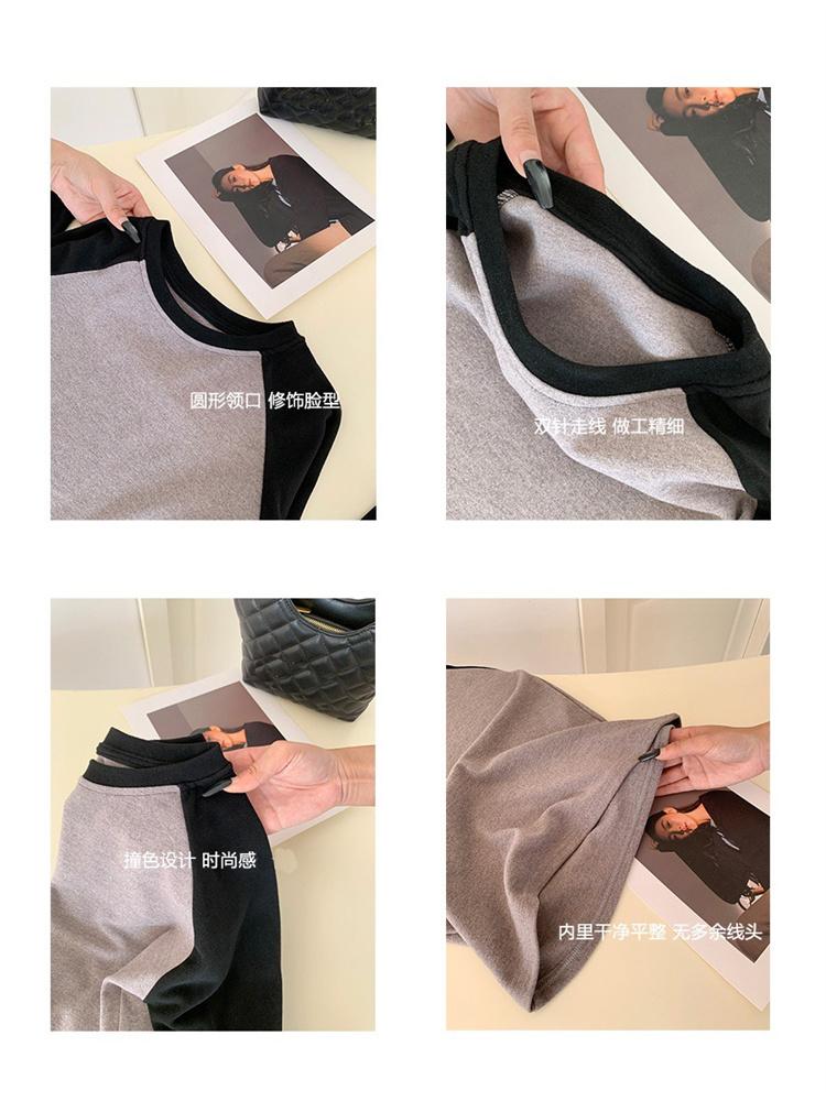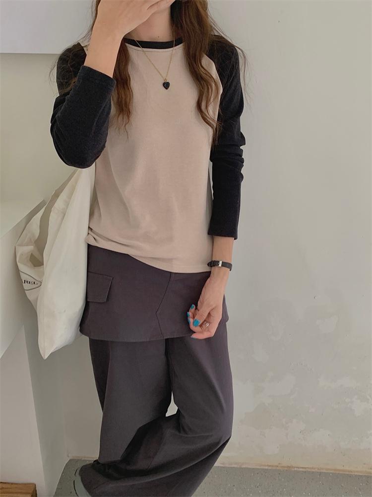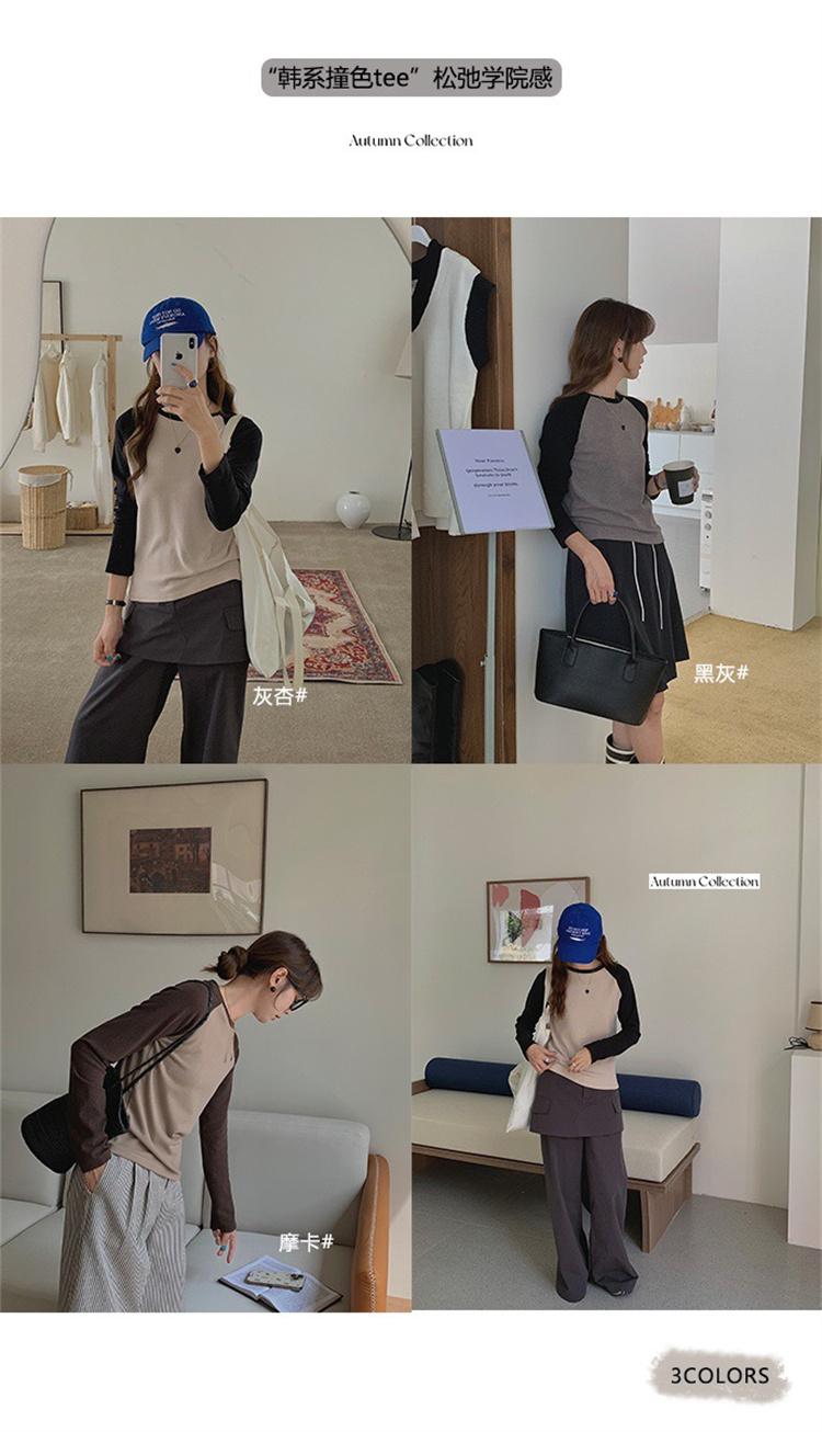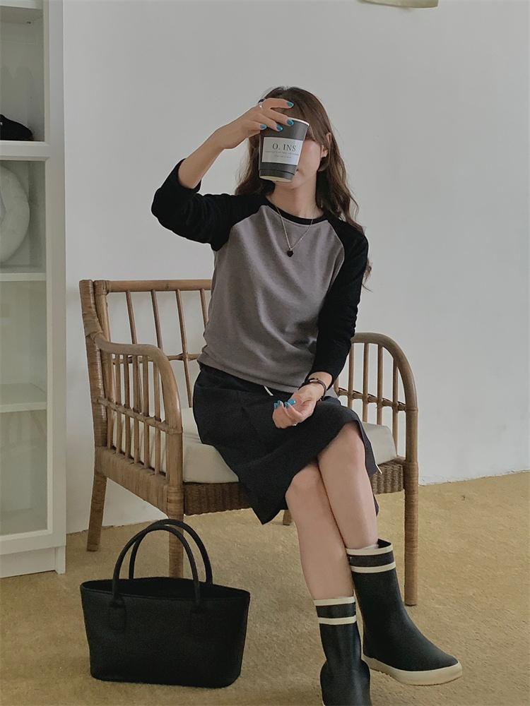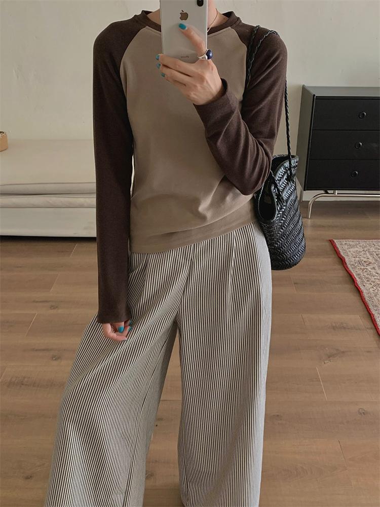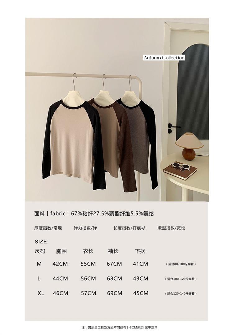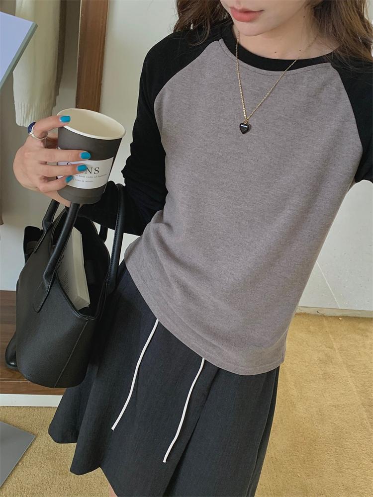 Camiseta Coreana de Cuello Redondo con Manga Raglán y Combinación de Colores para Mujer, Otoño e Invierno, Holgada, Adelgazante, Interior, Manga Larga, Camiseta Básica